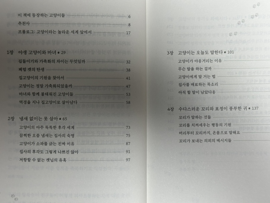 결국 고양이만이 모든 동물이 직면한 가장 어려운 문제를 해결해냈다. 그 문제는 사람과 친하게 지내면서도 사람과 완전히 독립적으로 사는 것이다.(책 중에서) 그렇다. 고양이는 반려동물로 많이 키우는 동물 중 하나이다. 그러나 고양이만큼 자기가 하고 싶은 거 다 하는 반려동물도 없다. 이런 부러운 종족 같으니.. 역시 이쁜게 다인가????? 이 책은 고양이에 대한 모든 것들을 알려준다. 만약 당신이 고양이와 함께 살고 싶은가? 그럼 이 책 부터 사서 읽어라. 진짜 도움이 엄청 많이 될꺼다. 책을 읽으면서 고양이에 대해 진짜 많이 알게 되었다. 왜 그렇게 행동하는지 그 행동이 무슨 뜻인지. 그리고 고양이에게 다가가려면 어떻게 해야하는지도 알게 되어 나한테는 너무 뜻깊은 시간이었다. 왜냐면 난 집 사면 집사가 될 예정이기 때문이지.?? 이 책 고이 모셔뒀다가 고양이를 키우기 전 다시 읽어봐야지.?? 고양이에 대해 알고 싶나요? 그럼 이 책이다냐옹 |