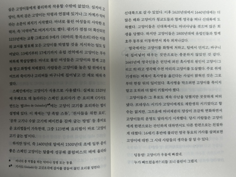 ‘더캣’이라는 제목의 SF 장르의 웹소설을 구상하고 있는데 그 소설 속 프롤로그에 고양이가 등장하는 장면을 넣으려다 보니 고양이의 생태가 궁금해졌다. 아직 그 웹소설은 구상 중이기만 한 터라 그사이 고양이의 생태를 그리고 있는 책들을 찾아보고 있었다. 그러다 타 출판사의 책이 종전까지 국내에서 번역 출간된 유일한 책인 걸 알게 됐는데 때마침 본서가 출간되었다. 기회다 싶어 서평단에 응모했고 다행스레 서평단으로 선정되어 본서를 읽을 기회를 가질 수 있었다. 고양이 집사 출신이 아닌 터라 본서를 통해 처음 알게 된 고양이의 특징이 적지 않았고 인간의 특징과 비교하는 대목들도 있어서 사이사이 인간의 생물로서의 입장도 돌아보는 기회이기도 했다. 본서는 표지부터 강렬한 고양이 사진인데 뿔이 난 고양이 사진 같은 이 사진이 본서를 읽고 나면 고양이가 사회적 교류를 허가하거나 허가받기 위한 표정이란 걸 알 수 있다. 본서는 정보 전달이 목적인 책이기도 하지만 상당히 에세이풍의 필체이기도 한데 고양이 연구로 박사학위를 받은 저자가 고양이에 대해서 잘 모르는 사람들을 위해 설명해 주는 듯한 분위기로 딱딱한 문체보다는 자상하고 자연스러운 대화와 같은 설명이라고 여겨지는 문체다. ‘우리는 고양이의 언어를 얼마나 이해하고 있을까? 또한 고양이는 우리의 언어를 얼마나 이해하고 있을까? 고양이는 우리를 어떻게 인식할까?’를 프롤로그에서 언급하는데 이게 본서의 색깔을 그대로 담고 있는 문장이 아닌가 싶다. 원제도 ‘고양이들의 숨겨진 언어’라는 의미이기에 본서를 통해 고양이를 이해하고 고양이의 시각에서 세상은 어떠할지 말해주고자 하는 게 저자의 집필 의도가 아니었나 싶다. 고양이의 생태에 대한 것이 본론이지만 첫 장에서는 현재 집고양이들의 기원을 찾기도 하고 이집트에서 신적 존재의 하나로 여겨지며 고양이를 해치면 사형이 선고되기도 했던 과거와 유럽으로 온 고양이들이 마녀사냥 당시 악마적 존재로 여겨지며 마녀들과 함께 화형당하던 역사까지 고양이 이야기가 익숙하지 않은 사람들에게는 낯설고 신기한 역사 이야기들이 이어진다. 고양잇과 야생동물들이 많이 가축화가 시도되기는 했으나 사냥을 위해 길들인 치타 역시도 번식을 시키는 게 난제가 되어 현재는 북아프리카 들고양이가 전 세계의 집고양이들의 선조가 되었을 뿐이라고 한다. 북아프라카에서 유럽으로 간 이 고양이들은 다시 유럽에서 배를 훔쳐 타고 선원들과 공생하며 미대륙까지 가게 된 거라는 게 저자의 설명이다. 한마디로 전 세계 고양이들의 선조는 북아프리카 들고양이라는 말인데 인간에 대해서도 아프리카 흑인이 모든 인종의 기원이라는 진화론적 시각과 전혀 다르지 않은 해석이기도 했다. 무엇보다 고양이의 생태가 그것도 일상에서의 습성이 궁금하던 내게 가장 인상 깊었던 건 알로그루밍과 알로러빙이었다. 서로의 털을 골라주는 다양한 동물들의 행태와 다르지 않은 알로그루밍과 자신의 체취와 상대 체취를 섞는 듯 몸을 부비는 알로러빙은 인간에서는 쓰다듬은 행동과 악수나 어깨동무와 크게 다르지 않아 보였다. 고양이는 혀에 돌기 같은 게 있어서 핥는 동작만으로 털을 고르게 할 수 있다. 또 몸의 곳곳과 뺨과 광대, 입술 주변에 분비선이 있어 왁스 물질 같은 게 나와서 타 대상에게 몸을 부비는 행동으로 자신의 체취를 전할 수 있다고 한다. 체취를 옮겨 자신과의 연결성을 갖게 하는 것이 알로러빙이라 여겨지기도 했다. (오랜만에 만날수록 알로러빙을 한다고 한다.)그리고 고양이는 선채로 꼬리를 들고 뒤로 소변을 뿜어 영역 표시를 하는데 이것은 자신의 영역을 나타내는 것이라 타 동물들의 침입을 막는 목적이기도 하지만, 수컷 고양이의 경우에는 소변에서 단백질 성분 중 일부가 진한 냄새를 띠게 하는데, 이것이 단백질로 이뤄지는 거라 해당 수컷 고양이가 사냥을 잘하는 고양이인지 어떤지의 정보도 전달되는 경향이 있다고 한다. 외부의 침입만을 막는 게 아니라 이성에게 어필하는 용도로 소변을 뿜는 것이기도 하다고 하니 동물의 세계에서 정보 전달법이 참 별나게도 보였다. 그리고 고양이를 키우는 사람에게는 흔하게 보는 경우이겠기에 책을 통해서가 아니더라도 익숙하겠지만 고양이는 사회친화적인 태도 말하자면 상대에게 악의가 없다는 걸 표시하기 위해 꼬리를 치켜들고 다가가기도 한다고 하니 사람이 멀리서 친한 사람을 마주쳤을 때 손을 들어 자신을 어필하는 것과 유사하다는 생각이 들기도 했다. 하지만 이렇게 꼬리를 치켜들고 다가가서는 냥이 펀치를 날리는 경우도 있는가 본데 악수를 청하는 척하다가 공격하는 미국 프로레슬링 방송 속의 프로레슬러들에게서도 엿볼 수 있는 경우가 아닌가 싶었다. 또 눈을 천천히 깜빡이다가 반쯤 게슴츠레 뜨는 동작은 고양이에게 안부를 묻는 방식이기도 하다고 한다. 이 책의 표지 사진 속 고양이의 눈과 같은 것이 아닌가 싶은데 새끼 고양이에게도 이와 같은 행동을 사람이 하면 고양이가 따라하기도 한다고 한다. 대체로 고양이들 사이에 마주쳐서 서로가 이러한 눈짓