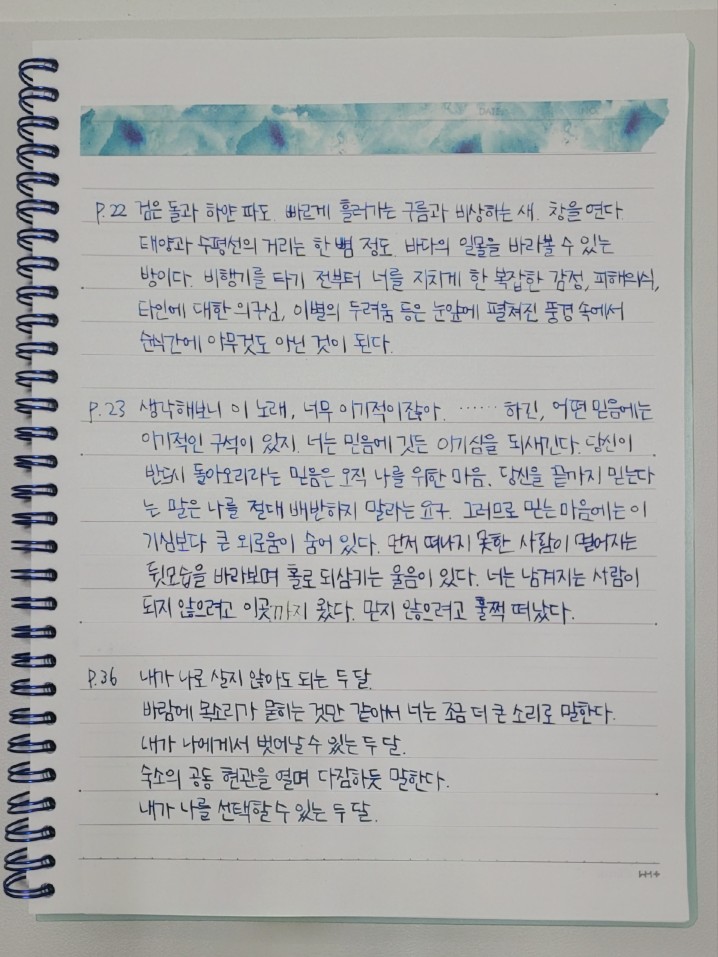 | 출퇴근길에 지하철에서 다 읽어버렸어요. 몰입도 높고 여운이 남는 문장들을 곱씹으며 봤습니다. 주인공의 심리는 뭘까 집중하다 보니 금새 읽었네요. 사랑을 할 때 내 안에서 일어나는 감정의 실체를 알아차리는 부분에서 공감이 많이 되었습니다. 제주도의 소금기 머금은 바람이 떠오르고, 이소라님의 믿음을 감상하는 재미도 있었습니당!🌊🌌 |