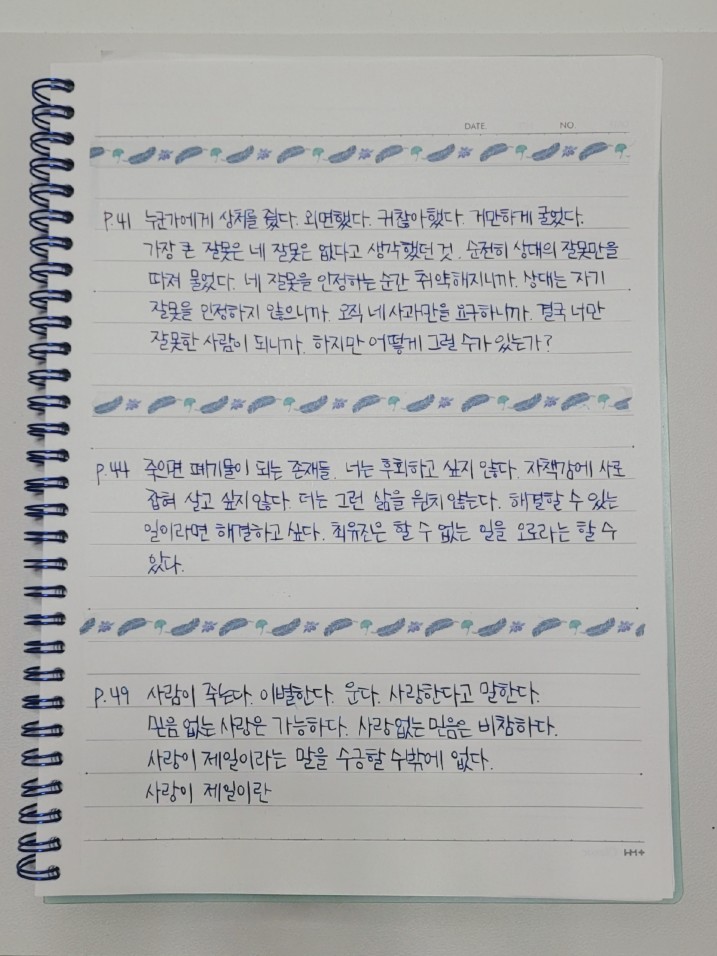 이 책은 처음에 너무 예쁜 책 표지에 끌렸다. 도서관에서 보자마자 읽고 싶은 마음이 생길 것이다. 그만큼 매력 있고 소장하고 싶은 마음이 생겨서 읽어보고 싶었는데, 생각보다 책 속 좋은 문장들이 많아서 유명한 책이었다. 그래서 고민하지 않고 읽게 되었다. 간단하게 줄거리를 설명하면 주인공이 사랑에 빠지게 되고 이별을 하게 되면서 그 이별을 감당하게 되고 그 과정들을 배우게 되는 내용을 짧게 담은 책이다. 생각이 깊은 주인공이 사랑과 믿음 사이에서 고민하고, 이별을 받아들이지 못하다가 점점 자신의 감정을 알게 되는 내용이 잘 드러나있다. 되게 흔한 소재라는 생각도 들었다. 그럼에도 나에게 이 책이 새롭게 다가온 건 오로지 주인공의 생각을 풀어내는 문장 속에서 새로움을 느낄 수 있었다. 우선 화자가 ‘나’가 아닌 ‘너’로 표현된다. 그래서 책을 읽는 나에게 너, 너라고 해서 나에게 이야기하는 것 같다고 느껴졌다. 그래서 ‘너’를 ‘나’로 바꾸어서 이해하면 더 쉽게 이해할 수 있지만 그마저도 이 책의 매력이라는 생각이 들었다. 나는 끝내 그렇게 쓴 이유를 찾지 못했지만 말이다. (ㅎㅎ) 그리고 책 읽으면서 가장 인상 깊었던 문장들을 소개하고 싶다. 내가 호기심을 느꼈던 포인트들 공유하고 싶다. “너는 네가 기억하는지도 모르면서 기억하는 것들을 모조리 꺼내보고 싶었다. 그것을 찬찬히 들여다보고 이어 붙이면 네 삶이 다르게 보이지 않을까. 그럼 너를 타인처럼 사랑할 여지가 생기지 않을까.” 망각 속에서, 지나가는 잔상 속 생각을 다 이어 붙이면 나를 타인처럼 사랑할 수 있을까 하며 고민에 빠진 주인공이 되게 안쓰러우면서도 나에게도 동시에 그 질문을 던지는 것 같은 어투가 되게 신선했던 문장이고, “어떤 믿음에는 이기적인 구석이있지. 너는 믿음에 깃든 이기심을 되새긴다. 당신이 반드시 돌아오리라는 믿음은 오직 나를 위한 마음. 당신을 끝까지 믿는다는 말은 나를 절대 배반하지 말라는 요구. 그러므로 믿는 마음에는 이기심보다 큰 외로움이 숨어 있다.“ 마음을 구체적으로 묘사하면서 믿음이라는 것을 아주 세심하게 들여다보면서 이미 떠나간 상대에게 기다림을 요구하고 있는 상황이 되게 묘한 감정선을 이끌어냈다. 솔직히 이 문장들만 봐도 100쪽이 채 안되는 책을 읽은 가치는 크다는 걸 느꼈으면 좋겠다. 마지막 작가의 말도 정말 좋으니, 끝까지 읽는 걸 너무나도 추천한다. 참고로 2번 빌려읽고 소장한 책이다ㅎ..ㅎ |