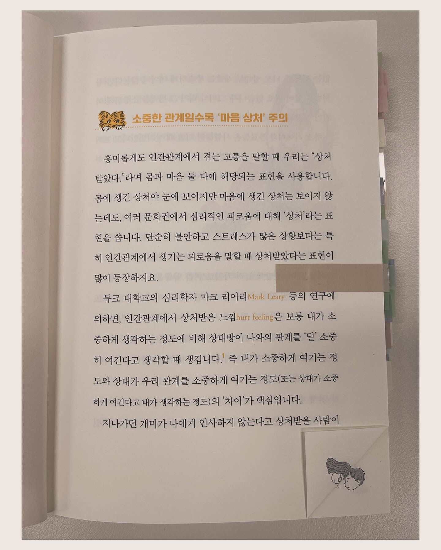내가 생각하는 나와 타인의 정체성은 대부분 내 머릿속에서 만든 작은 서랍에 지나지 않습니다. p55 진정한 도덕성은 도덕적으로 올바른 말을 입에 담는 것보다 현실에서 어떤 어려움이 닥쳐와도 도덕적인 행동을 실제로 행하는 것 p73 완벽주의적인 사람들은 그렇지 않은 사람들에 비해 주변사람들의 시선을 더 의식하고 인정 받고자 히는 욕구도 높습니다. p103 우리는 감정을 공유함으로써 서로에게 더 깊이 연결되는 경험을 하게 되고 만족감을 느끼기도 합니다. p121 행동의 원인은 그 사람의 내적 특성 즉 성격 태도 일반적인 기분 상태에서 찾는 것을 내적 귀인 이라고 합니다. p132 자랑하지 않아야 행복하다. ??나는 나를 지킵니다는 나를 비키면서 타안을 헤치짖않는 선긋기를 설명하고 있다. 적장히 나를 들어내기 적당히 나를 표혐하기 적당히 나에대해 알리며 다가가기.....이렇게 내가 선해보지 않으며 상처받지 않고 타이 사이에 스며드는 법을 설명하고 있다. 적당히라는 표현은 이 책에 있는건 아니고 읽고난 지극히 내 주관적인 견해의 표현이니 오해가 없으시길....가까움 사람사이의 적당함 매너...곧 가족이 떠오른다. 의무와 책암감에 대함 고뇌와 고민이 돌출되고 부모로써 부부로써 자식으로써의 고민들이 이 책의 구절구절 예시마다 투영되서 해답을 찾으려고 하고 있다. 고민 많은 밤...책을 덮으며 휘둘리지 않고 상처받지 않고 서로의 경계를 잘 지키는 법에 대해 탐닉중이다.