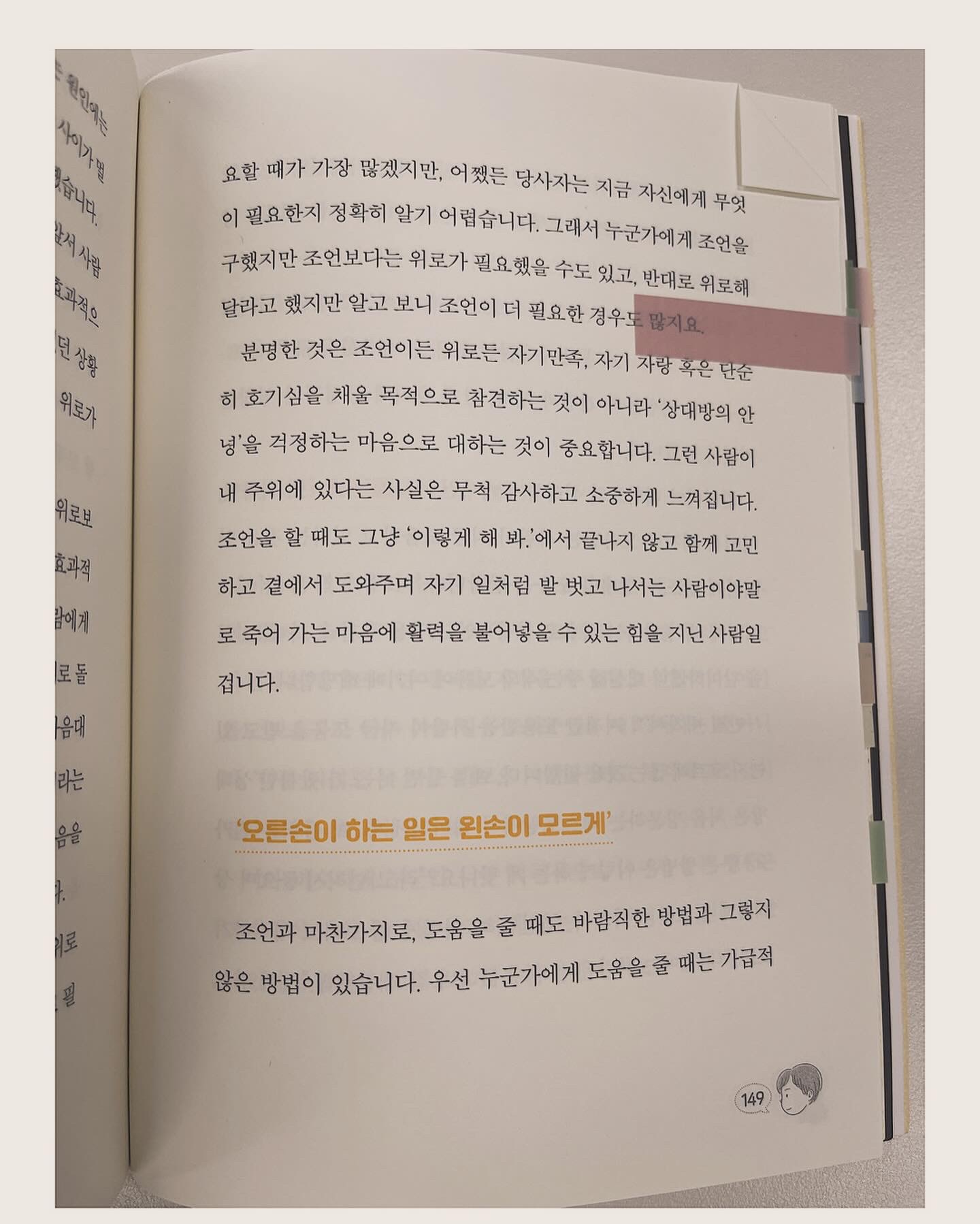 ![]() ![]() ?? 서평단 책 리뷰 ??[ 나는 나를 지킵니다 ] ?? 저자 - 박진영 ?? 일러스트 - 안난초 ?? 출판 - 우리학교 “휘둘리지 않고 서로의 경계를 지키는 법” ?? 나는 사람들에게 싫은 소리를 잘 못하는 편이다. 차라리 내가 손해를 보더라도 너가 원하는데로 해‘라고 하는 경우들이 종종있다. 나는 나를 지키고 있는 것일까? 그게 정말 나를 위한 것일까? 이제라도 나를 지키고 싶은데, 나를 지키는 방법은 뭐가 있을까? ?? 차례 ?? 파트1. 서로의 경계를 존중하는 관계 가꾸기 파트2. 해로운 관계를 거절하세요 파트3. 나는 왜 타인에게 휘둘릴까? 파트4. 우리가 정말 친해질 수 있을까? 파트5. 나를 지키며 좋은 친구가 되는법 ?? 이렇게 서로가 다르기 때문에 타인과의 관계에서 더더욱 필요한 최소한의 원칙이 ‘존중’이라는 점을 꼭 기억해야 합니다. 관계를 통해 내가 나의 필요와 욕구를 채우길 바라듯 타인 역시 그렇습니다. 서로가 바라는 바를 존중하고 함부로 서로의 선을 넘지 않는 배려가 있어야만 나도 상대도 만족하는 관계를 맺을 수 있다는 사실을 잊지 마세요. ?? 너무나 당연해서 잊을 뻔한 존중하기, 상대도 원하는 바가 있는데 나만의 욕구만 채우길 바라고 있던건 아닌지 생각해본다. 서로의 선을 넘지 않는 배려를 항상 잊지 말자. ?? 진정한 도덕성은 도덕적으로 올바른 말을 입에 담는 것보다, 현실 에서 어떤 어려움이 닥쳐와도 도덕적인 행동을 실제로 행하는 것을 말합니다. 당장은 사소한 것처럼 보여도 폭력이나 불의는 가만히 두면 눈덩이처럼 불어나기 때문에 작은 괴롭힘도 적극적으로 알리고 대응 하는 습관을 길러야 합니다. ?? 모른체 하거나 물러서지 않기, 사실 지금도 불의를 보면 못 참는 성격이라(어쩌면 오지랖이 넓은 걸수도 있음><) 타인이나 약자가 괴롭힘을 당하거나 불합리한 상황에 처했을때 발벗고 나서는 편이다. 요즘은 조금 사회가 무서워서(?) 무자비한(?) 사람들이 많기 때문에 그런 상황이 발생 했을때 혼자 도와주려 하지 말고 주변에 있는 사람 들과 함께 문제를 해결해 나가는 것도 좋은 방법중 하나일 것 같다. ?? 결국 내 마음이 이렇게 쉬운 판단으로 기울고 있을 때 ‘잠깐! 이게 아닐 수도 있어. 또 다른 가능성도 있을 거야.’라며 생각의 운전대를 잡고 방향을 트는 노력을 기울여야 타인에 대해 좀 더 세심한 해석을 내릴 수 있습니다. 상대방을 긍정적으로 바라보면 나도 기분이 좋지만 상대방 또한 나의 세심함을 반기며 실제로 더 좋은 사람이 되려고 노력 하게 됩니다. ?? 상대방을 긍정적으로 바라보기. 상대방의 몇가지 행동만 보고 그사람은 이런 사람일거야 라고 단정지으면 상대방에 대한 오해를 쌓아가는 행동이라고 말하고 있다. 그게 아닐수도 있어!, 다른 가능 성도 있어라는 생각으로 노력을 기울려 상대방을 긍정적으로 바라 보도로고 노력해 봐야겠다. ?? 새가 하늘을 날고 물고기가 헤엄을 치는 것처럼 인간이 사랑하고 사랑을 갈구하는 것은 자연스러운 일입니다. 이런 관점에서 볼 때 상대 를 이해하려는 노력을 멈추는 것은 사랑하기를 멈추는 것과 같을지도 모르겠습니다. 나는 나를 사랑합니다. 그리고 여러분을 사랑합니다. 이 서평은 북키두키(@bookkey_dokey )님의 서평단 모집에서 서평단으로 선정되어 우리학교 출판으로부터(@woorischool ) 도서를 제공받아 작성하였습니다. 서평단으로 선정해 주셔서 감사합니다. #일상 #기록 #서평단 #책리뷰 #나는나를지킵니다 #휘둘리지않고서로의경계를지키는법 #박진영 #우리학교 #도서제공 #적극추천 #북스타그램 #책스타그램 #독서하는가영 |