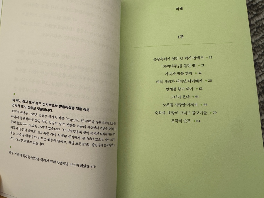 요즘 사람들과의 관계에 생각을 많이 했더니 작가의 시원시원한 표현들이 와닿고 좋았다. 적당히 치고 빠질줄 아는 센스도. 정말 훤칠했다. 나를 위한 능동적이고 적극적인 삶의 태도도 배워가야지. 어쩌면 무얼 해야하는지 알지만 실천하지 않고 있던게 들킨것 같은 기분. 그리고 내가 생각한 잣대를 남에게 들이밀지 말 것. 시력을 잃을거라는 것을 엄마가 알았을때 어떻게든 고칠 수 있다는 인정하지 않고 싶은 마음이 느껴져 눈물이 또르르 흐르는데 엄마와 작가가 대화할때면 만담 콤비 같은게 또 웃음이 피식 새어나오고. 지쳐있던 마음이 책에 기대어 위로 받은 기분이다. 차례에 앞서 책 표지에 대한 설명이 덧붙여있다. 표지 설명을 읽고 난 후 다시 한번 표지를 보았다. 여러모로 이 책이 좋다. |