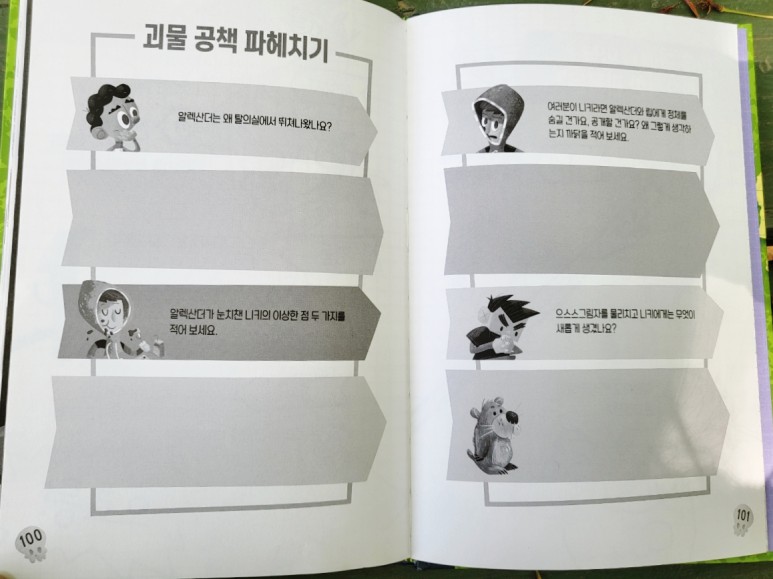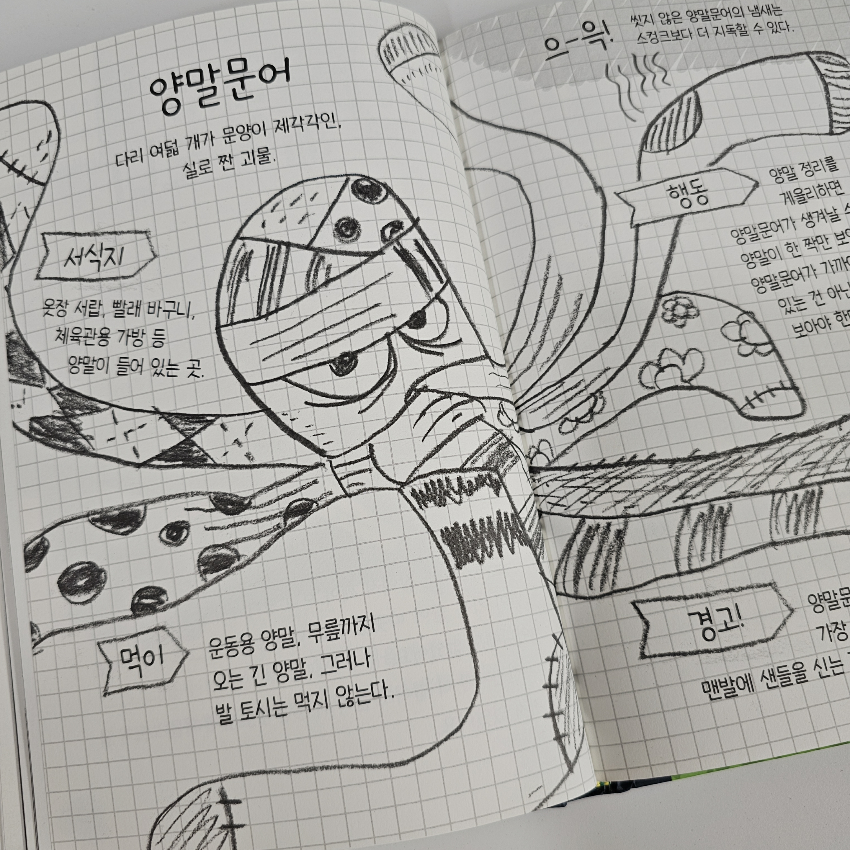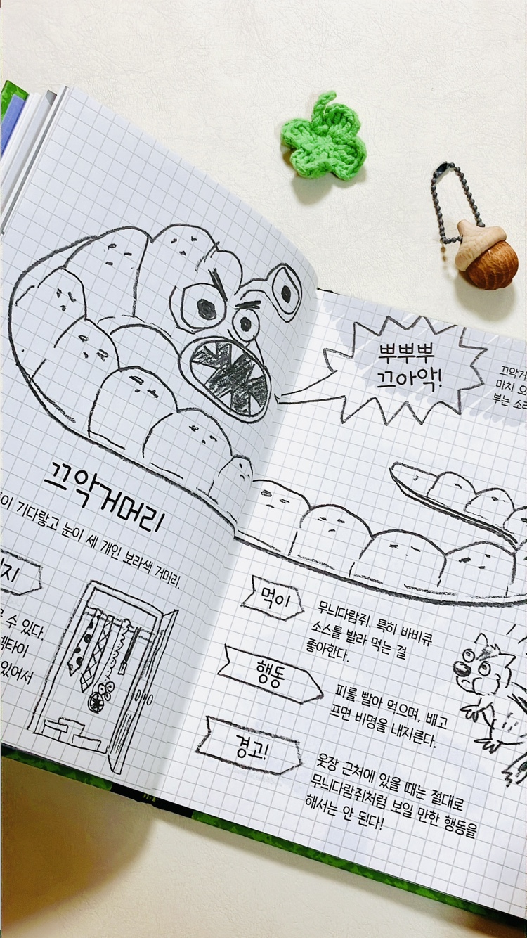 그런데 슈. 초. 괴. 특. 대원인 니키가 이상한 행동을 보이는데요 니키는 어둠 속에서도 앞을 볼 수 있고, 햇빛을 5초만 받아도 살이 탄다는 잼파이어라고 하는데 슈. 초. 괴. 특. 대원들은 니키를 내쫓으려고 했답니다. 으스스 그림자 괴물과 땅다람쥐 날이 어떤 관계 일지 궁금해지는데요 어린이들의 엉뚱한 추측과 상상력으로 읽는 재미가 더해가는데요 슈. 초. 괴. 특. 대원들의 아이다운 이야기가 펼쳐지는 <경고! 절대 열면 안 되는 공포의 노트 3>은 책 읽기 독립을 시작한 아이들에게 이야기의 재미를 주면서 상상력과 추리력을 높일 수 있는 흥미로운 책이었어요. 으스스한 그림자 괴물과의 한바탕 소동. 한밤중에 만난다면 어떨까라는 상상을 하게 되면서 아이들에게 설렘과 공포(?)를 선물로 줄 수 있는 시간이 될 거 같아요. 덧. 책 마지막 페이지에 독후 활동을 할 수 있는 '괴물 공책 파헤치기'코너가 있어 책을 읽고 난 다음 사실적 질문과 이해적 질문을 할 수 있어서 좋았답니다.