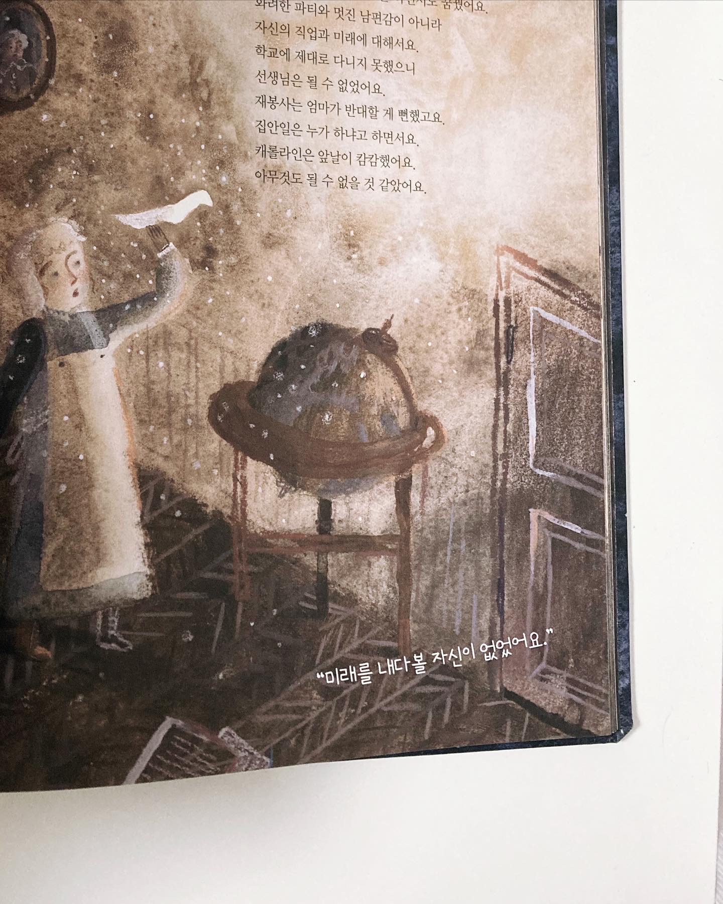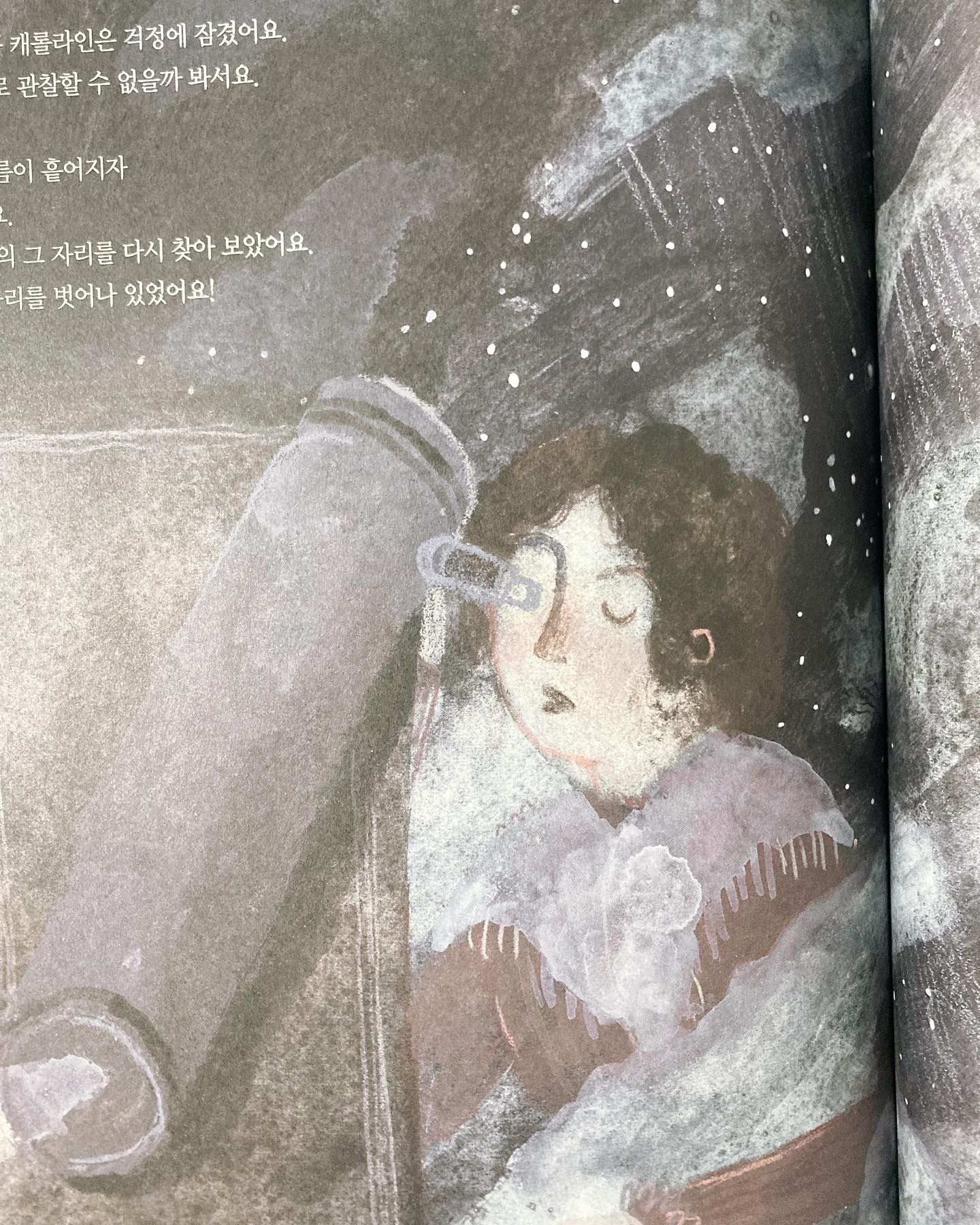 오늘의 그림책 - 나만의 그림책큐레이션 334일 #책선물?? #도서협찬?? ?? 한밤의 혜성 사냥꾼 ?? 글 - #파멜라S터너 ?? 그림 - #비비언밀덴버거 ?? 옮김 - #길상효 ?? 출판사 - #씨드북 표지에는 한 여자가 검정색 드레스에 빤짝이는?? 별처럼 보이는 무늬의 옷을 입고 밤하늘의 무언가 떨어지는 것을 가르키고 있다. 밤하늘에 떨어지는건 무엇일까??? 아득한 우주윽 추위가 독일 하노버의 자갈길의 내려앉은 맑은 겨울밤이었다.?? 아빠는 황소자리, 안드로메다자리, 카시오페이아자리 같은 별자리를?? 보여주었다. 아빠는 우주에?? 푹 빠진 사람이었다. 아는 것도 제법 많았다. 캐롤라인은 아빠와 특별한 순간을 가진 적이 거의 없다.???♀? 항상 오빠들에게 음악을 가르치고 공부를시켰다. 여자가 공부는 해서 뭣 하느냐며 캐롤라인을 집에?? 눌러 앉혔다. 캐롤라인은 어릴 때 앓은 병으로 얼굴에 흉터가 남아 있어 엄마는 캐롤라인이 결혼도 못 할 거라며 집안을 시키며 하녀처럼 부렸다. ?? 이 장면 너무나 씁쓸했다. 왜 여자는 공부를 하면 안되는 것일까? 왜 여자는 집안 일을 하는 사람으로만 생각했을까? 캐롤라인은 집안 일을 하느라 바빴지만 불꽃 같은 작은 희망을?? 놓치치 않았다. 캐롤라인은 틈틈이 아빠가 가르치는 방에 살며시 들어가기도 하고 잠자리에서도 아빠와 오빠들의 대화에 귀를?? 기울였다. 아빠는 세상을 떠나고 친했던 오빠마저 음악을?? 하러 영국에 가 있을 때 캐롤라인에게는 빛이라고는 남아 있지 않았다. 캐롤라인은 청소를?? 하면서도 꿈꿨다. 화려한 파티와 남편감이 아니라 자신의 직업과 미래에 대해서... 하지만 ?? 캐롤라인은 앞날이 깜깜했고?? 아무것도 될 수 없을 것 같았어요. 미래를 내다 볼 자신이 없었다.???♀? ?? 삶은 미래를 알 수 없어 불안하지도 하지만 때론 뜻하지 않은 기회들도 온다. 영국에서 공부를 하는 윌리엄 오빠에게서 편지가?? 왔다. 내용은 공부하느라 너무 바빠 캐롤라인이 도와주었으면 좋겠다는 내용이였지만 엄마는 안된다고 했다. 하지만 윌리엄은 포기하지 않고 엄마를 설득했고 드디어 ?? 캐롤라인은 오빠가 있는 영국????으로 가게되었다. 캐롤라인의 삶은 어떻게 되었을까??? ?? 캐롤라인의 삶을 보면서 마음에 꿈이 간절하다면 언젠가는 반드시 이루워진다 라는 생각이 들었다. 영국에 도착한 캐롤라인은 윌리엄 오빠의 도움으로 새로운 삶을 살게 되었다.?? ?? 내 곁에 한 사람만 나를 진정을 믿어주고 지지해준다면 못 할 것이 없다는 걸 캐롤라인의 삶을 통해 배울 수 있었다. 캐롤라인은 공부, 음악, 수학, 과학까지 배웠다.?? 저녁이면 별을 보던 남매는 옛 추억을 떠올리기도 했다. 그리고 둘은 두 사람이 직접 망원경을 만들었고?? 천왕성 이라고 불릴 행성을 찾기도 했다. 오빠는 천문계의 스타 되었고 캐롤라인은 하늘을 보며 매일같이 행성을 찾았고 드디어 혜성을?? 찾게되었다. ?? 캐롤라인은 여성 최초로 직업 천문학자가 되었다. ?? 이 그림책은 인물그림책으로 캐롤라인의 삶을 엿보며 꿈을 꾸며 도전 할 수 있는 용기가 생기는 것 같다. ?? 이 그림책은 초등학생부터 어른까지 읽어보길 추천한다. @seedbook_publisher @lael_84 #씨드북출판사 로부터 도서협찬을 받아 서평을 작성하였습니다. 감사합니다. #1일2그림책 #신간그림책 #그림책추천 #그림책테라피스트 #그림책스타그램 #한밤의혜성사냥꾼 #천왕성을공동발견한캐롤라인허셜 #천왕성 #마음약처방 |