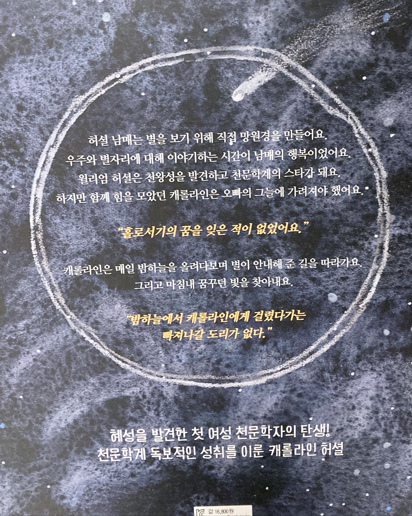 18세기 천문학자 캐롤라인 허셜의 일생을 그린 그림책 부제는 "천왕성을 공동 발견한 캐롤라인 허셜"입니다 "아빠는 우주에 푹 빠진 사람이었어요. 아는 것도 제법 많았고요..." "엄마는 어린 나에게 모질게 굴었어요." "미래를 내다볼 자신이 없었어요." "우주와 별자리에 대해 이야기하는 시간이 우리에게는 휴식 같았어요." "남들에게는 골치아플지 몰라도 나는 그 일이 재밌기만 하던걸요." "해도 해도 끝이 없었어요. 온몸이 으스러질 것 같았어요." "홀로서기의 꿈을 잊은 적이 없었어요." "어쩌다 구름이나 달빛 때문에 관측이 어려운 밤이 아니고서는 잠잘 시간도 없었어요." "빛나는 모든 것을 바라보라." 여성이 학교에 다닐 수 없고, 직업을 가질 수 없던 시대에 자신이 하고 싶은 일을 포기하지 않았던 진취적인 캐롤라인 허셜 캐롤라인은 오빠인 윌리엄 허셜과 함께 천왕성을 발견하고 혜성을 발견한 최초의 여성 천문학자로, 여성의 역할이 제한된 시대에 불구하고 뛰어난 천문학적 성취를 이루었어요 이 책에서는 캐롤라인의 열정과 끈기를 통해 여성의 과학적 성취를 조명하며, 그녀의 이야기를 통해 아이들에게 꿈과 희망을 심어주고 있어요 소녀들의 가슴에 미래에 대한 큰 꿈을 심어줄, 아주 좋은 책이라고 생각합니다 캐롤라인의 별에 대한 사랑을 따라가며 울컥한 부분도 많았어요. 끝까지 포기하지 않아줘서 고마워요. 캐롤라인 허셜 |
