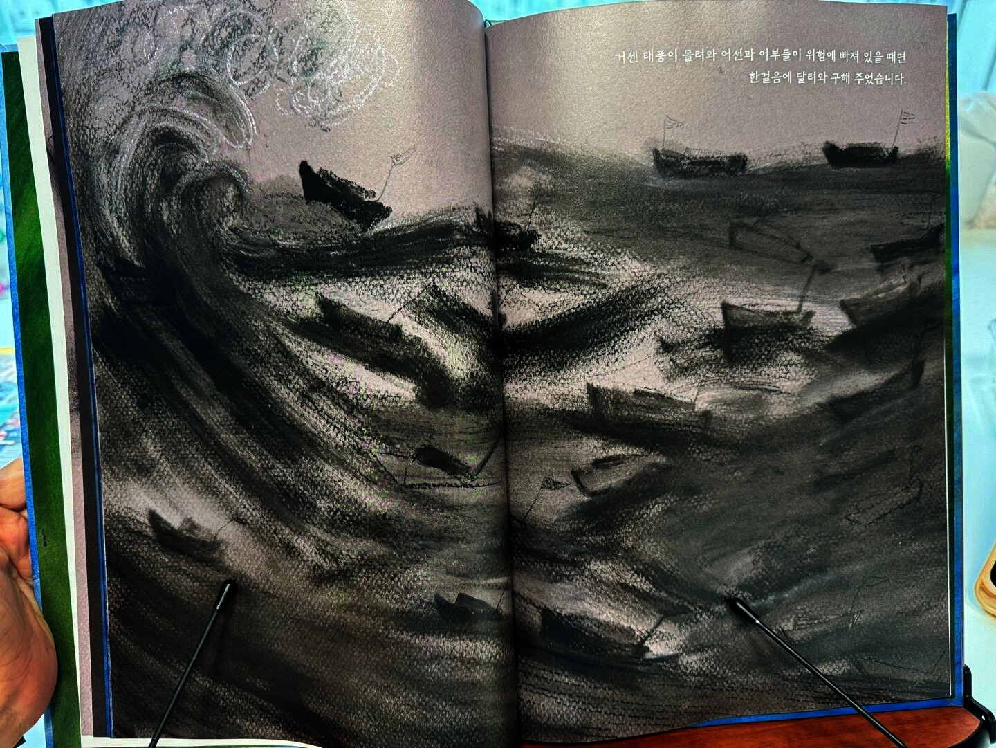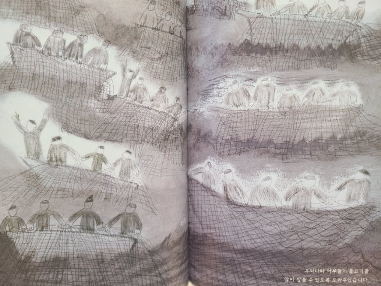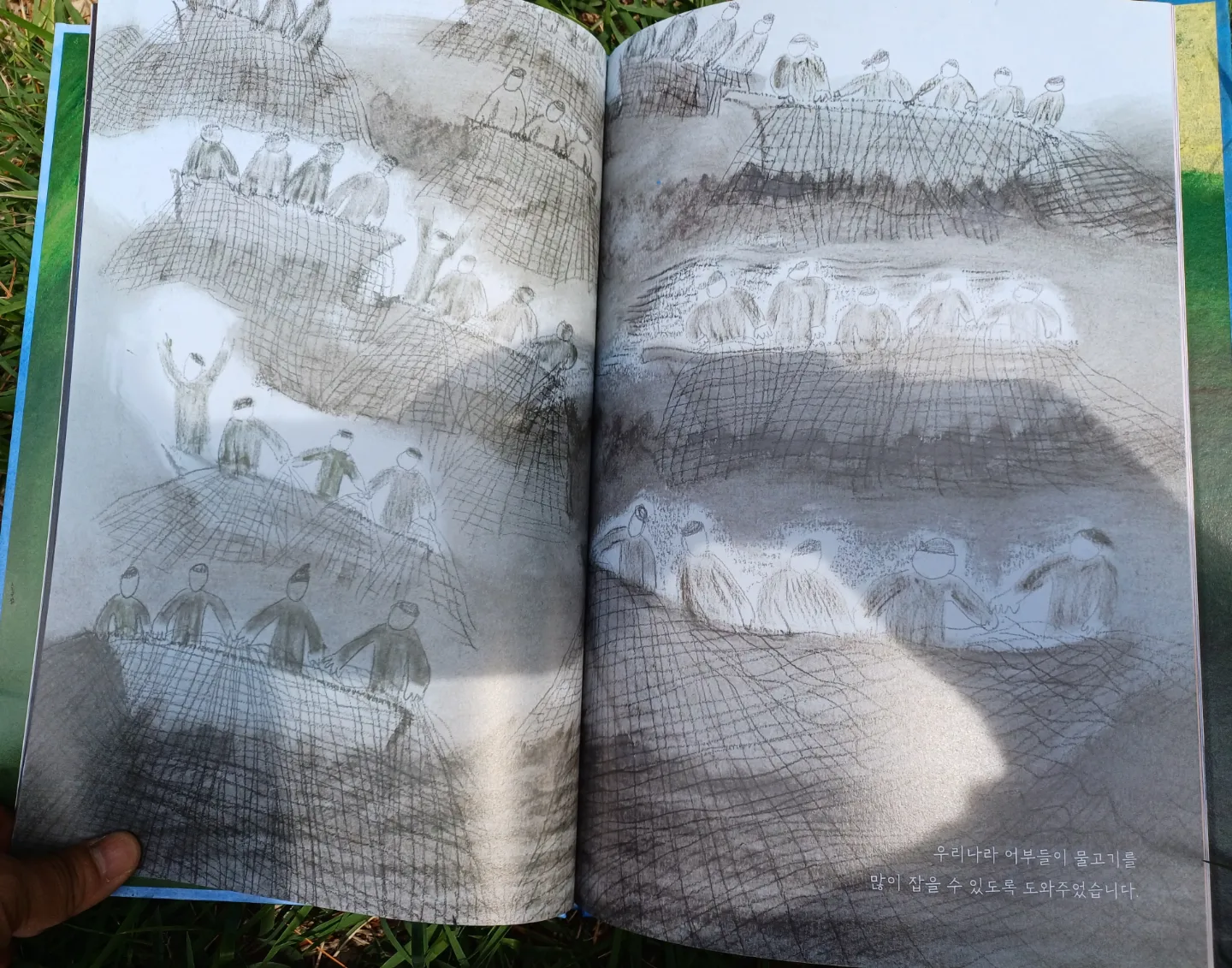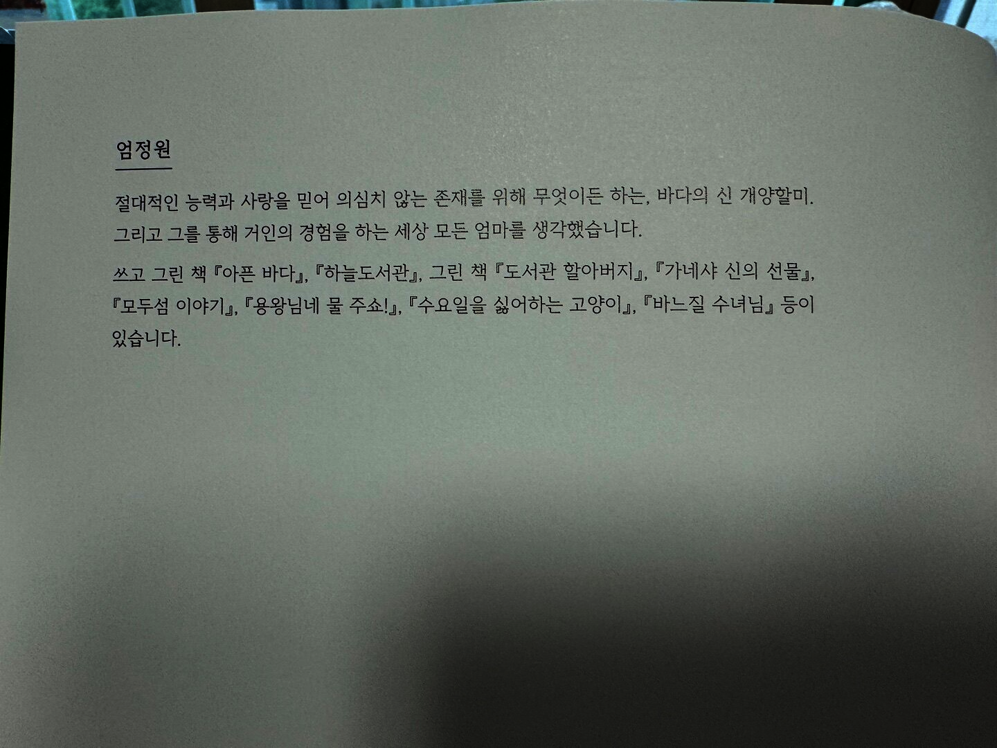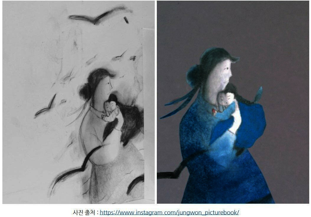 절대적인 능력과 사랑을 믿어 의심치 않는 존재를 위해 무엇이든 하는, 바다의 신 개양할미. 그리고 그를 통해 거인의 경험을 하는 세상 모든 엄마를 생각했습니다. - <바다의 신 개양할미> 작가 소개 내용 엄정원 작가님의 SNS에 있는 2023년 10월 스케치와 2024년 4월 완성된 장면이지요. 엄정원 작가님의 소개 글이 책마다 달라서 꼬옥 읽어보게 되네요. 엄정원 작가님 SNS : https://www.instagram.com/jungwon_picturebook/ - 엄정원 작가님의 그림책 -
