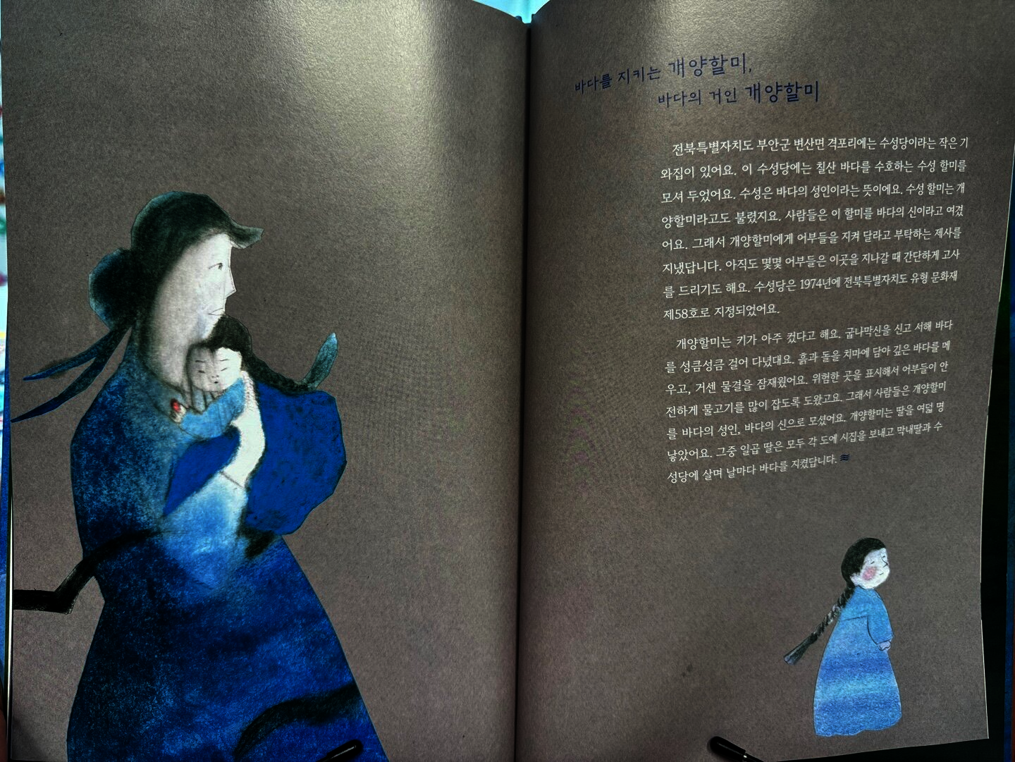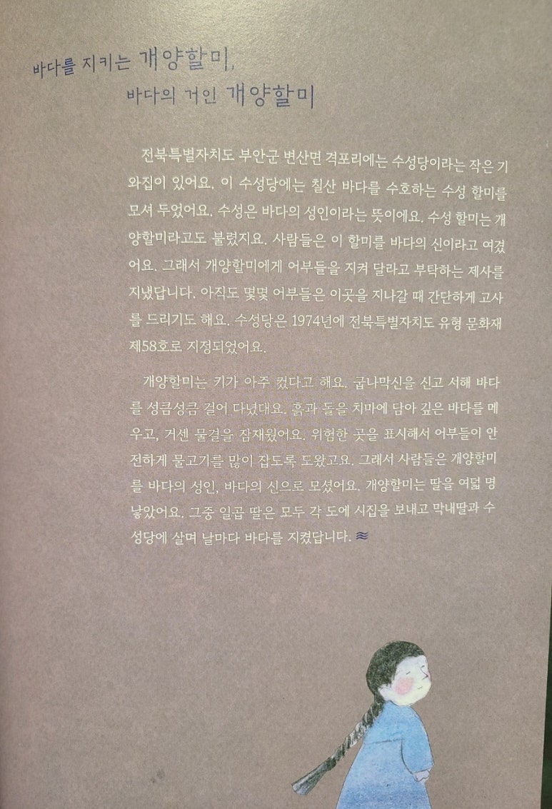 전북 부안군 변산면 격포리에 '수성당'이라는 작은 기와집이 있는데, 이곳에서 개양할미를 모시고 있다고 해요. 아이와 함께 부안을 여행할 기회가 생긴다면 꼭 한 번 들러보고 싶다는 생각이 들었습니다.