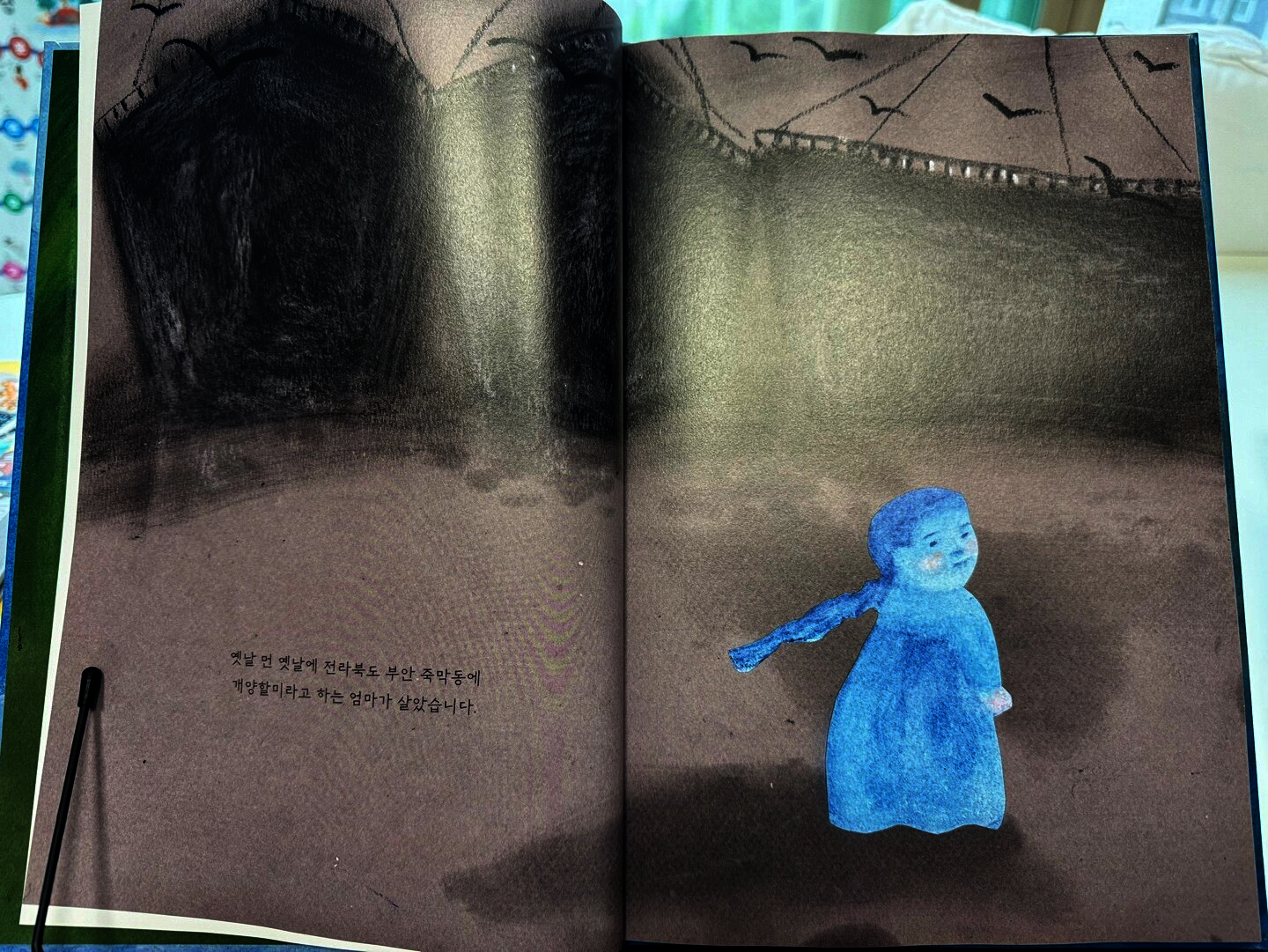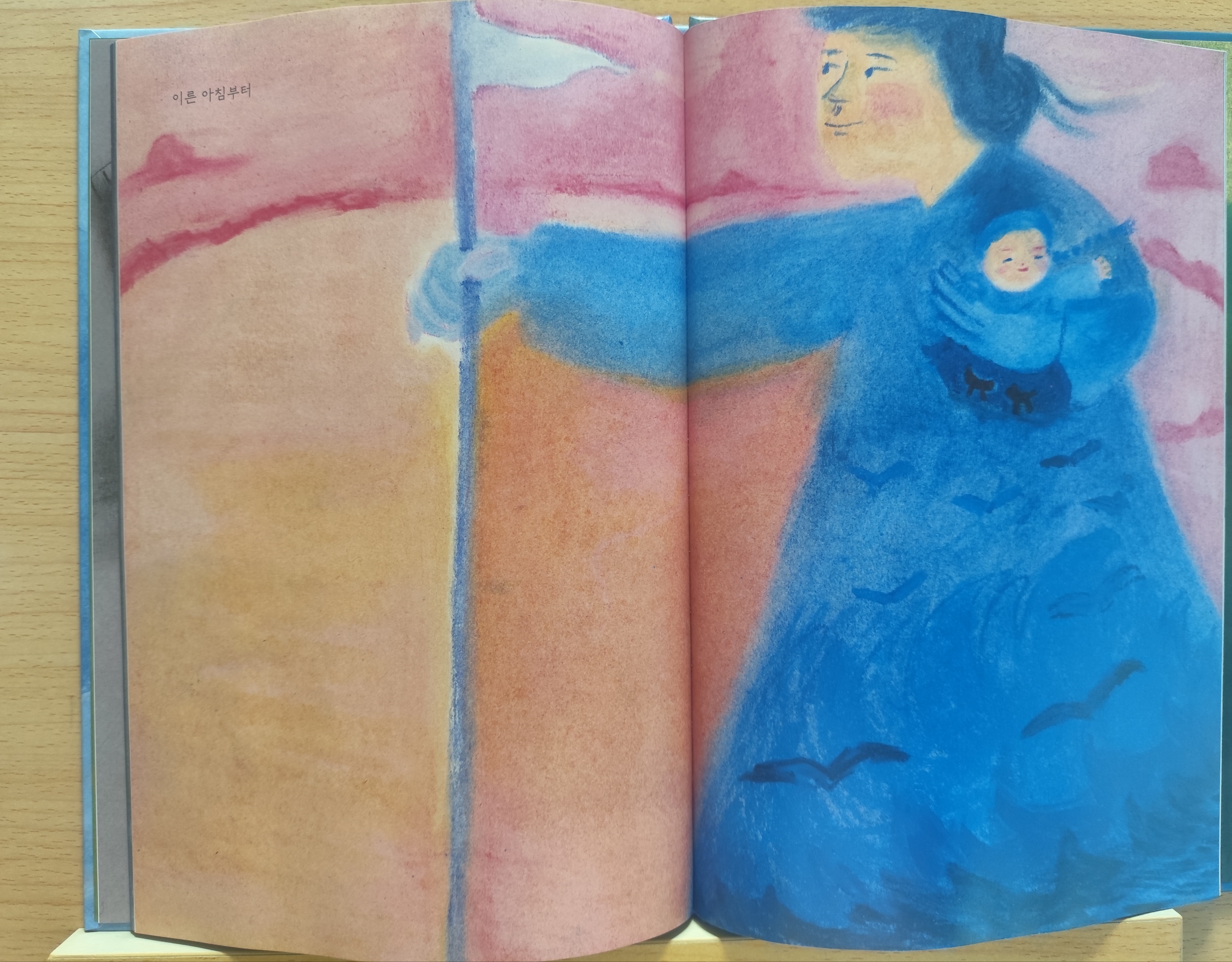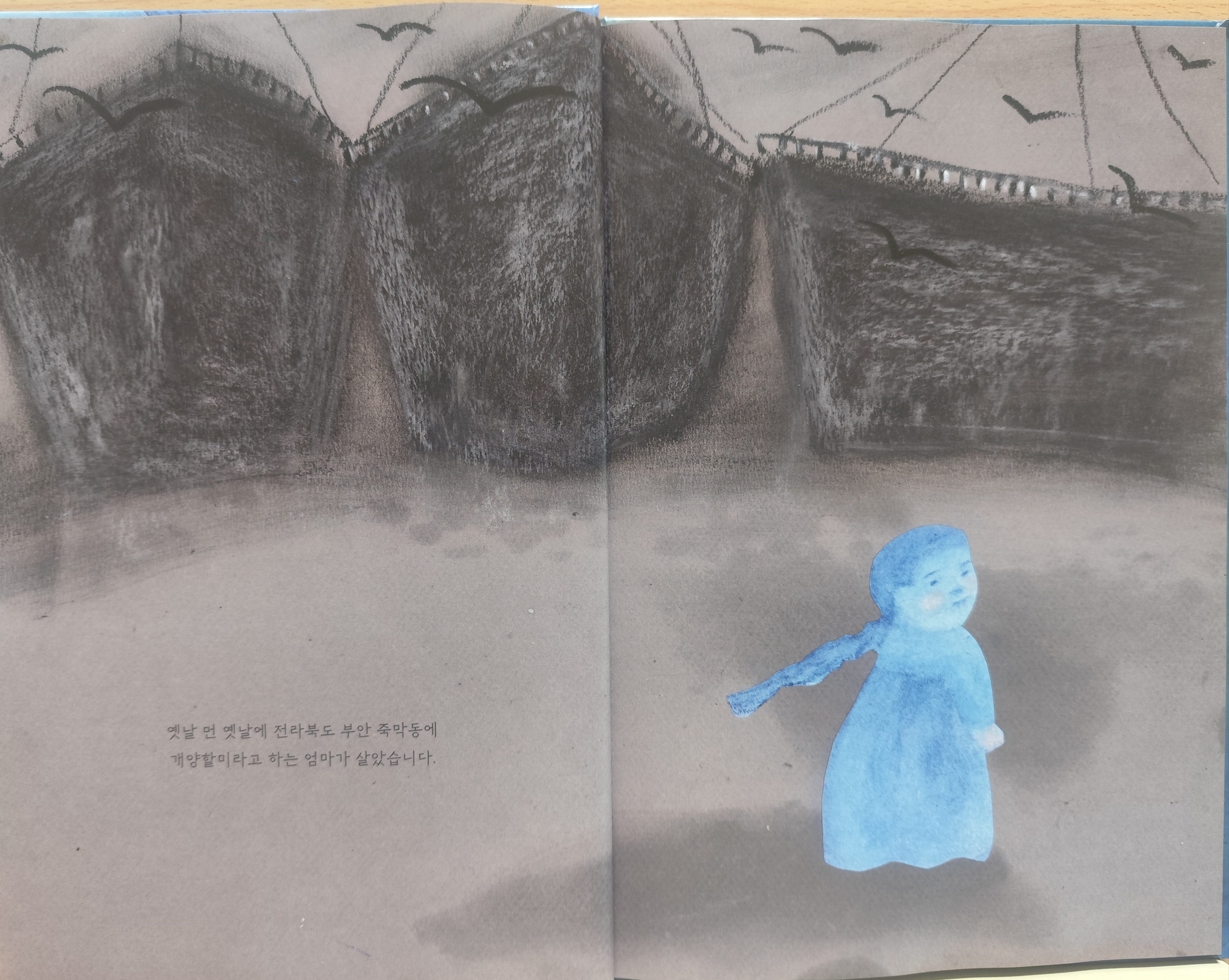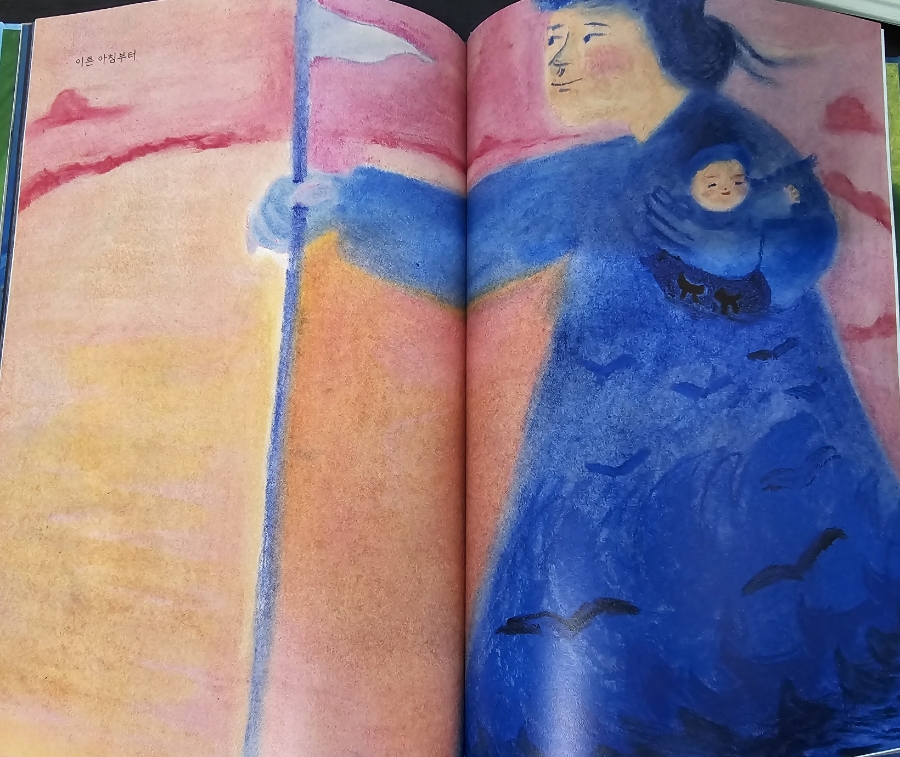 그림책을 읽기 전 엄정원 작가님의 책이라는 궁금증도... 설화라는 주제가 궁금해지는 책이기도... 하늘빛의 바다 색감이 궁금하기도 했던 그림책으로 들어가 보아요. 그림책 읽기
