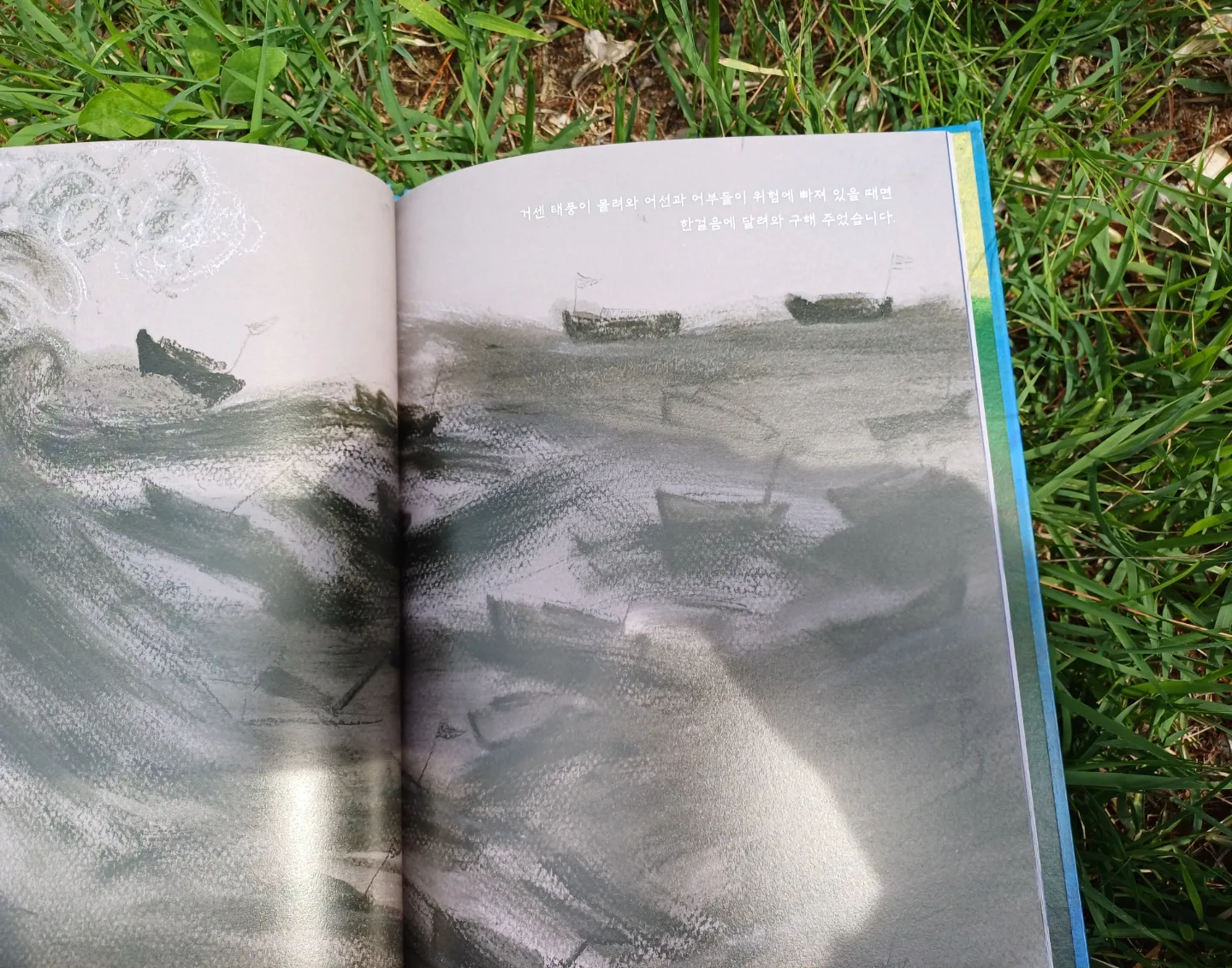 옛날 먼 옛날에 전라북도 부안 죽막동에 개양할미라고 하는 엄마가 살았습니다. 커다란 배들이 성벽처럼 서있는 해안가에 파란 작은 여자아이가 보입니다. 머리를 길게 땋아내리고 한복을 입은 아이가 고개를 돌려 우리를 바라보며 이야기를 들려주는 것 같습니다. 아이의 엄마는 세상에서 두 번째라면 서러울 만큼 키가 크고 힘이 센 엄마였습니다. 엄마는 아이를 한 손에 번쩍 들고 바다 위를 걸어 다니며 위험한 곳에 깃발을 꽂아 어부들이 안전하게 일하도록 표시해 두었습니다. 육지에서 흙을 옮겨 와서 깊은 바다를 메꾸는 일도 했습니다. 유난히 물살이 거센 곳은 큰 바위로 막아 물살을 잠재우기도 했습니다. 개양할미는 전북특별자치도 부안군 변산면 격포리에 있는 수성당에 모셔 둔 바다의 성인, 바다의 신입니다. 수성 할미라고도 불리는 계양 할미에게 사람들은 어부들을 지켜 달라고 부탁하는 제사를 지냈습니다. 개양할미는 여덟 명의 딸을 낳았고, 그중 막내딸과 수성당에 살며 날마다 바다를 지켰다고 합니다. <바다의 신 개양할미>는 이러한 신비한 이야기를 담고 있는 그림책입니다. 굽나막신을 신고 하루 종일 바다를 성큼성큼 걸어 다녀도 치맛자락 하나 젖지 않았다는 개양할미는 위풍당당하고 강인하면서도 아이를 품은 다정한 엄마의 모습으로 그려집니다. 쉬지 않고 열심히 바다를 걸으며 어부들의 안전을 위해 애쓰는 바다의 신은 정말 어부들을 자식처럼 아끼고 보살피는 강인하고 온화한 엄마 같습니다. 위험하고 모진 바다 일을 하는 어부들의 안전을 위해 개양할미에게 기도했을 사람들의 간절한 마음이 느껴집니다. 짙게 푸르던 바다에 검게 요동치는 태풍이 올려와 어선과 어부들이 위험에 빠져 있을 때면 한걸음에 달려와 배를 한손으로 들어올려 구해주는 개양할미입니다. 오래도록 전해지는 이야기인 바다의 신 개양할미의 이야기를 만나 볼 수 있는 그림책 <바다의 신 개양할미>입니다. ![]() 위 리뷰는 출판사에서 도서를 제공 받아 읽고, 솔직하게 작성하였습니다. #고래가숨쉬는도서관, #바다의신개양할미, #엄정원, #개양할미, #수성당, #수성할미, #바다의신, #그림책, #책세상, #맘수다, #책세상맘수다, #책세상맘수다카페, #서평