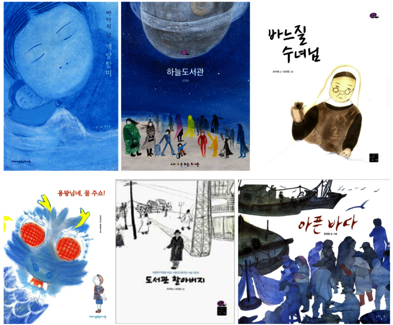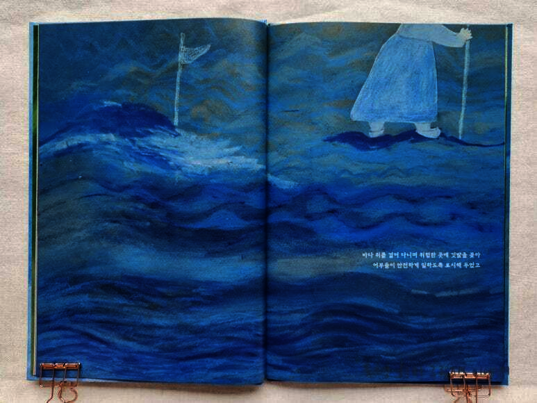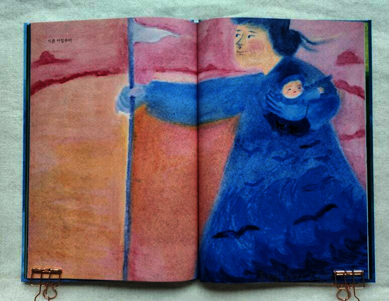 이른 아침부터 늦은 밤까지 오늘도 엄마는 바다를 지켜 주고 있습니다. 그림책을 읽고 서해 바다를 걸어 다녀도 치맛자락이 젖지 않는다며 얼마나 키가 컸을까요? 거인이라고 약하고 작은 사람들을 괴롭히는 못되고 무서운 이미지를 먼저 생각하지 말아주세요. 흙과 돌을 치마에 담아 깊은 바다를 메우고, 어부들이 안전하게 물고기를 잡게 도와주고, 길을 잃은 외국 어선에도 길 안내까지 해주는 바다의 따스한 엄마, 개양할미! 개양할미는 8명의 딸을 낳아 기르고 시집을 보내고 막내딸과 수성당에 살며 날마다 바다를 지켰다고 해요. 개양할미는 열정이 가득한 제 지인을 생각하게 하는 분이시네요. 사랑과 공감으로 양육을 하고, 자신의 삶에 열정이 가득하고, 함께하는 지인들에게 필요한 것을 내어주는 포근하면서도 따뜻한 분이시지요. 그런데요. 개양할미 같은 그분이 한 분만은 아니네요. 제 주위의 많은 분들이 개양할미 같은 품성과 능력들을 갖추고 계시네요. 그림책 뒷부분에 부록으로 개양할미의 자세한 이야기가 있어요. 바다 깊은 곳을 메우다 오복 구슬을 잊어버리고 불같이 화가 났어요. 부안 사람들은 이 화를 풀기 위해 굿도 하고 뱃놀이도 했어요. 개양할미는 오복 구슬을 찾았고, 사람들의 정성에 감동해 이 구슬을 사람들에게 나누어 주었다고 해요. 개양할미가 사람들처럼 화가 나는 일도 있고, 기쁘고 즐거운 일에 행복한 것 같아요. 그래서인지 절대적인 존재라서 멀게만 느껴지지 않고 오히려 친근하게 느껴지네요. 작가님이 바라보신 누구보다 더 열심히 부지런히 하루하루를 살아가는 성실한 신이었다는 부분이 더욱 공감 가네요. 개양할미에 대해 자료를 읽고 그림책을 들여다보니 더 많은 것이 보이네요. 텍스트는 설명하지 않지만 바다에서 잃어버린 오복 구슬, 시집보내는 딸과 품에 안은 막내딸, 뒷부분 면지의 수성당까지 장면에 녹아 있어요. 제가 발견하지 못한 부분들이 더 있을지 궁금해지네요. 그림책을 읽기 전 바다의 신을 생각하면 저는 포세이돈이 먼저 생각나요. 개양할미를 읽고 나니 한국 설화에 무지한 제가 부끄러워지네요. 생각해 보면 한국 설화에서 세상을 창조한 마고할미, 제주도의 설문대할망, 남해의 영등할미, 통영의 마구할미까지 어디선가 들어 본 이름들이 있지요. 아~ 출산과 운명을 관장하는 삼신할미도 있잖아요. 우리 설화를 읽는 기쁨을 다시 한번 생각해 보게 되네요. 개양할미 : http://aks.ai/GC08001313 - <바다의 신 개양할미> 작업 과정 -