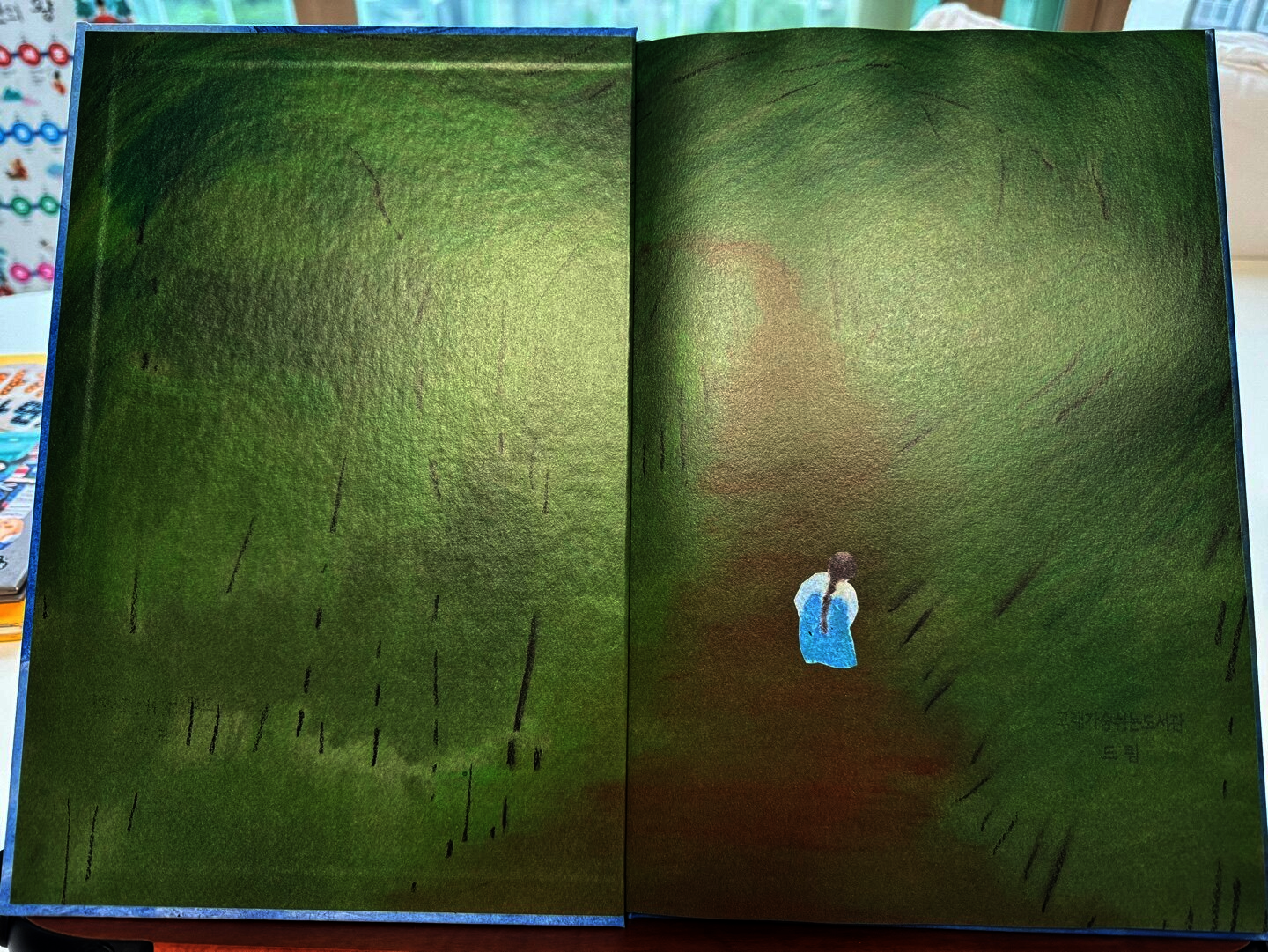 한 소녀가 오솔길을 걷는 뒷모습이 보입니다. 주변엔 풀이 가득해보이고, 비가 내리는 날씨인듯도 싶고요. 그림을 보면서 아이들과 어떤 장면인지 마음껏 상상의 나래를 펼쳐봅니다.