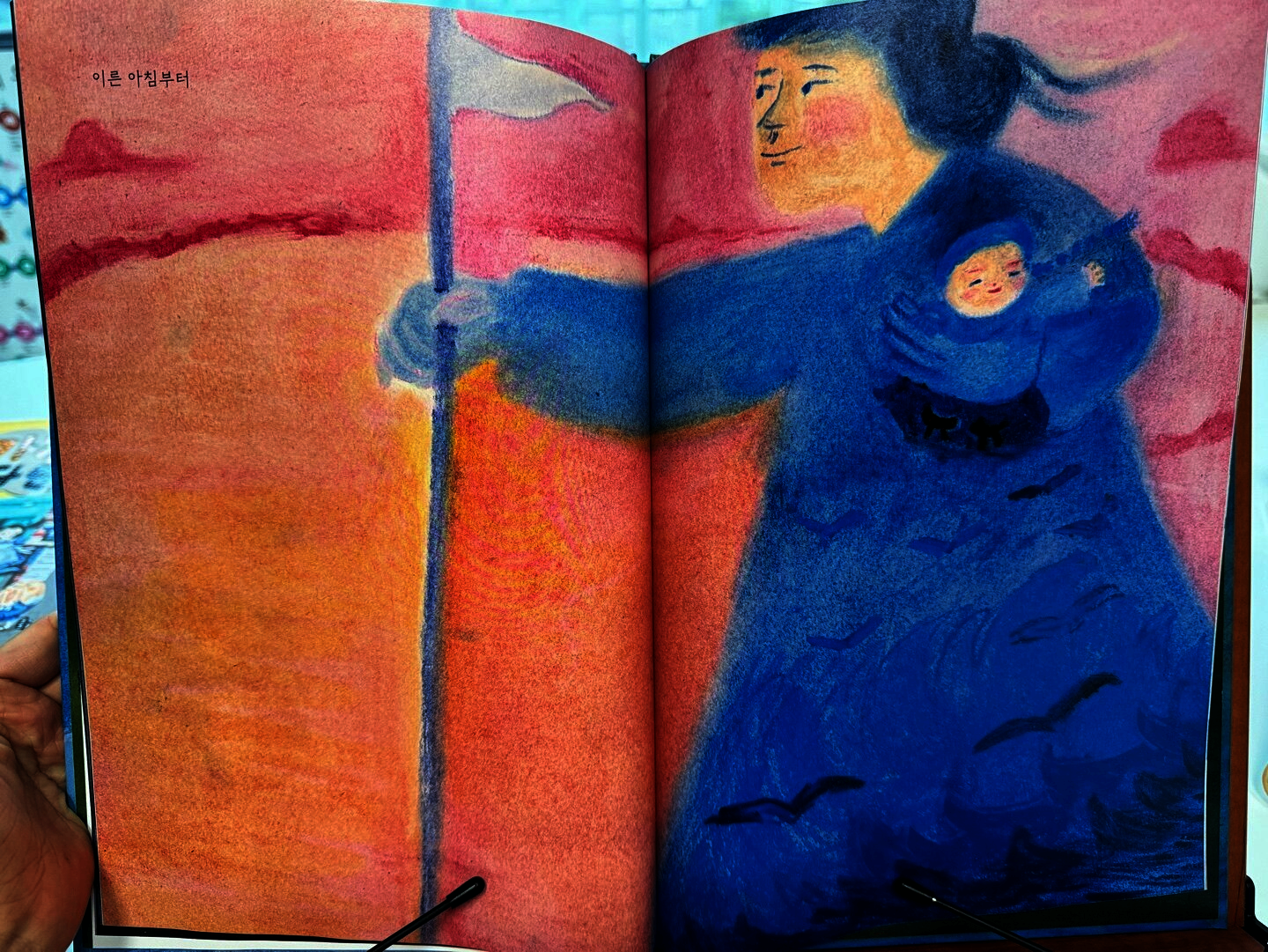 바다의 신 포세이돈? 우리에겐 개양할미가 계신다! 표지가 너무 시원하고 잔잔하고 힘세고 여러가지 느낌이 든다. 바다를 지키는 개양할미, 바다의 거인 개양할미 전북특별자치도 부안군 변산면 격포리에는 수성당이라는 작은 기와집이 있다. 이 곳에 수성할미를 모셔두었다. 수성은 바다의 성인이라는 뜻. 수성 할미는 개양할미라고도 부른다. 사람들의 이 할미를 바다의 신이라고 여겼다. 그래서 개양할미에게 어부들을 지켜 달라고 부탁하는 제사를 지냈다. 아직도 몇몇 어부들은 이곳을 지나갈 때 간단하게 고사를 드리기도 한다. 수성당은 1974년에 전북특별자치도 유형 문화재 제 58호로 지정되었다. 세상에서 두 번째라면 서러울 만큼 키가 크고 힘이 센 엄마 바다 위를 걸어 다니며 어부들이 안전하게 일하도록 위험한 곳에 깃발을 꽂아 둔다. 거센 물산은 큰 바위로 막아 잠재우고 어선과 어부들이 위험에 빠지면 한걸음에 달려와 구해준다. 이렇듯 엄마는 한결같이 바쁘게 일하고 있다. 왜냐하면, 엄마는 바다를 지키는 신이니까요. 이른 아침부터 늦은 밤까지 오늘도 엄마는 바다른 지켜주고 계시다. 그림을 보면 품에 막내딸을 안고 계시는 개양할미 내 자식이라고 생각하며 바다에서 생업하는 사람들, 지나가는 사람들을 포근히 안전을 지켜주시는건 아닌지. 위험으로부터 막아주는 엄마의 마음을 그림을통해 잘 전달되는것 같다. |
