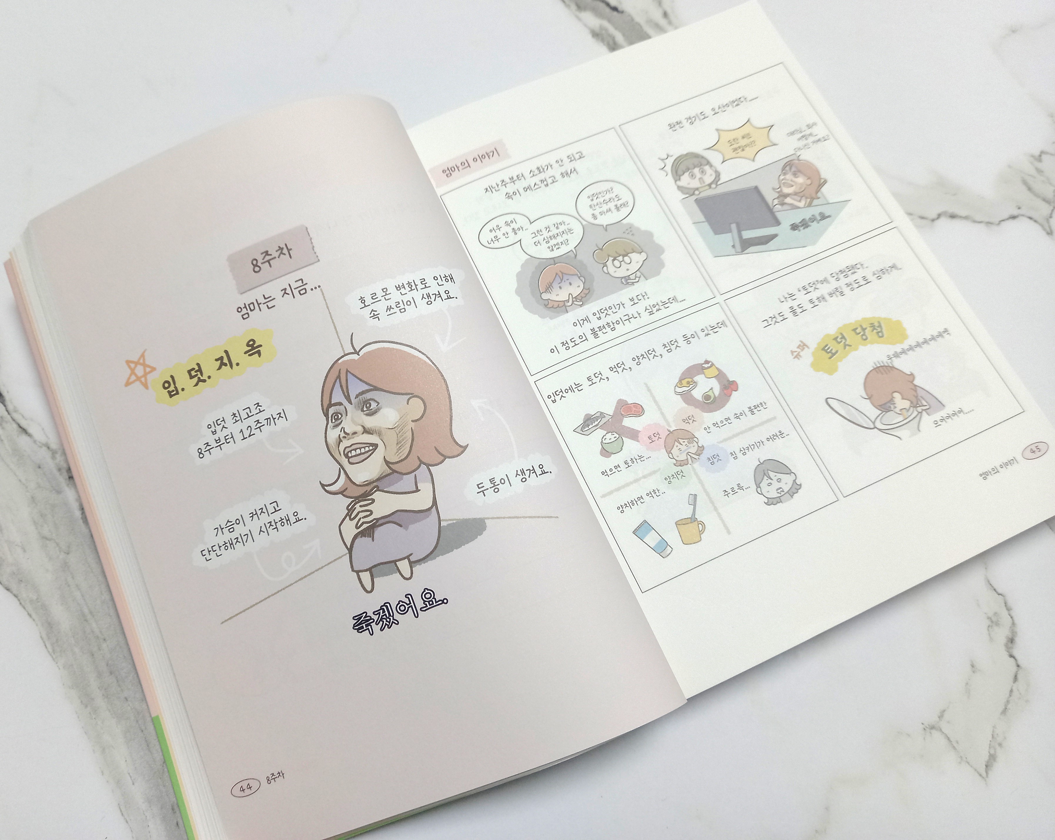 ?임신을 하면 내몸에 일어나는 변화가 왜그런지 그게 궁금하고, 임신을 한 임산부라고 해도 모두 다른 증상이 나타나요. 그 때문에 어려움의 강도도 모두 다르지요. 무엇보다 나만 아는 이 고충과 어려움을 공감받고 싶은 마음이 커요. 그런 임산부의 폭풍 공감을 일으킨 임신 웹툰 SNS와 맘카페에서 핫하다는 '도란의 40주 임신 출산 다이어리' 가 책으로 출간되었네요. ![]() '도란의 40주 임신 출산 다이어리'는 40주간의 임신기를 첫 경험한 예비맘 도란 작가님의 실제 이야기이고 산부인과 전문의 정선화 원장님이 감수를 하여 임신 출산 과정의 전문적인 지식까지 포함되어 있으니, 재미있는 만화로 즐겁고 실제 이야기라 공감도 가고, 임신 출산 과정의 전문적인 지식도 알 수 있는 있어, 임신 출산 선물로도 아주 좋을 것 같다는 생각이 드네요. 프롤로그부터 너무 재미있어요. 정자와 난자가 만나 착상이 되는 과정인데요. "배아님 여기예요! 오세요!" 하면서 나를 애타가 기다른 그분이 집 열쇠를 건네주곤 긴 휴가를 떠나서 집에서 열 달 동안 쉰대요. 그림체도 정자 이모티콘 만들어돌 될 정도로 동글동글 귀여워요..∩∩.. ![]() 엄마의 이야기 엄마의 이야기는 각 주마다 엄마의 몸의 변화를 한 눈에 알 수 있어요. 몸에 변화에 따라 겪게되는 일상의 이야기가 리얼 공감될 수 밖에 없는 위트 넘치는 이야기와 재미있는 그림! 입.덧.지.옥. 저도 생각 나네요...ㅠㅠ 24시간 때와 장소를 가리지 않고 찾아오는 울러거림과 구토.. 빨래하다가도 갑자기 세제가 냄새에 욱하고, 로션 바르다가도 갑작 욱하고, 엘리베이터 타고 있는데 욱하고, 버스 타고 가다가 여러번 내리기도 하고 항상 가방, 주머니에 검정색 비닐 봉투를 몇 장씩 넣고 다녔어요. 저는 임신을 할때마다 30kg 체중 증가가 있어서 엄청 힘들었어요. 골반도 틀어지고, 잠도 제대로 못자고... 책 보면서 옛 기억이 몽글몽글 떠오르네요. 임신썰 제대로 풀어준 툰이예요~ ![]() 아이의 이야기 아이이의 이야기는 각 주마다 아이가 자라는 변화를 한 눈에 알 수 있어요. 40주 280일간 아이가 자라나는 과정을 자세하게, 아주 아주 귀여운 그림으로 설명해 주니 이해가 정말 쏙쏙 되지요. 아이의 심장 소리를 들었을때, 3D 초음파 사진을 보고 누구 닮았는지 확인하고 있을때, 처음 발차기를 느꼈을때 정말 감동적인 순간들이 많죠..! 지금은 어떤지 모르겠지만, 제가 임신했을때는 산부인과에서 아이의 성별을 알려주지 못하게 되어 있었어요. 그래서 태아성별검사하고는 의사 선생님마다 힌트 주는 말들이 달라서 뭐라고 했냐고 공유하기도 했었어요. "엄마 닮았어요. 아빠 닮았어요.", "분홍색 배냇저고리 준비하세요. 파란색 배냇저고리 준비하세요.", "요녀석 이쁘겠어요, 요녀석 씩씩하겠어요." 이런식으로요~ ![]() 엄마의 다이어리 '도란의 40주 임신 출산 다이어리'는 주차별 웹툰 뒤에 병원 진료에서 검사 받은 아이의 상태나 태동 등으로 엄마가 아이와 느낀 교감, 변화되는 감정, 몸 컨디션 등을 기록할 수 있는 '엄마의 다이어리'가 제공되어 있어요. 산모 수첩에 적는 것도 좋지만, 이곳에 차곡 차곡 기록해 두었다 태어날 아기에게 남겨준다면, 후에 엄마가 임신했을 때 얼마나 힘든 과정을 겪었는지 자신이 어떻게 만들어지고 엄마 배속에서 어떻게 자랐는지, 신기하고 소중한 존재인지 더 잘 알 것 같아요. ![]() '도란의 40주 임신 출산 다이어리'는 초산 예비맘에게는 궁금했던 정보들을 재미있고 알기 쉽게 알려 주고, 임신 과정에서 겪게 되는 몸의 변화, 감정의 변화를 이해하고, 임신 과정의 고충을 이해하기 힘든 남편과 함께 읽어 보면 공감대도 형성되고 유대관계를 돈독히 다질 수 있는 계기가 될 것 같다는 생각이 들었어요. 임신 선물로 딱 좋은 책이라고 생각합니다. ?다락원 출판사로부터 도서를 제공받아 읽고 쓴 리뷰 입니다.