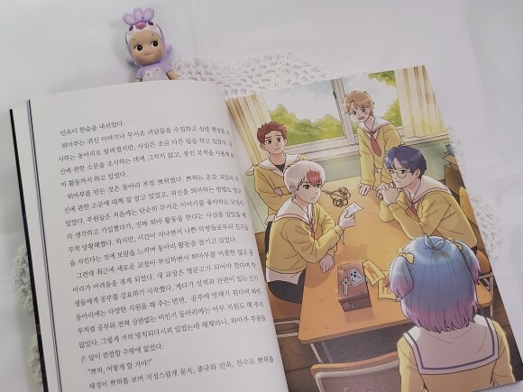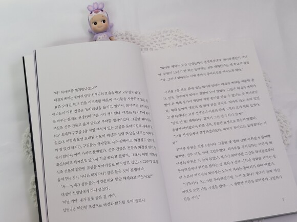 문제는 책을 받고 나서였다. 아이는 함께 온 키링과 엽서는 예쁘다고 좋아했으나 책의 두께에 헉-! 했다. ㅎㅎ 생각보다 두꺼웠던 탓이라 생각된다. 책을 좋아하는 학생들이라면 무리 없이 읽을 수 있겠지만, 책을 읽어나가기 시작한 아이들에게는 좀 버거울만한 두께다. 만화책도 아니고, 얇은 단편 동화책도 아니며 장편 동화에 가까웠으니 말이다. 본문을 살펴보면 글자 크기가 좀 더 작아지고, 한 페이지에 들어가 있는 글자의 수가 많고 중간중간 삽화가 있긴 하지만 글의 양이 꽤 되었다.