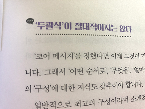 이 책은 다른 책들과 다르게 직접 연설이나 하고 싶은 말을 표현한 방식을 두 부류로 나누어서 비교해 보면서 어떤 언어가 더 부드럽게 잘 전달이 되는지 스스로 알아보도록 하고 있다. 내가 하고 싶은 말을 두가지 표현으로 했을 때 어느쪽이 더 전달이 잘 되고 명확하게 보이는지 알게 된다. 너무 길게 늘어뜨려서 하는 말들은 듣는 사람들에게 지루하고 다른곳으로 시선을 돌리게 하는 경향이 두드러진다. 하고 싶은 말을 명확하게 간단하게 전달하는것도 좋고 쉽게 이해할 수 있도록 하는것도 아주 중요한 포인트인 것 같다.