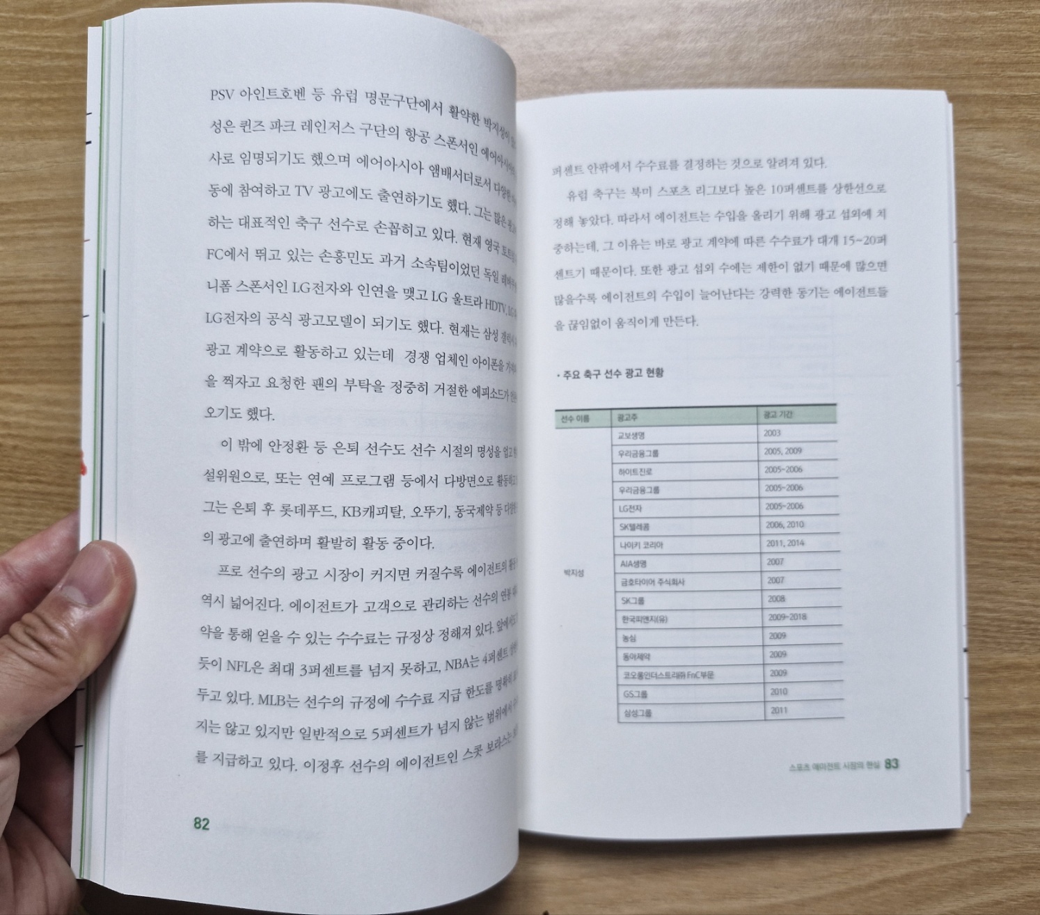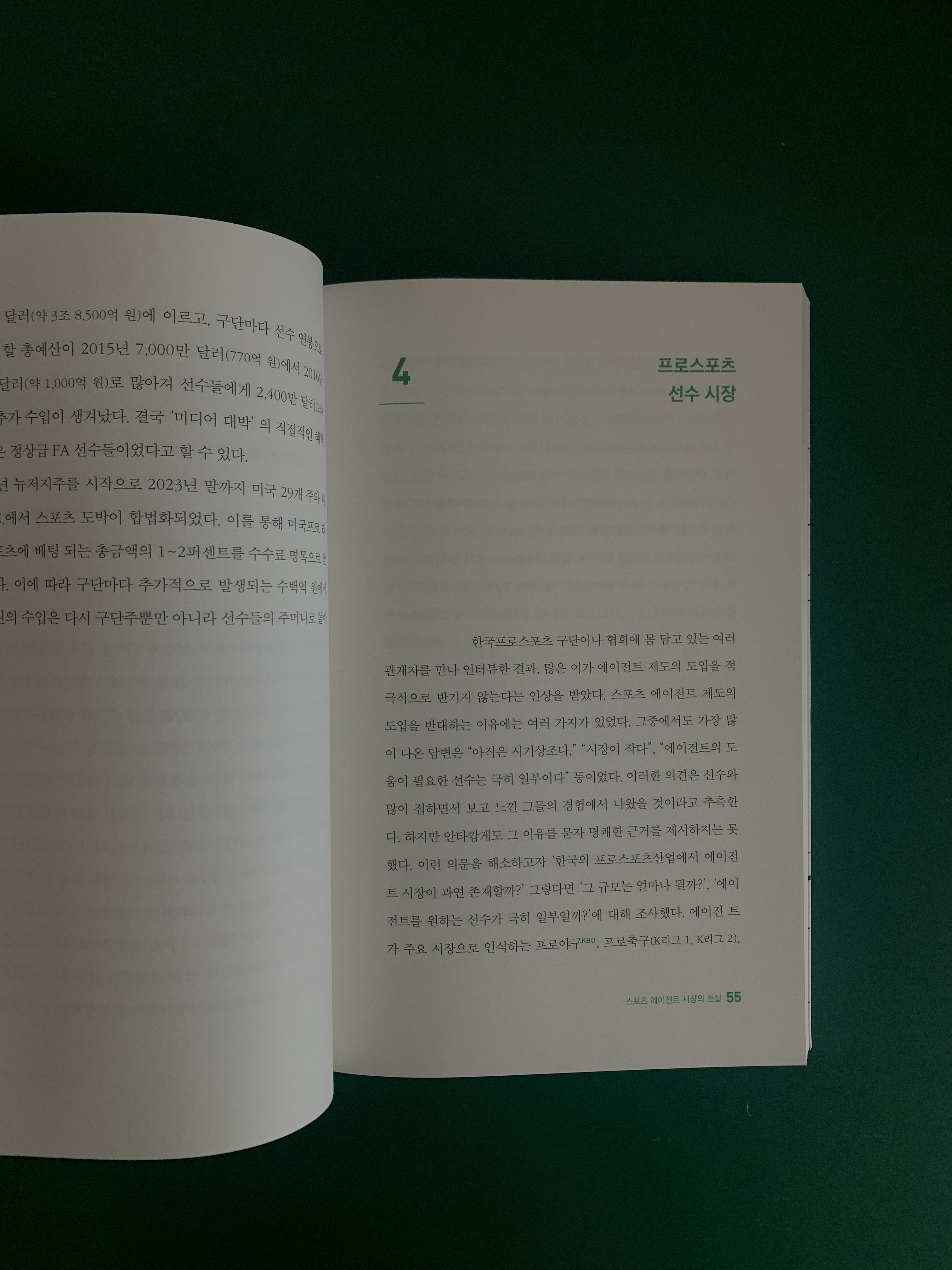 1부 스포츠 에이전트, 꼭 필요한가? 에서는 스포츠 에이전트 는 스포츠와 관련된 고객에게 스포츠 에이전트 업무에 관한 권한을 부여받아, 고객의 이익을 위해 업무를 행하고 보수를 지급받는 자다. 선수는 구단에 경기력에 대한 객관적 근거를 제시할 길이 없고, 입단 이후 수년간 구단에 종속되는 특수한 관계라는 점 등 때문에 구단에 비해 협상력이 불리한 편이다. 에이전트 제도는 구단과 선수가 비교적 동등한 입장에서 연봉 협상에 임할 수 있는 시스템을 만든다. 유능하고 자격이 검증된 에이전트 는 선수가 구단의 강력한 힘에 맞대응할 수 있도록 조력자로서의 역할을 할 수 있다. 미국에서 스포츠 에이전트 중 50% 이상이 변호사 자격을 갖는다. 세금 문제, 은퇴 후 재무 계획에 조언이 필요한 선수들은 회계사나 세무사 자격증을 동시에 지닌 에이전트를 선호하면서, 에이전트 산업은 꾸준히 성장하게 된다. 스포츠 에이전트 는 구단과의 연봉 협상, 연봉 외 혜택 요구, 법규나 규제로부터 선수 보호, 은퇴 전 재무 조언 등 역할을 한다. 2부 스포츠 에이전트 시장의 현실 에서는 세계 톱 스포츠 에이전트 20개 사의 연간 총 계약 금액은 약 700억 달러, 커미션 금액은 약 44억5천말 달러 에 이른다. 슈퍼 에이전시 중 특정 종목 스포츠만 전문으로 운영하는 업체들도 상당수를 차지하고 있다. 선수의 연봉이 급격히 올라가는 이유는 리그 전체 수입이 늘었기 때문이기도 하다. 리그 전체 수입이 각 구단에게 공평하게 지급되고, 정상급 선수들의 연봉으로 지출되면서, 직접적 혜택을 본다. 스포츠 에이전트 제도의 핵심 시장으로 인식되는 분야는 프로야구, 프로축구, 프로농구, 프로배구 시장이다. 4대 리그 전체에서 최고 연봉은 최저 연봉의 100배에 달한다. 에이전트 제도 활성화를 위해서 필요한 것은 신인 선수의 연봉 수준이다. 현재의 연봉 금액으로는 에이전트 의 관심을 갖기 어렵다. 프로 선수들은 비교적 짧은 기간 동안 선수로 활동하기 때문에 수입을 최대한 올려야 한다. 프로야구 선수 활동 기간 동안 벌어들일 수 있는 평균 기대소득은 특A급 선수를 제외하고는 참담한 수준이다. 에이전트 제도 도입이 활성화되려면 신인 선수와 저연봉 선수에게 혜택을 주는 다양한 대책이 필요하다. 프로야구 인기가 높아지면서, 광고 효과가 증가하자, 타이틀 스폰서 가 경제성을 확보하기 사작하면서, 더 많은 기업이 다양한 방식의 스폰서십 계약을 체결할 것이다. 서울히어로즈는 모기업이 없어 직접 돈을 벌어야 하면서, 많은 수의 기어들과 저렴한 가격에 파트너십을 체결하는 새로운 수익모델로 구단의 경제적 자립 가능성을 보여준다. 프로 선수의 광고 시장이 커질수록 에이전트 의 활동 반경 역시 넓어진다. 선수 은퇴 후 코칭스태프, 해설위원 등으로 활동하면서, 에이전트 와의 인연은 계속된다. 스포츠 에이전트 는 프로 리그 가 없는 올림픽 스포츠 선수들도 잠재 고객이다. 올림픽대회에서 메달 수, 랭킹이 하락하며, 한국 선수들의 위상과 대외 인지도가 줄어들면서, 올림픽 선수들의 광고 계약 시장은 축소된 상황이다. 격투기는 세계에서 가장 급속히 성장하는 스포츠 종목의 하나다. 격투기 대회 수가 증가하고, 상금 규모 또한 커지므로, 격투기 선수 시장은 에이전트 에게 매력적인 시장이다. 프로골프 는 대회 후원뿐만 아니라 선수 개인에 대한 후원을 동시에 할 수 있어서 후원 수단이 다양하다. 프로골프 선수 시장은 다른 프로스포츠 에 비해, 에이전트 시장이 안정적으로 운영되고 있다. KPGA 상위 20명의 평균 상금은 4억6,427만 원이다. 미국프로골프 는 국내 프로골프 보다 대회 수가 약 2배 많고, 총상금은 약 20배 차이가 나므로, 국내 우수 선수들이 미국 무대에 진출하는 경향을 보인다. 해외 여자 골프 리그 에서 한국 여자 선수들의 활약은 두드러진다. 3부 국내외 스포츠 에이전트 제도 에서는 국내 스포츠산업 시장 규모는 약 78조 원이다. 한국 스포츠 에이전시 대표 회사는 갤럭시아SM, 스포티즌, 세마스포츠마케팅 이다. 갤럭시아SM은 스포츠 와 엔터테인먼트 를 결합한 스포테인먼트 시장을 개척했고, 스포티즌은 스포츠 마케팅 노하우가 검증되었으며, 세마스포츠마케팅 은 부분 인수 개념으로 일정 부분 개최 권리를 넘겨받아 흥행 수익을 나눈다. 법무법인, 용품 유통 머천다이징 업체 등도 에이전트 시장에 도전한다. 스포츠 에이전시 마케팅 업계는 에이전시 사업 외에도 마케팅 분야를 주 업무로 설정하고, 법률, 회계 등 전문 분야에 대한 지원 역량을 갖추며, 홍보와 경기력 지원 시스템을 구축한다. 1인 에이전트 는 규모는 작지만 에이전트 본연의 역할에 역량을 발휘하는 전문 에이전트로 각 분야에 다수 존재한다. 국내 스포츠 에이전시 중 두각을 나타내는 스포츠 인텔리전스 그룹, 김동욱 대표, 리코스포츠에이전시, 이예량 대표, PNJ 코퍼레이션 박민 대표 와 스포츠 에이전트 에 대해 인터뷰 한다. 국제기구 발급 자격 자격증을 지니고 업무를 하는 에이전트 는 외국인 선수의 국내 리그 진입을 돕거나, 내국인 선수의 해외 진출을 돕는다. FIFA 에이전트, FIBA 에이전트, FIVB 에이전트 를