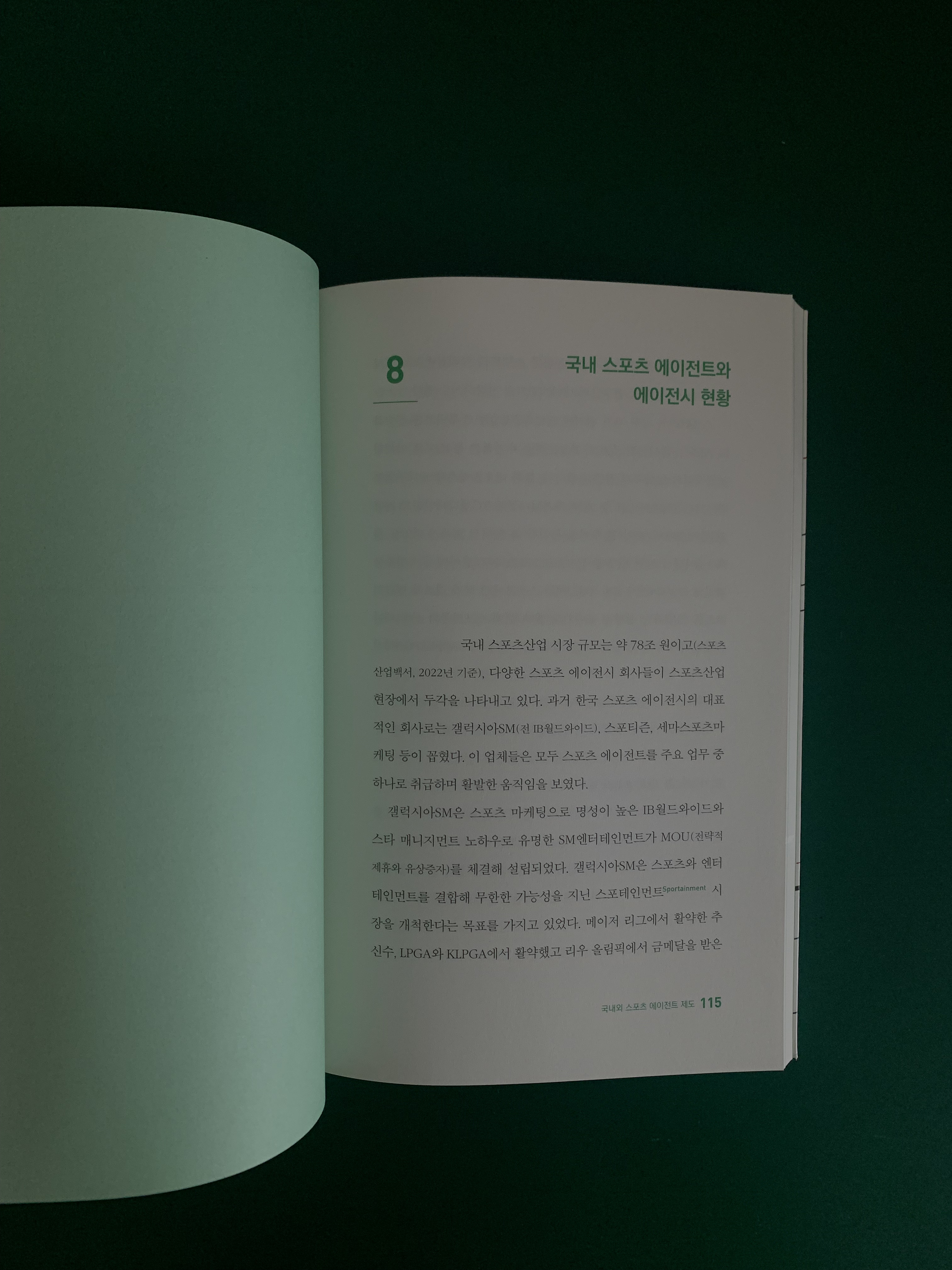 미래의 스포츠 에이전트의 전망은 어떠할까? 여기에는 사람들마다 의견이 엇갈리는 듯 하다. 개인적으로는 우리나라의 인구가 점점 줄어들어 운동선수의 규모도 자연 축소되고 있으며 엘리트 체육보다는 생활 체육으로의 비중으로 축이 옮겨갈 것이라는 점에서 앞으로의 전망이 그다지 밝아보이지는 않는 것 같다. 그럼에도 운동선수가 전성기를 누리며 돈을 버는 기간이 일반인에 비해 한정되어 있다는 점과 상대적으로 ‘을’인 선수가 ‘갑’인 구단의 공정한 계약을 체결하는 문제등을 고려해 볼 때 스포츠 에이전시의 역할은 중요하다는 생각이 든다. 어쨌든 이 책은 생소했던 스포츠 에이전트라는 직업과 우리나라 및 해외의 여러 사례를 통해 스포츠 에이전트와 관련된 지식을 얻을 수 있어서 좋았던 책이다.