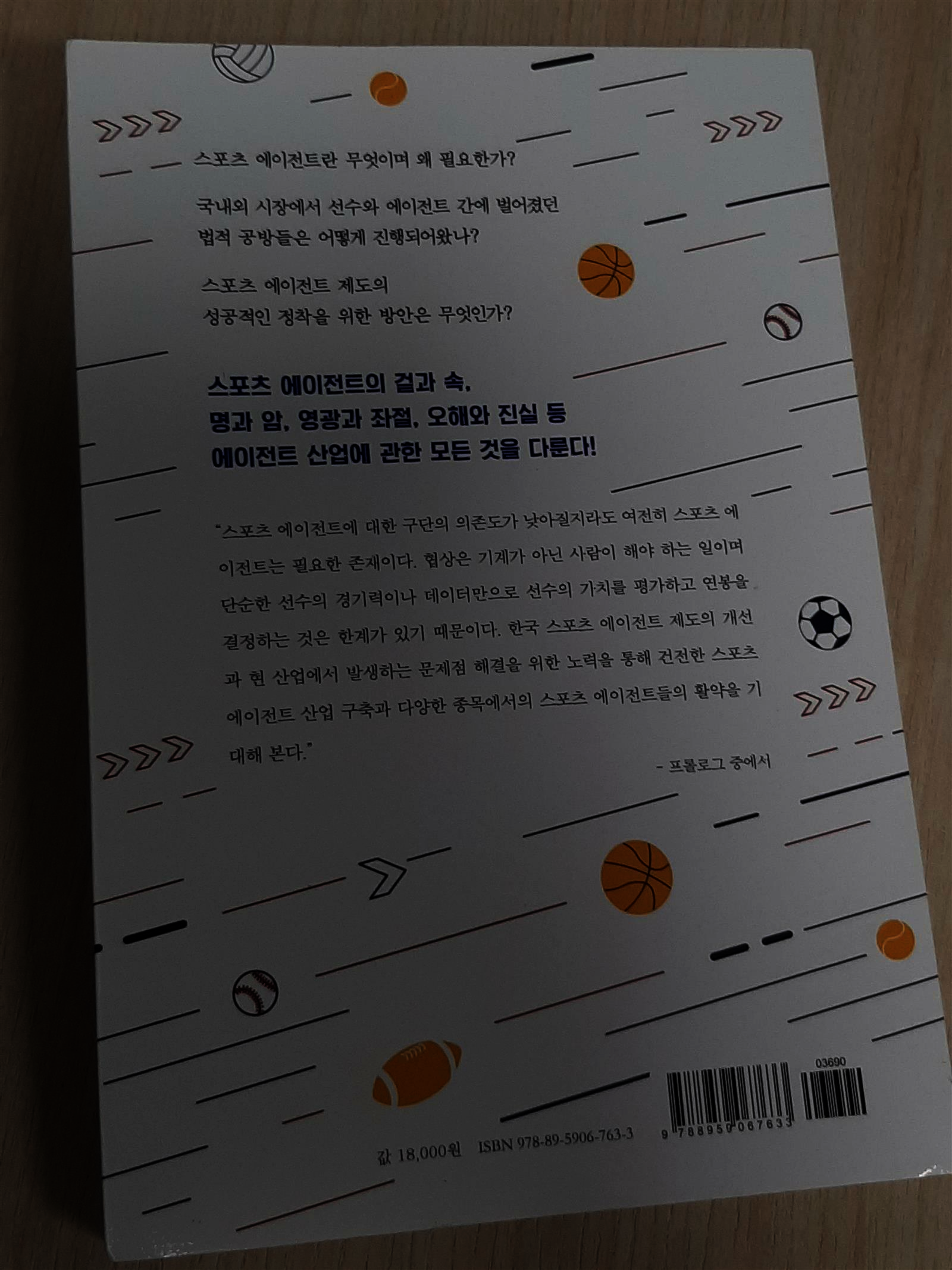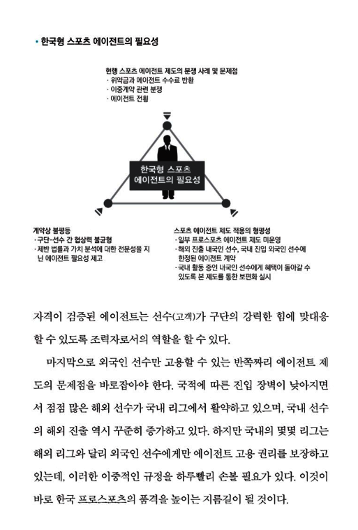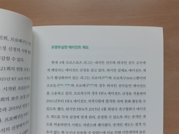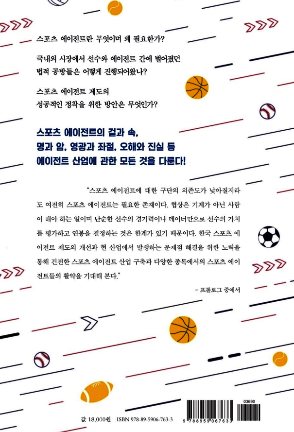 "스포츠 에이전트의 겉과 속"은 1부 스포츠 에이전트, 꼭 필요한가? 2부 스포츠 에이전트 시장의 현실 3부 국내외 스포츠 에이전트 제도 로 구성되었다.