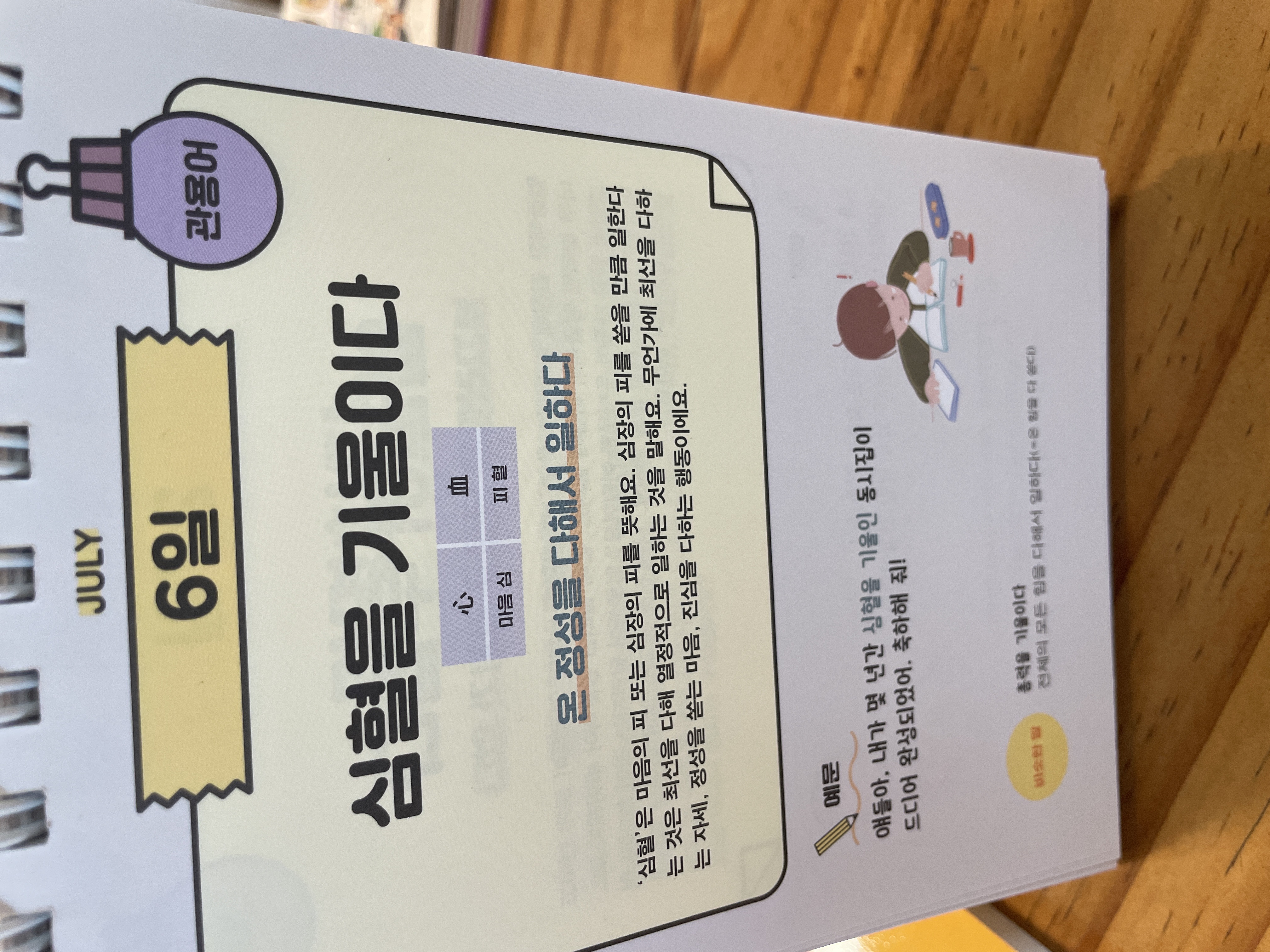 하루레 한 단어라도 읽히라고 아이방에 두었습니다. 한자와 뜻풀이 예문까지 수록되어 있어서 이해하기 좋습니다. 평소 말로 잘 표현하지 않는 눈에 보이지 않는 감정, 가치등이 수록되어 있어 아이의 어휘 수준을 끌어올릴 수 있을 듯 합니다. 또한 관용어 표현 또한 알려주셔서 너무 유익한 일력입니다.