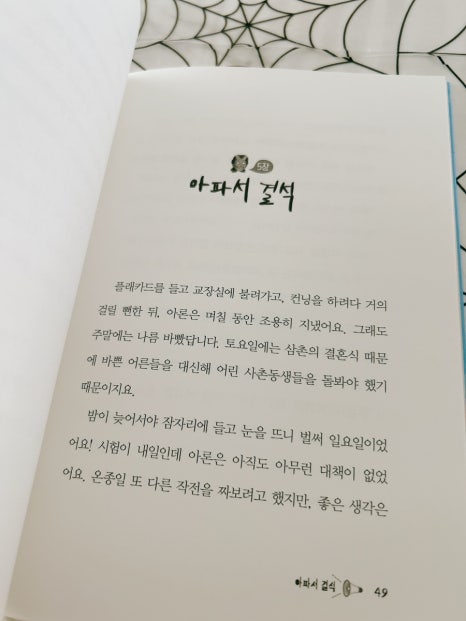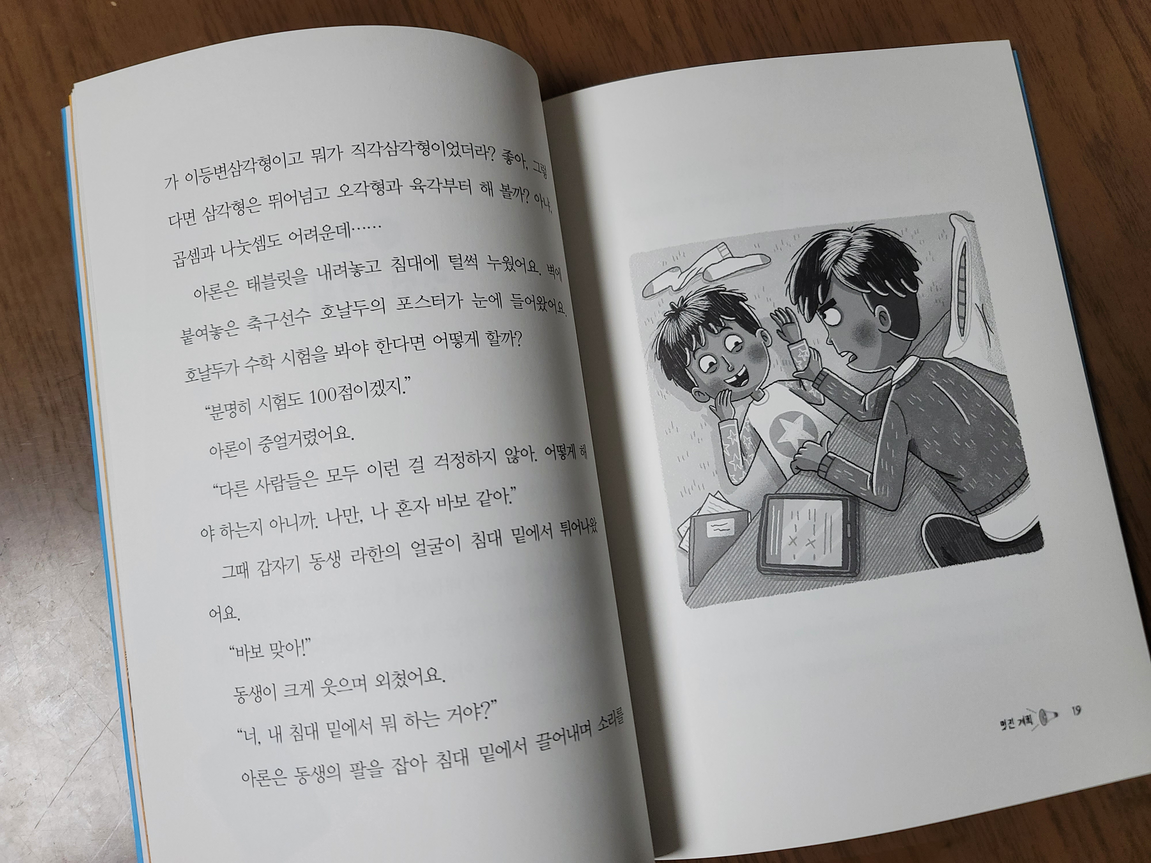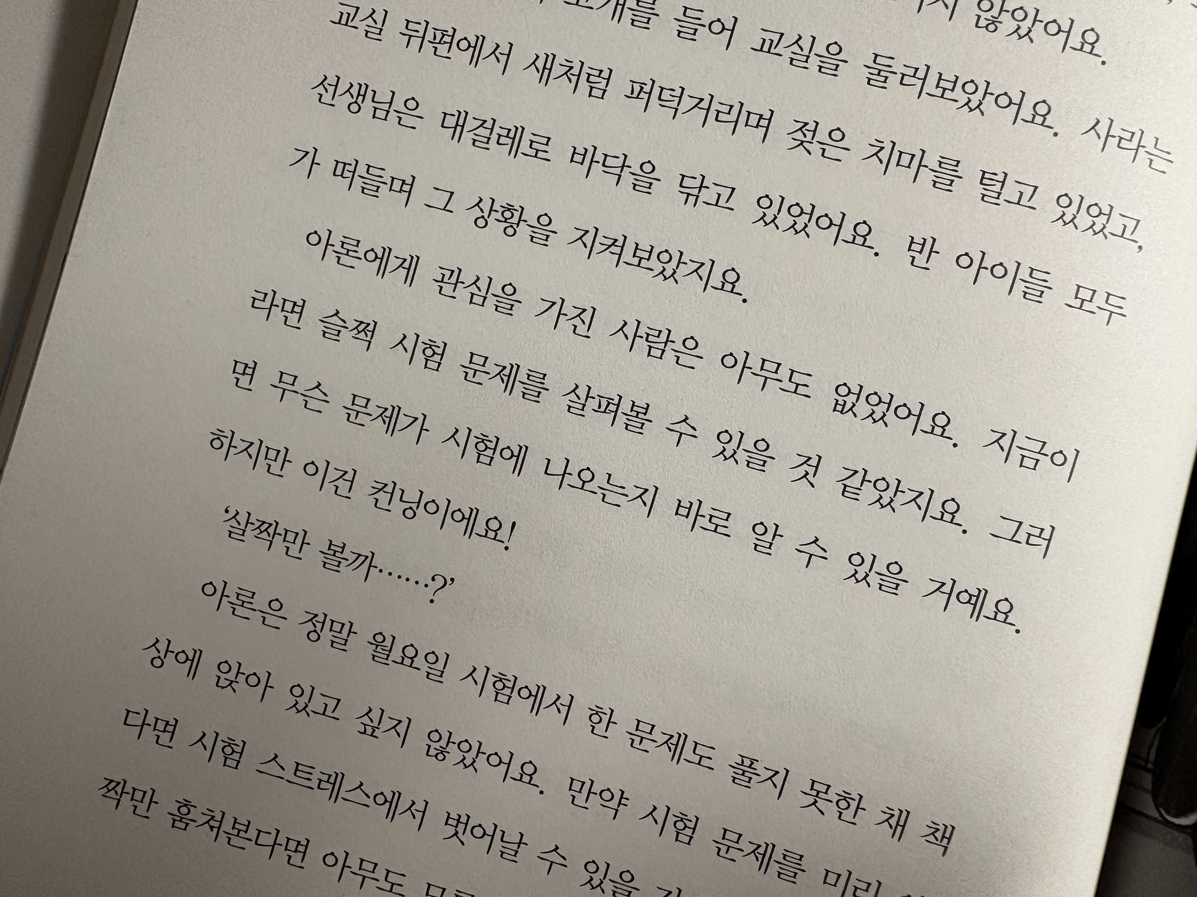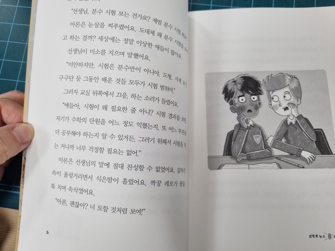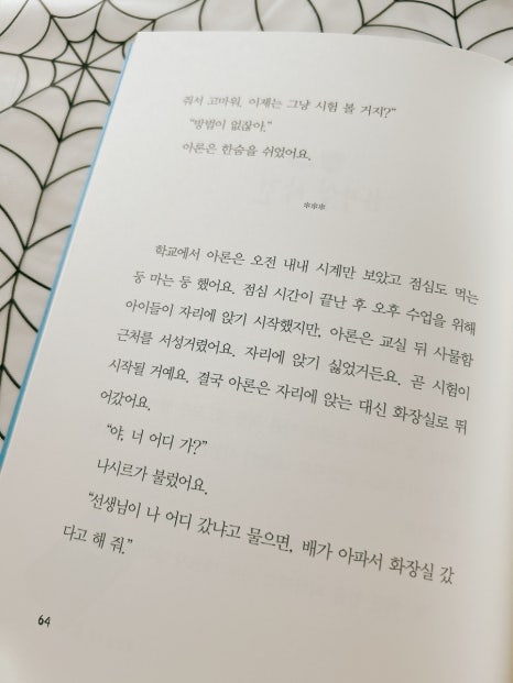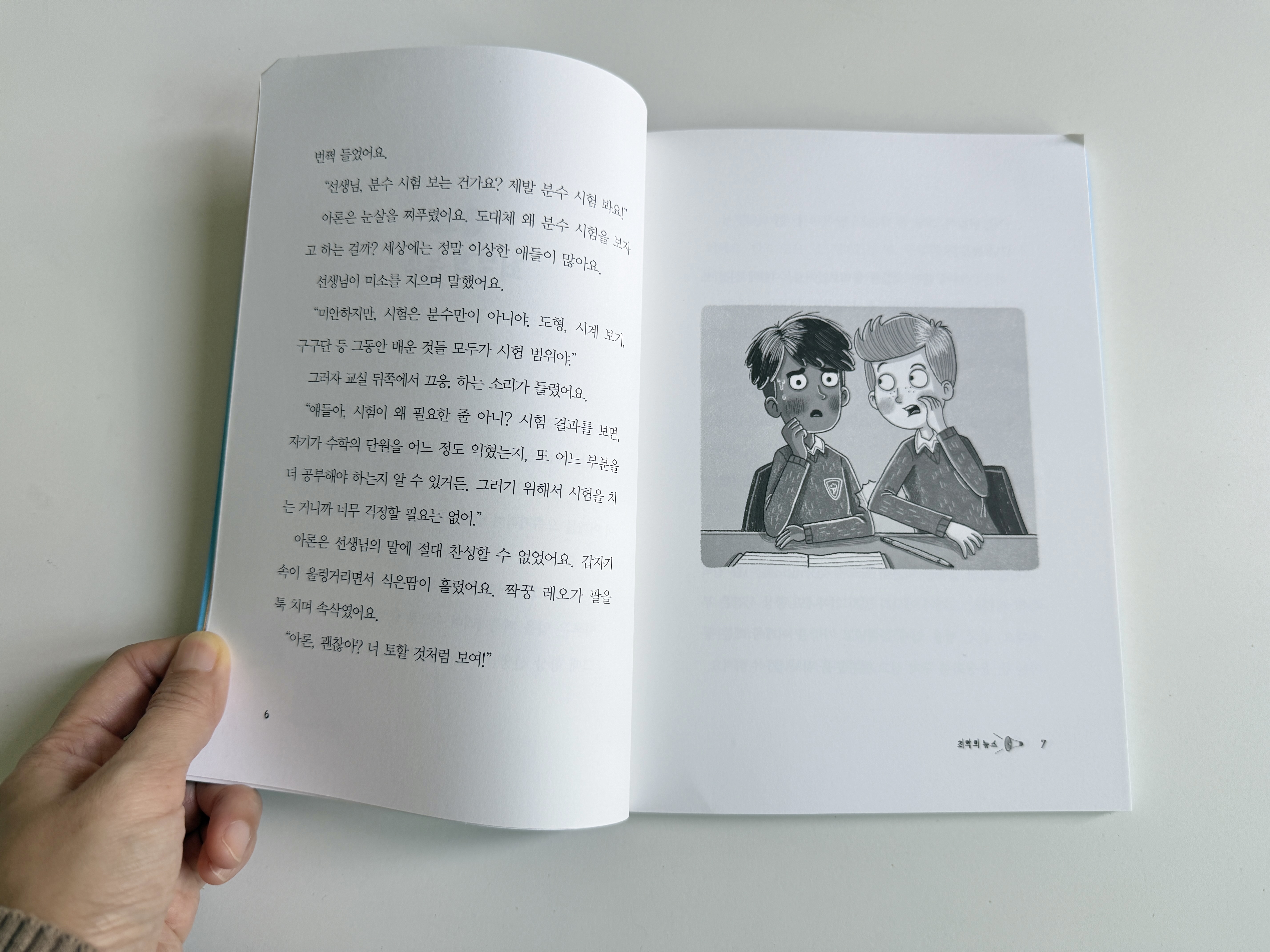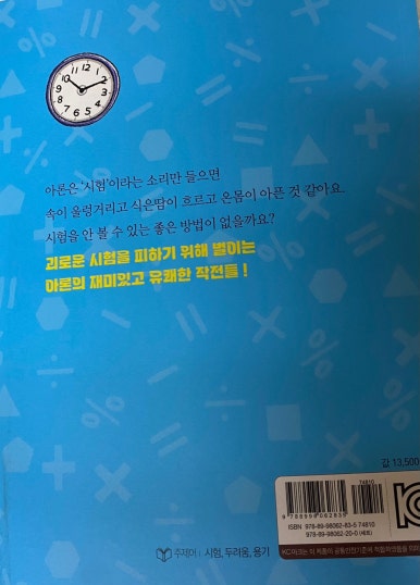 이 책은 니케주니어 출판사에서 나오는 초등학교 저학년 동화 시리즈 <반짝반짝 빛나는 아홉살 가치동화>의 열두번째 이야기로 시험 공포에 사로잡힌 주인공 아론이 시험을 피하기 위해 고분분투하는 이야기를 담은 동화입니다.