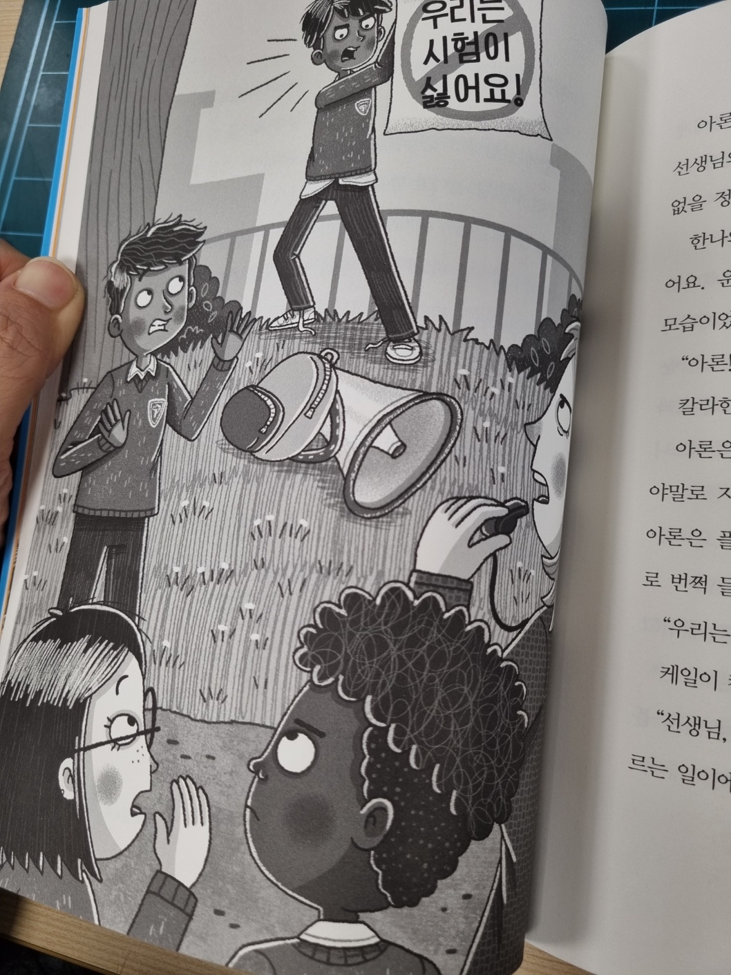 주인공 아론은 머리가 나쁘지는 않지만 시험을 두려워합니다. 시험 때만 되면 괜히 긴장하고, 그래서 자꾸 실수하다 보니 시험이 더 싫고 무서워지는 거죠. 다음 주에 수학 시험을 보겠다는 선생님의 말씀을 들은 후부터 아론은 안절부절못합니다. 그리고 어떻게 하면 시험을 보지 않을까 궁리하면서 작전을 짜지요. 사회운동가였던 할아버지를 본받아 ‘우리는 시험이 싫어요’라는 플래카드를 만들어 운동장에서 시위를 하는 거예요. 하지만 아론의 작전은 교장 선생님의 훈화 말씀만 잔뜩 들은 채 실패합니다. 번째는 시험날 아침 몸이 아프다고 거짓말을 하고, 학교에 빠지는 계획이에요. 엄마가 쓰는 찜질팩까지 동원해 열이 난 것처럼 속이고, 동생까지 협력하도록 만들지요. 드디어 성공이라고 기뻐하는 것도 잠시, 학교에서 시험을 내일로 미뤘다는 소식을 엄마가 전해 줍니다. 그 모습을 본 옆집 아저씨는 아론이 무대공포증일지도 모르겠다며, 일단 시험을 쳐보면 어떻겠냐고 조언하지요. 정말 시험이 두렵다면, 시험을 보기 위해 앉아 있는 것만으로도 큰일을 한 거라면서요. 하지만 아론은 여전히 두렵기만 합니다. 시험 당일, 결국 아론은 시험 시간 직전 화장실로 도망가 버립니다. 그런데 뜻밖에도 화장실에는 먼저 와 있는 친구가 있었죠. 언제나 100점을 자랑하던 케일이었어요. 늘 당당해 보이던 케일도 우등생인 형과 비교당하면서 스트레스를 받고 있었던 거죠. 아론은 자기만 시험 스트레스를 가지고 있는 것이 아니라는 사실을 깨달으면서 용기를 얻습니다. 그렇게 케일을 설득해 교실로 향하고 주어진 수학 시험 문제를 천천히 풀기 시작하면서 두려움을 극복해냅니다.