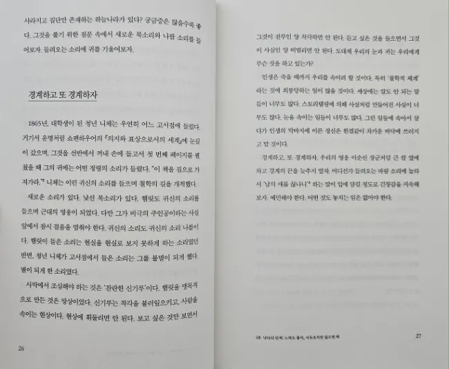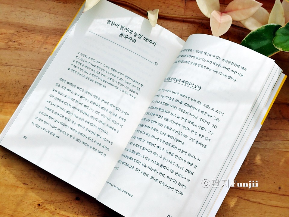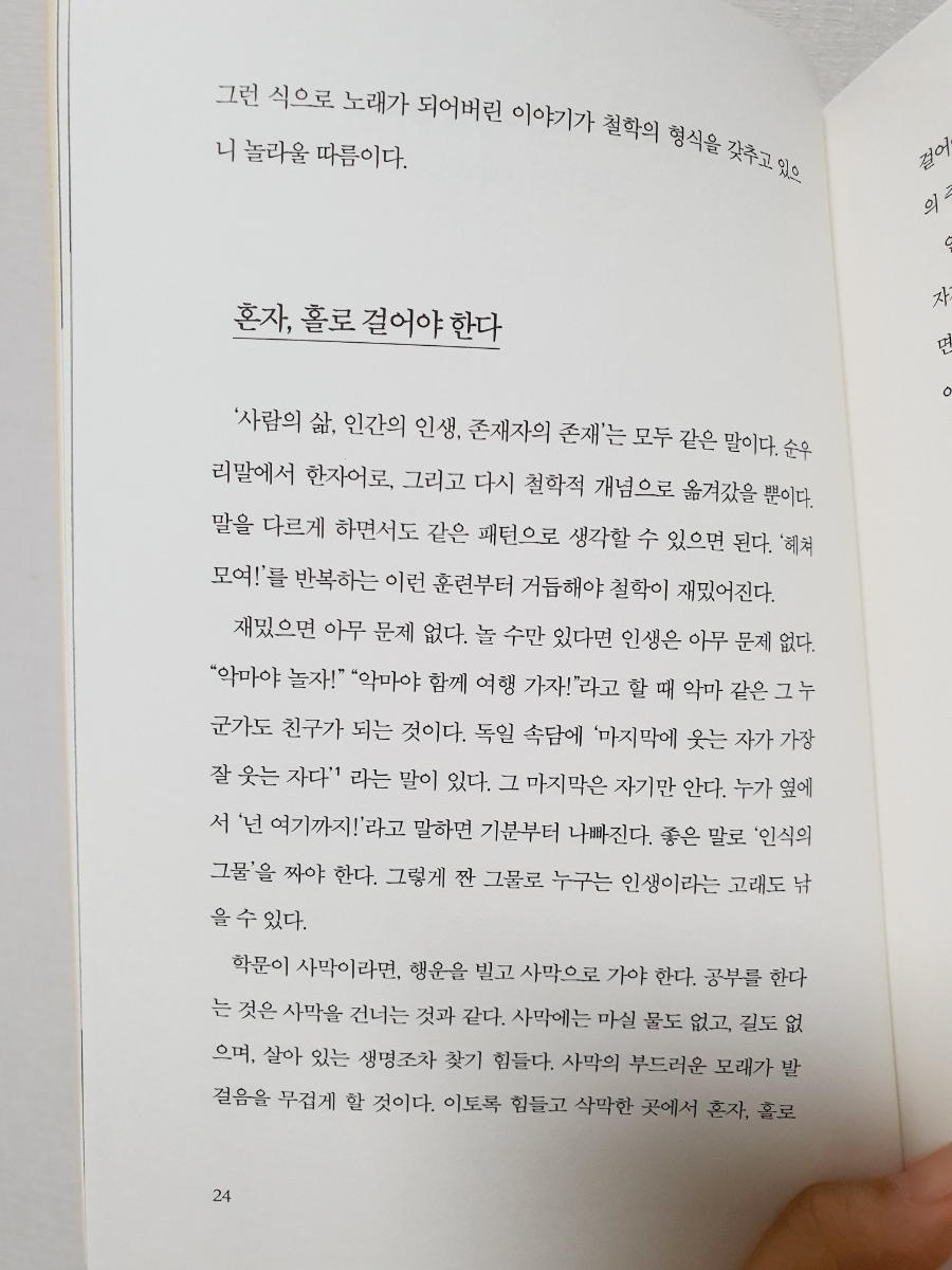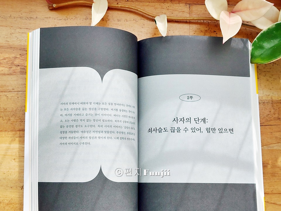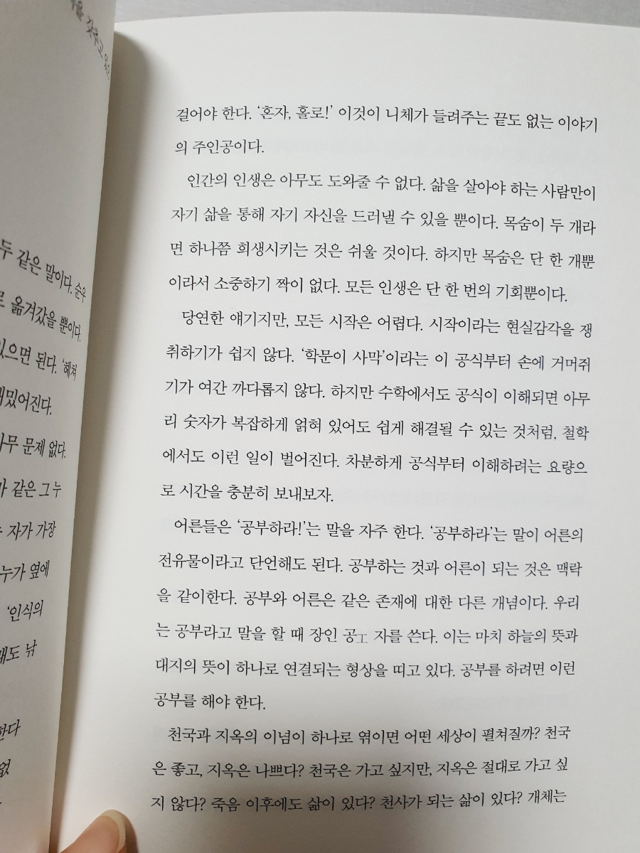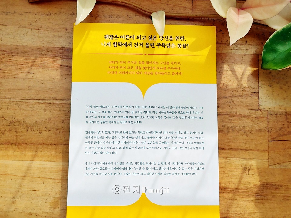 ㅣ출판사로부터 도서를 제공받아 솔직하게 작성한 글입니다. 나이가 들면서 점점 더 괜찮은 어른이 되고 싶다는 생각이 드는데요. 이번에 니체의 가르침으로 생각해 보는 책을 보게 되었는데 꽤 괜찮은 어른이 되고 싶다면 니체를 만나라 입니다. 이 책은 독일 철학박사이며 니체연구자로 니체의 철학을 현대적으로 재해석하며 그 안에서 우리가 과연 어떤 어른이 되어야할지 생각해 보게 하는데 그렇게 니체의 철학을 어렵지 않게 만나볼 수 있는 책이었어요. 어른이라는 개념을 생각하면 그저 단순하게 세월이 흘러 자연스럽게 노화된 결과물이라고 생각하게 되는데 몸만 나이가 드는 그런 어른이 아니라 정신과 마음이 어른이 된다는 것은 사실 쉽지 않은거 같아요. 주변을 보면 저 어르신은 정말 멋지게 나이드셨다 싶은 생각이 드는 분이 계신가 하면 어떤 분은 아집과 고집으로 똘똘 뭉쳐서 그 누구의 말도 듣지 않을꺼 같은 꽉 막힌 어른도 볼 수 있거든요. 나는 과연 어떤 어른이고 싶은가를 생각해 보면 저 나름대로는 저렇게 나이들지 말아야지 하고 생각은 하지만 그런 어른의 모습은 무엇인지를 딱 꼬집어 설명할 수 있다면 그건 또 쉽지 않더라고요. 그래서 점점 더 철학이라는 학문에 관심을 갖게 되는 것이 아닌가 생각이 드는데요. 그중에서도 니체의 철학은 나이가 들면서 점점 더 공감이 되고 마음에 와 닿는 지혜들이 있더라고요. 꽤 괜찮은 어른이 되고 싶다면 니체를 만나라 책도 그런점에서 마찬가지였다는 생각이 드는데요. 니체의 길을 따라가다 보면 그 속에서 심연은 주름진 노인의 얼굴을 보여 줄 수도 있고, 죽음 앞에 선 자신의 모습을 확인할 수도 있으며, 세상에 지쳐버린 초라한 모습이 보일 수도 있어요. 하지만 니체는 늘 철학으로 다시 시작할 수 있는 기술을 가르쳐 준다고 이야기합니다. 사람은 죽을 때까지 배워야 한다는 말이 있듯이 죽는 순간까지 배우고 익히는 것을 게을리하면 안되지 않을까 생각해 보기도 합니다. 이 책은 괜찮은 어른이 되는 철학에 대해 이야기하는데요. 어른을 너무 이상주의적으로 바라보지 않는 것이 중요하다고 말합니다. 사실 철학은 어렵다는 선입견을 갖고 있는데 그것을 어떻게 해석하느냐에 따라서 철학이 다가오는 부분들이 정말 달라진다는 생각이 들거든요. 그중에서도 니체의 철학은 쉽지 않은 철학이기도 하기에 그의 철학을 우리의 인생 어떤 부분에 대입하여 생각해 볼 것인지도 중요한 부분이겠더라고요. 그런면에서 꽤 괜찮은 어른이 되고 싶다면 니체를 만나라 책은 니체연구자인 저자의 해석이 곁들여진 책이라 어른이라는 것이 어떤 것인지, 그 중에서도 괜찮은 어른이라는 것은 무엇일지 생각해 볼 수 있다는 점에서 지금 시점에 저에게는 가장 필요한 부분들을 생각하게 해주었던거 같아요. 신은 죽었다라고 말한 니체의 철학에서 이 책에서는 그 말을 하는 주체로서 어른을 찾아가는 것이라고 설명하는데요. 어른도 사람이기에 비현실적인 이미지로서의 어른이 아니라 현실적으로 이야기하는 부분들이 와 닿았어요. 저자는 좋은 어른이라는 개념을 빛의 형상으로 밝혔다고 하는데요. 니체의 차라투스트라는 이렇게 말했다에서 등장하는 세 가지 변화에 대하여라는 장을 꼽으며 낙타와 사자, 어린아이를 거쳐 가는 변화의 과정을 이야기합니다. 낙타의 단계, 사자의 단계, 어린아이의 단계로 1부와 2부 3부의 개념으로 구성하며 이 안에서 우리가 니체에게서 무엇을 배워야 하는지 생각해 보게 하는 것이지요. 낙타의 단계는 서두르지만 않으면 되고 느려도 좋다고 이야기하는데 여기서는 자기와의 싸움에 대해 말합니다. 자기를 극복하기 전에 스스로 극복할 만한 존재가 되어야 한다고 말하는데요. 나 스스로가 싸울 가치가 충분히 있는 그런 사람이 된 후에 싸워도 늦지 않다는 것이고 여기서는 싸움의 기술을 이야기하고 있는 것입니다. 낙타는 순종적인 동물로 짐을 거부하지 않는다고 하는데 낙타는 짐을 지고서 사막이라는 현실을 지나가는데 사람은 먼저 낙타가 되어야 한다는 것입니다. 그리고 사자의 단계에서는 힘만 있으면 쇠사슬도 끊을 수 있다고 설명하는데요. 모든 짐을 벗어 던지고 모든 쇠사슬을 끊는 정신을 구현하라고 말합니다. 사자는 저기를 동경하지 않고, 여기를 지배하고 즐기는 동물이라고 하는데 외부적인 상황들에 흔들리지 않는 굳은 생각이 필요하다고 하며 나 자신이 주인이 되어야 하며 금발의 야수로 성장을 거듭하는 사자의 단계를 거쳐야 한다고 이야기는 것이지요. 그리고 어린아이 단계에서는 차라투스트라의 동굴로 돌아가라고 하는데요. 이 개념들이 사실 쉽지 않았지만 차라투스트라의 동굴이라는 진정한 쉼터에 대해 본질을 바라볼 수 있는 시선에 대한 부분들이 많은 생각을 하게 되더라고요. 현상에 휘둘리지 않고본질을 바라볼 수 있는 시선이 나이가 들면서 점점 더 요구된다는 점에서 이런 부분들을 비유적으로 이야기한 니체의 철학을 해석하여 알려주는 부분들이 도움이 되더라고요. 모든 것을 불에 태운 정신이 모든 것을 상실한 상태를 알게 해주고, 그런 허무주의에 빠진 정신은 바