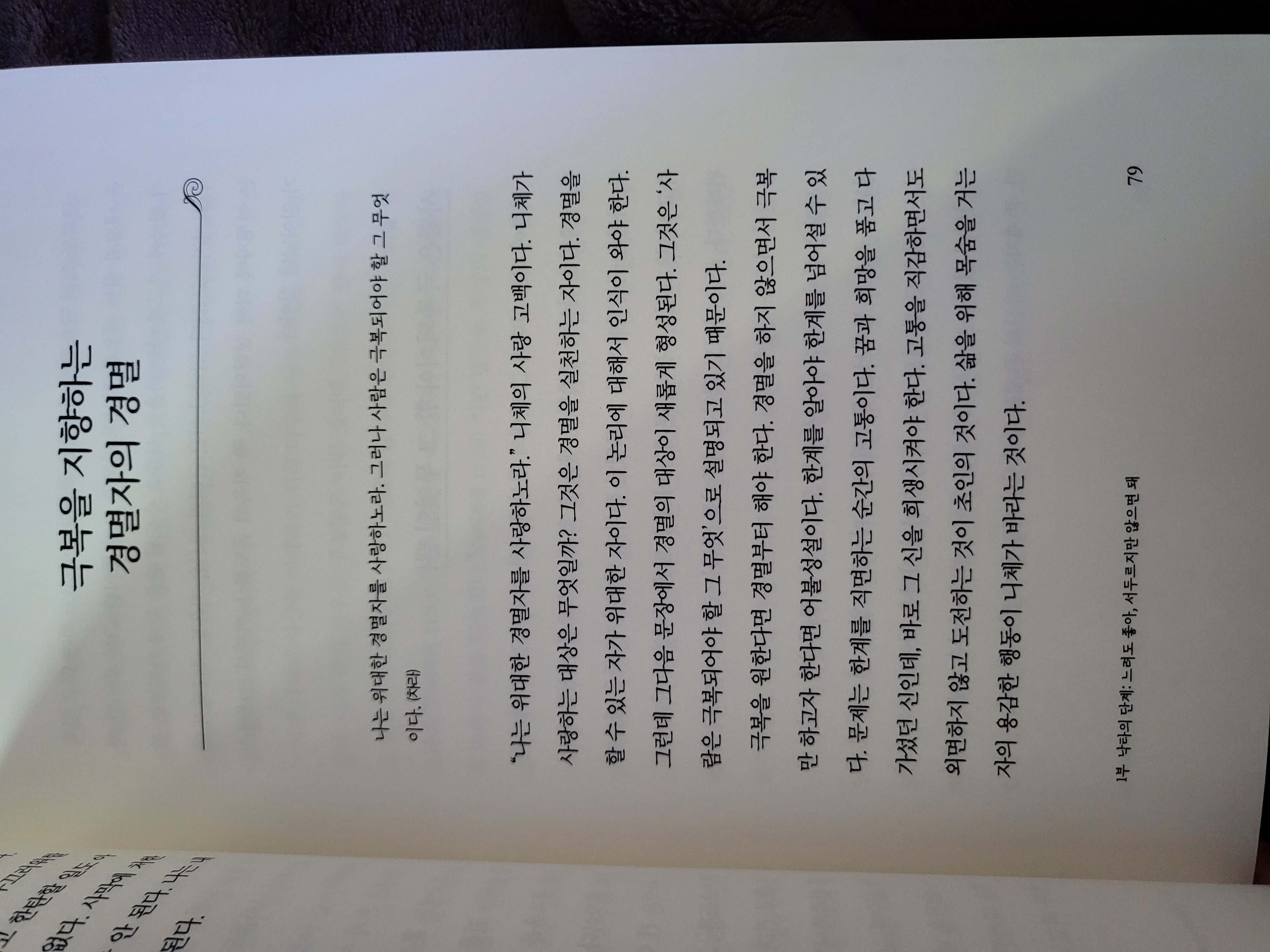 자기 안으로의 자기극복, 나를 이해하였는가? 한계를 깨닫고 그것을 넘어서는 인간 스스로 초인이 된다는 것 바로 니체처럼 사는 것이라고 말하고 있어요. 인생이란 죽을 때까지 끝나지 않으므로 하나의 한계를 극복하고 또 다른 한계를 설정하고 마치 질문을 하고 대답을 구하듯 지속적인 반복을 통해 앞으로 나아가야 한다는 것을 의미해요. [꽤 괜찮은 어른이 되고 싶다면 니체를 만나라]에서는 니체의 여러 서적들의 글들이 다수 인용되지만 특히 차라투스트라는 이렇게 말했다에서의 상징들 중 낙타, 사자, 어린아이의 단계에 따라 괜찮은 어른이 되어가는 이야기의 흐름을 만들고 있어요. "낙타는 짐을 지고서 사막이라는 현실을 지나간다. 사람은 먼저 낙타가 되어야 한다." "모든 짐을 벗어던지며 자유를 찾아 자기 삶의 주인으로 등극하는 것에 사자의 정신이 필요하고 저기를 동경하는 것이 아니라 여기를 지배하고 즐기는 것이 사자이다." "미리 정해둔 선과 악 같은 것은 존재하지 않는다. '삶 자체에 대한 긍정' 그것이 바로 어린아이의 것이다." 희망과 재앙은 하나의 사물에 지닌 두 개의 얼굴이고, 이것은 시각의 차이 바로 인간의 눈이 문제라는 뜻이라고 말해요. 마치 동전의 양면처럼 우리는 하나의 면만을 보게 되지만 그 이면에는 항상 또 다른 면이 숨어져 있게 마련인데요. 그렇기 때문에 무엇을 볼 것인지 결정하면서도 보지 못한 반대의 부분도 늘 염두에 두어야 하겠죠. 바로 대립이 보여주는 현상을 정확히 인식하고, 배타적 이분법이 아닌 포용적 이분법으로 반대의 목소리를 들을 줄 알아야 해요. ![]() 니체의 삶 자체도 어찌 보면 투쟁의 산물이라고 할 수 있을 텐데요. 가족의 기대를 버리고 접은 신학의 길 대학을 졸업하기도 전 임용된 문헌학 교수로의 삶에 안주했더라면 그냥 머물렀다면 죽어서도 기억될 불멸의 니체는 남아있지 않았겠죠. 어렸을 적 주위의 어른들은 언제나 이렇게 말씀하셨던 것 같아요. "어른이 되면~~ 할 수 있어, 하지만 지금은 안돼" 그렇지만 어른이 된 지금 원하던 것들을 할 수 있나 생각해 보면 그것도 아닌 것 같아요. 크고 가슴 벅차던 꿈들은 자꾸만 작아지고 사그라들어 어느 틈엔가 현실이라는 한 귀퉁이에 그냥 먼지처럼 붙어 있는 것 같기 때문이죠. 아직 어른이 되지 못한 것일까요? 그렇다면 괜찮은 어른 그것도 꽤 괜찮은 어른이 되려면 어떻게 해야 할지 니체의 안내를 받기를 바라며 저자는 글을 이어 나가고 있어요. 보다 접하기 쉽게 저자 본인의 경험이나 연구해 온 것들을 바탕으로 해설해 놓은 [꽤 괜찮은 어른이 되고 싶다면 니체를 만나라]는 자신의 본질적인 가치를 잃어버리고 표류하는 나에게 삶이란 것을 직관할 수 있도록 비로소 자신의 내면을 마주할 수 있도록 도움을 주었다고 생각되어요. 늙어도 아름다운 사람들처럼 그렇게 되기 위해 지금 조금 더 괜찮은 어른이 되기 위해 노력해야겠어요. |