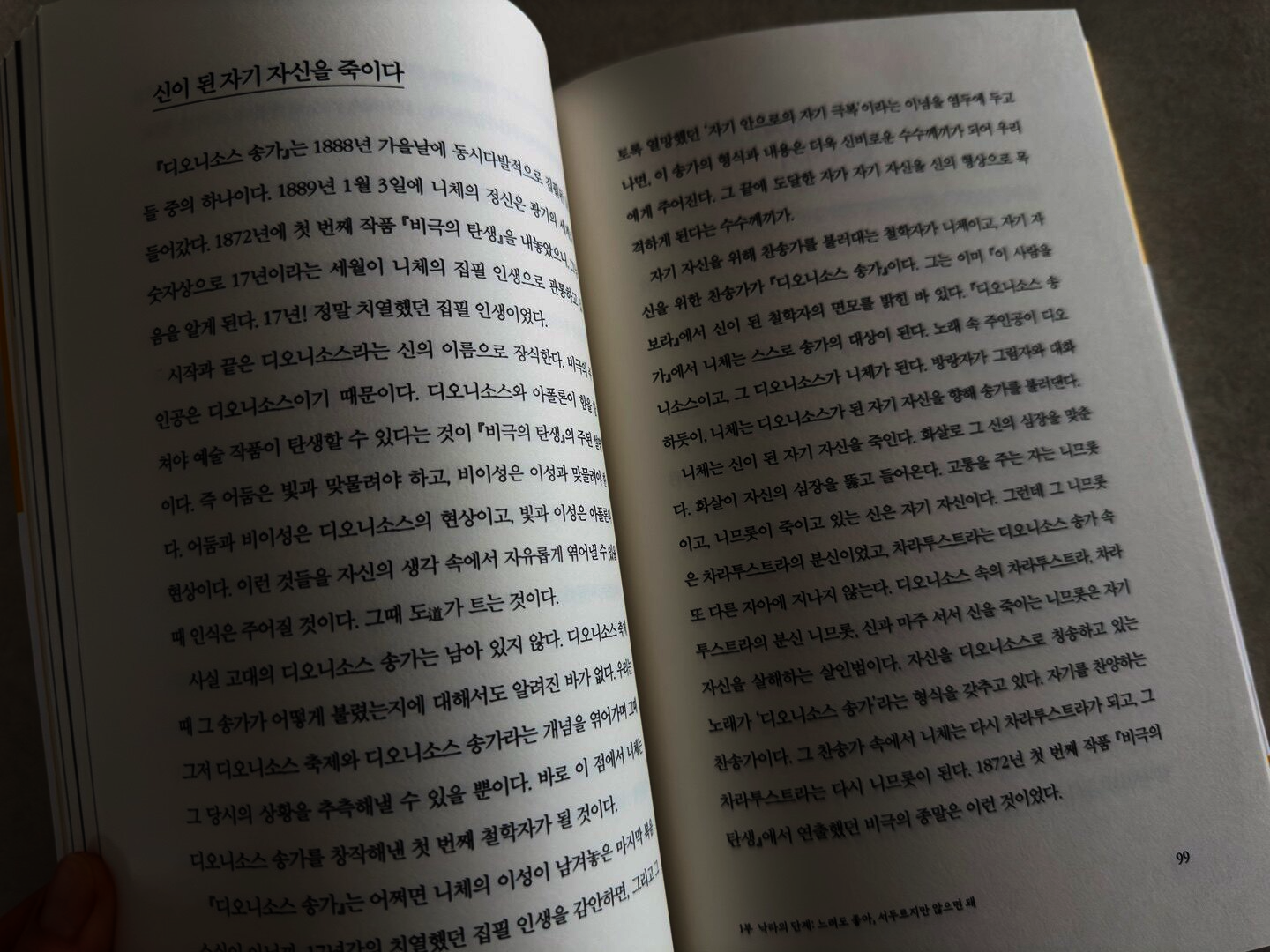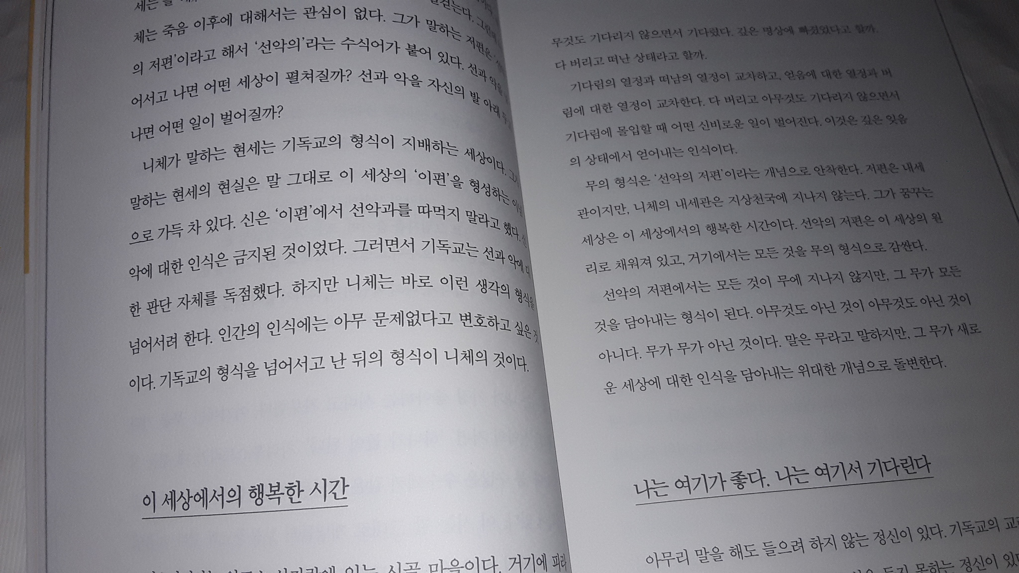 출판사로부터 도서 만을 제공 받아 직접 읽고 쓴 리뷰입니다. ![]() 몇 번을 읽어보아도 니체의 아포리즘을 반의 반의 반만이라도 제대로 이해하는 것은 불가능 했습니다. 그러다 보니 읽을 때마다 드는 생각은 자세한 해설서가 있으면 얼마나 좋을까 하는 생각이었습니다. 그런데, 서평 코너에 [초록북스]에서 출판한 [꽤 괜찮은 어른이 되고 싶다면 니체를 만나라]가 있는 것 아니겠어요?! 제 마음을 읽은 것 같은 책을 발견했으니 두 번 생각할 것도 없이 바로 서평 신청을 했습니다. 배송 온 책을 펼쳐 보는데, 중2때 멋모르고 '차라투스트라는 이렇게 말했다'를 읽은 후로 니체는 쳐다보지도 않다가 니체 광풍에 휩쓸려 자의 반 타이 반으로 읽은 책들이 온전히 이해 되지 않아 답답했던 날들이 주마등처럼 스쳐가며 답답힘도 이제 끝이구나 싶었지요. 이 책의 작가이신 이동용 작가님께서는 독어독문학을 전공하고 독일로 가 니체 학장인 스승 아래에서 니체, 쇼펜하우어, 괴테, 포이어바흐, 크르케고르, 바그너, 릴케, 카프카, 헤세 등 실존 철학의 계보에 선 이들의 철학을 전수 받았습니다. 그래서 인지 이 책에서는 니체의 아포리즘을 해석하며 위에 나열한 분들의 사상에 대해서도 니체의 사상과 비교를 해주고 있습니다. 또한 이 책은 니체 학장인 스승 밑에서 공부하신 분께서 쓰신 책답게 니체에 대한 전문가의 관점에서 해석해 주시는 것은 물론이고 작가님의 경험을 예로 들어 살명해 주시기 때문에 난해한 아포리즘을 이해하는데 많은 도움이 되었습니다. ![]() ![]() 이 책은 낙타의 단계, 사자의 단계, 어린아이의 단계, 이렇게 세 단계로 나누어 설명하고 있습니다.낙타의 단계는 자기와의 싸움을, 사자의 단계애서는 낙타의 단계에서 짊어 졌던 모든 짐을 벗어던집니다. 마지막 어린아이의 단계는 니체가 어린아이에 대해 많은 이야기를 남겨 놓지 않았지만 '초인, 어린아이. 어른'의 세 가지의 개념을 묶어서 설명해 주고 있습니다. 이 책에서 인상 깊었던 부분은 니체의 시 '질스 마리아'에 등장하는 '선악의 저편'에 대한 부분이었습니다. '질스마리아'는 알프스 산자락에 있는 시골 마을의 이름입니다. 이 시에 등장하는 '선악의 저편'은 니체가 말하는 천국을 의미하는데 선은 좋고 악은 나쁘다는 '배타적 이분법'을 버리면 보이는 천국입니다. 성경속 에덴 동산에도 선과 악이 공존했다는 사실은 익히 알고 있었지만 이상하다는 생각은 해보지 못했는데, 이 책에서는 신의 동산에 먹으면 안되는 나무 열매도 있고 악마의 본색을 숨긴 뱀도 존재하는데 그런 곳을 에덴동산 이라고 불렀다는데서 깨달음을 얻어야 한다고 말하고 있습니다. 생각해보니 신의 동산이라고 하면 선한 것만 존재하는 것이 마땅한데 말이죠. '사람은 신이다'라는공식은 니체 뿐 아니라 포이어바흐와 키에르케고르도 지속적으로 언급한 이야기 라고 합니다. 하지만, 니체가 '신은 죽었다'라는 파격적인 이야기를 한 데 반해 키에르케고르는 가명을 쓰며 소극적으로 집필 했고 포이어바흐는 기독교의 교리에 맞서기 위해 교리를 끊임없이 꺼내들지도 않았다고 합니다. 독일철학에 정통하신 분께서 글을 쓰셨으니 이런 비교가 가능한 거겠죠? 니체가 난해하다고 느끼시는 분들이시라면 이 책을 읽어보시면 이해하는데 많은 도움이 되실 거라고 생각합니다. 게다가 니체 뿐 아니라 다른 철학자에 대해서도 많이 언급하시기 때문에 더더욱 읽는 재미가 있었습니다. 답답했던 제 마음을 시원하게 풀어주셔서 감사합니다! ![]() |