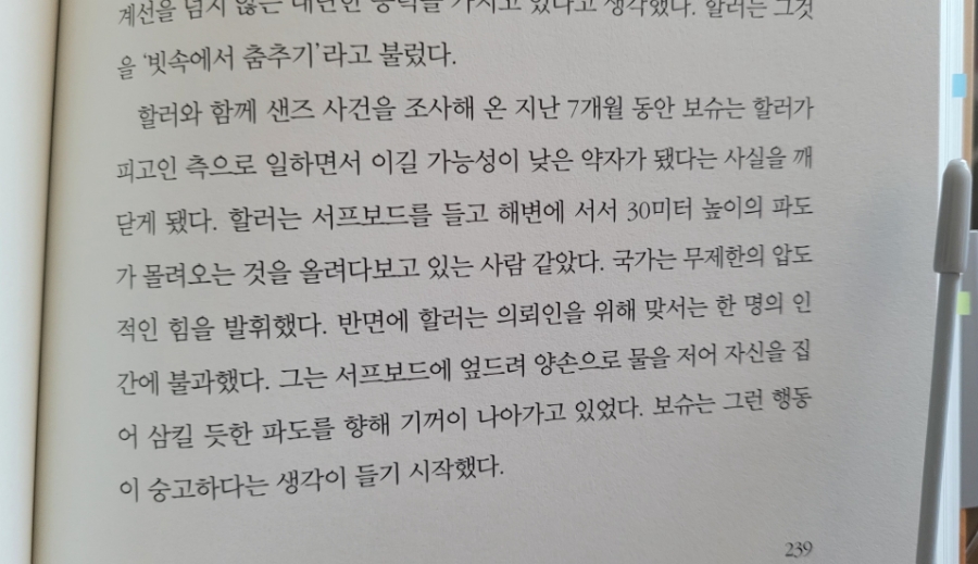 『회생의 갈림길』의 치밀한 스토리덕분에 꽤 두꺼운 책이지만, 끝까지 집중해서 책을 읽었다. 그러면서도 독자들이 『회생의 갈림길』이나 “링컨 차를 타는 변호사”에 더욱 열광하는 것이, 현실에서 먹는 고구마때문은 아닐까 생각이 들기도 했다. 수사상의 오류를 인정하지 않기 위해, 권력의 부패를 덮기 위해, 자신들의 권익을 지키기 위해 진실을 덮는 경우를 너무 많이 본 탓인지, 『회생의 갈림길』를 읽으며 현실을 생각해보기도 하고, 우리나라였다면 이런 상황이 어떻게 해결되었을지 상상해보기도 했다.