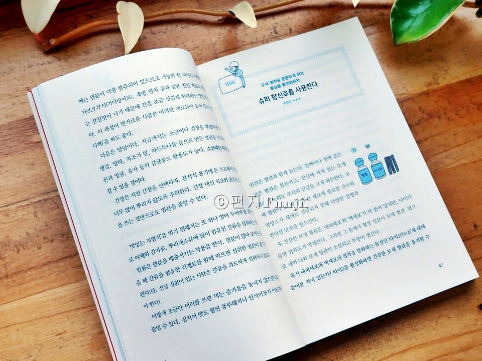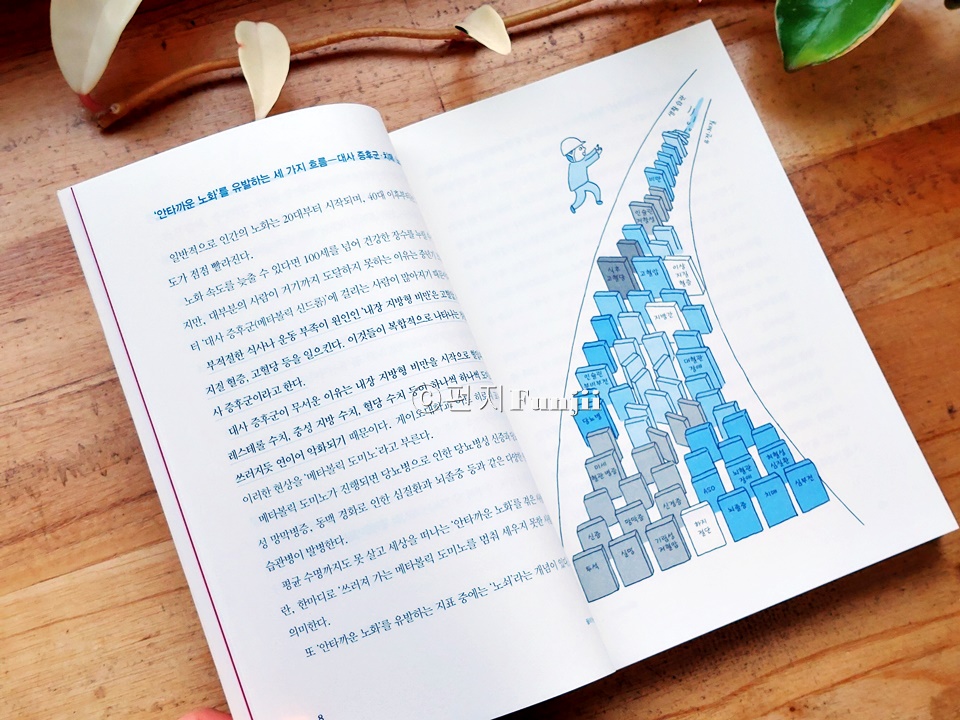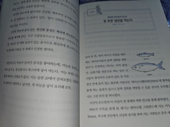 현대는 우리의 수명이 늘어 흔히들 100세 시대라는 말을 하는데요. 100세 시대 이왕이면 건강하게 살 수 있다면 더 좋지 않을까 생각이 들어요. 건강 수명 100세 습관에는 병들지 않고 즐겁게 사는 건강 습관 100가지를 담았는데요. 건강에 대한 헷갈리는 기본 상식부터 최신 의학 정보까지 이 책 한 권으로 확인할 수 있었어요. 100세까지 건강하게 살려면 60세 이후 40년 동안 만들어가는 습관들이 더욱 중요하게 작용하지 않을까 생각이 드는데요. 이 책에는 무려 30년 동안 노화 예방을 연구한 의사가 직접 선별한 건강하게 오래 사는 쉽게 따라할 수 있는 습관을 100가지로 정리하여 알려주고 있습니다. 100세 시대가 당연한 세상에서 우리는 노화 예방을 위해 노력해 왔는데요. 우리나라도 고령화 사회로 진입한 지금 어떻게 하면 건강하게 늙어갈 수 있는지에 대해서 저 개인적으로도 관심을 가질 수 밖에 없더라고요. 2021년에 65세인 사람의 평균 여명은 남성이 19.85년, 여성이 24.73년으로, 남성 2명 중 1명은 85세, 여성 2명 중 1명은 90세 정도까지 산다는 것을 의미한다는데요. 막연하게 다가왔던 100세 인생이라는 말이 수치를 보니 확 와 닿더라고요. 이러한 시대에 단순하게 오래 살기만 해서는 행복해질 수 없는데요. 장수를 누리며 행복한 말년을 보내는 게 거의 모든 사람들의 바람일텐데 아무리 오래 산다고 해도 누워 지내며 오래 사는 것은 정말 의미가 없겠다는 생각이 들어요. 돌봄을 필요로 하는 장수라면 그것이 오히려 나에게도 가족에게도 불행한 현실이 될 수 있지 않을까 그런 생각을 해보게 되는데요. 저자는 건강상의 문제가 없어 특별한 제약 없이 일상생활을 영위할 수 있는 기간을 건강 수명이라고 말하는데, 100세 시대에는 노화 속도를 늦추고 건강 수명을 조금이라도 늘려 건강하게 나이 먹는 것이 중요하다고 하더라고요. 그런데 노화 속도라고 하는 것을 우리 스스로가 직접 제어할 수 있다면 건강 수명을 늘리는 것이 막연한 상상 속 이야기는 아닐 것이라 생각하는데요. 나이가 들면 체력과 근력이 감소하고, 아픈 곳이 생겨나고 기억력이 감퇴되었다는 걸 느낄 때가 있는데 이런 신체 기능 및 생리 기능의 저하 속도는 사람에 따라 다르다고 해요. 시간의 속도는 일정하게 흐르는 데 반해 노화의 속도는 사람마다 다른데, 그 이유는 노화가 유전적 요소나 생활 습관 등과 복잡하게 얽혀 진행되기 때문이라고 하더라고요. 또한 이러한 노화는 유전적 영향도 무시할 수는 없지만 그저 유전이라 어쩔 수 없다 포기하기엔 이르며 오히려 생활 습관의 영향이 더욱 크다고 하더라고요. 습관을 개선하면 누구나 노화 속도를 제어할 수 있는데 일반적으로 인간의 노화는 20대부터 시작되며, 40대 이후부터는 그 속도가 점점 빨리진다고 하더라고요. 이러한 부분은 나이가 들면서 몸으로 더욱 깊이 느끼게 되는데 노화 속도를 늦출 수 있다면 100세를 넘어 건강한 장수를 누리 수 있지만, 대부분의 사람이 그에 도달하지 못하는 이유는 중년기 즈음부터 대사증후군에 걸리는 사람이 많아지기 때문이라고 하더라고요. 대사증후군은 부적절한 식사나 운동 부족이 원인인 내장 지방형 비만은 고혈압, 이상 지질 혈증, 고혈당 등을 일으키는데 이것들이 복합적으로 나타나는 것을 대사 증후군이라고 해요. 이 대사 증후군으로 인하여 여러 생활습관병이 발병하는 것이라고 하더라고요. 또한 노쇠는 영양 부족과 근력 저하로 인한 신체적 노쇠, 우울감과 인지 기능 저하 등에 의한 정신.심리적 노쇠, 고립된 생활이나 경제적 궁핍 등으로 인한 사회적 노쇠까지 3가지 인자로 구성 되는데 건강한 장수를 누리기 위해서는 신체뿐만 아니라 마음의 상태와 인간관계도 중요하게 작용하는 것이라고 하더라고요. 건강 수명 100세 습관 책에는 우리가 100세까지 건강하게 살기 위해서는 어떤 부분들을 알아야 하며 어떤 습관을 길러야 하는지를 알려주는데요. 평소에 이게 좋다더라, 저게 좋다더라는 식의 정보들은 많이 접하겠지만 정확한 정보들을 일목요연하게 추려 접하기는 쉽지 않았거든요. 근데 100가지 습관들을 차곡차곡 정리하여 수록해 놓았기 때문에 쉽게 확인할 수 있고 어떤 부분들이 필요한지 딱 머릿속에 그 개념이 잡히더라고요. 건강 수명 100세 습관은 5장으로 구성하며 식사/ 운동/생활 습관/ 뇌.정신 건강/의료로 나누어 정리되어 있는데요. 총 100가지의 습관을 각각의 주제에 따라 나누어 주제의 개념들을 쉽게 다가오고 이해할 수 있도록 설명합니다. 아무래도 우리가 먹는 식사 습관이 정말 중요하다는 생각이 드는데 아니나 다를까 1장의 식사 부분이 35가지로 가장 많은 분포로 설명되어 있더라고요. 배부르기 전에 숟가락을 내려 놓아야 하고 야채를 먼저 먹고, 탄수화물은 나중에 먹고요. 적게 먹더라도 하루 세 끼를 유지하는 것이 좋고, 국 하나와 반찬 셋 그리고 생선이 기본이 되는 식단이 좋다고 하더라고요. 그리고 맛있는 저염식을 먹고 슈퍼 향신료를 사용하고 질 좋은 기름을 쓰며 고기는 굽거나 튀기지 않는 것이 좋고 하루 적정 칼로리를 유지하며 일주일에 한 번 치팅 데이를 갖는 것도 좋으며 콩류 식