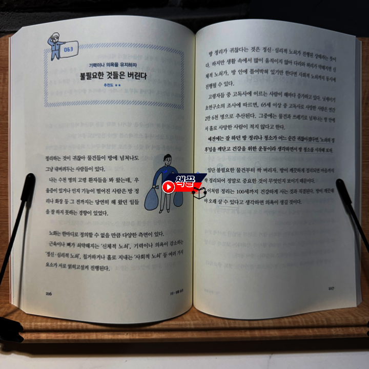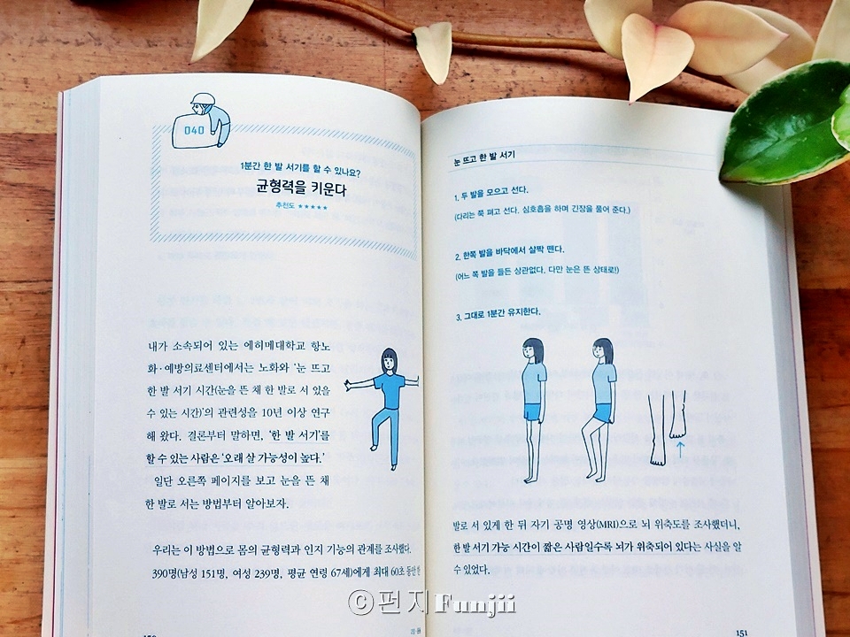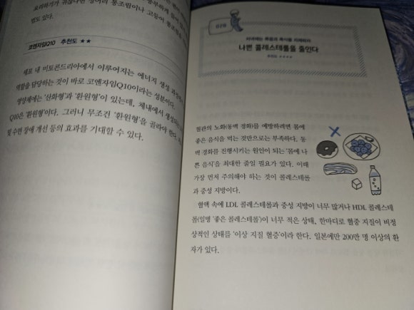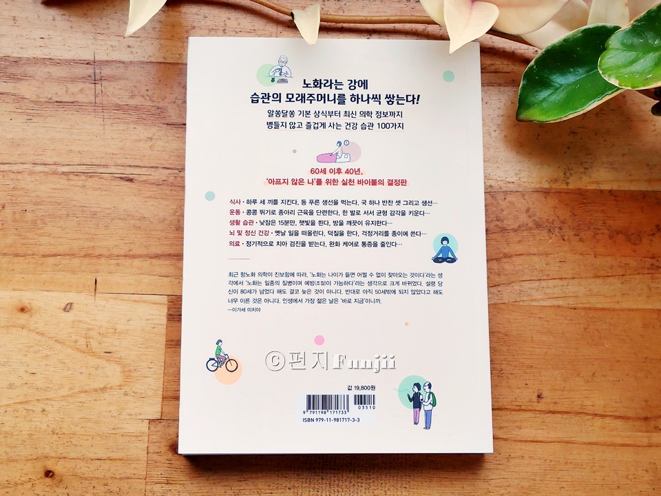 이 리뷰는 컬처블룸을 통해 출판사에서 도서를 제공 받아, 직접 읽고 작성한 리뷰입니다 30년간 노화 예방을 연구한 일본인 의사 '이가세 미치야'의 책입니다. 일본에서 항노화, 예방의료센터장을 하고 있는 저자는 '앞으로 남은 길고 긴 인생을 어떻게 살아야 할지' 소개하기 위해서 이 책을 썼다고 하네요 장수, 건강, 행복... 이 세 개의 키워드가 아마도 모든 사람이 원하는 게 아닐까요 하지만 저자는 장수를 하더라도 마지막 10년 전후는 누워서 생활을 하거나 치매를 앓는 사람이 많다고 합니다. 정말 무섭죠. 그럼 '누워서', 또는 '치매에 걸린 채로' 오래오래 살고 싶은 사람은 아무도 없을 거에요. 어떻게 하면 건강한 상태로 오래 살 수 있을까요 이 책에서 저자는 100가지 습관을 소개합니다. 그리고 초반에 분명하게 "모든 습관을 실천할 필요는 없다'고 친절히 말해줍니다 그렇다고 어떤 것부터 시작할 지 저처럼 막막한 사람들을 위해 추천도를 표시해 두었어요! 식사, 운동, 생활습관, 뇌/정신건강, 그리고 의료 이렇게 다섯가지로 크게 분류를 했는데, 각각에서 별 2개부터 별 5개까지가 있어요 하나씩 체크해 가면서 보다보면 가벼운 마음으로 시작했지만 이것저것 실천하고 싶은 것들이 많더라구요 그렇다고 다 하자니 너무 부담이 되니 하나씩 차근차근 살펴보기로 합니다 이를테면 질 좋은 기름을 쓴다, 달걀을 먹는다, 유제품을 챙긴다, 꼼꼼히 양치한다, 방을 깨끗하게 유지한다, 자주 웃는다, 이런 것들은 이미 하고 있는 것들이에요. 반면 지키기 어려운 것들도 있어요 한 달에 한 번은 짧은 여행을 떠난다 귀여운 반려동물과 함께 산다 고기는 굽거나 튀기지 않는다 노릇노릇 고소한 냄새가 나는 음식은 자제한다 낫또를 먹는다 (우웩) 아.. 이런 것들은 너무 어렵네요 몇 가지를 보면 대략 60세 정도의 사람이 보기에 좋은 책인가? 싶은 것들도 있지만 미리미리 알아보고 생각하면서 살면 도움이 많이 되겠죠? |