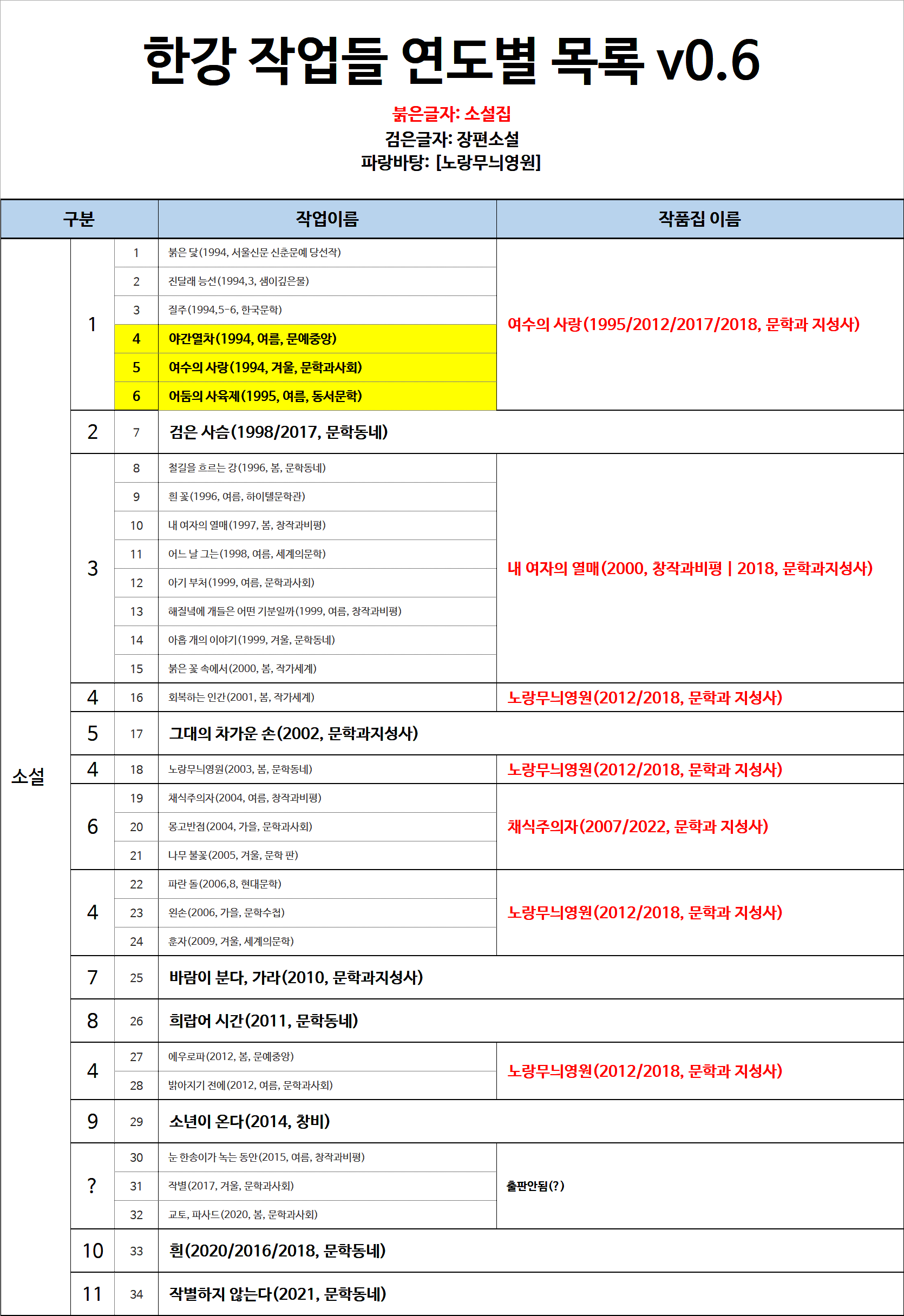 # 먼저, 한강 작가의 노벨문학상 수상을 대한민국 국민의 한사람으로, 진심으로 축하 드립니다. 그동안 피상적으로 작가님의 채식주의자 등 다수의 소설을 접하다가 이번 기회에 작가님의 전작품을 구매 및 소장하면서 모두 읽어 볼 요량으로 책을 구매했습니다. 특히, 여수의 사랑(단편 소설집) 중 '붉은 닻'은 작가님의 소설가로의 입문서(최초 등단 작품)로써 꼭 읽어보고 싶었고, 기타 작품들도 왜 한강 작가가 노벨문학상을 받게될 큰 그릇인지 보여주는 작품들이었습니다. 모두들, 작가님의 세월을 추적하기를 ... ## |