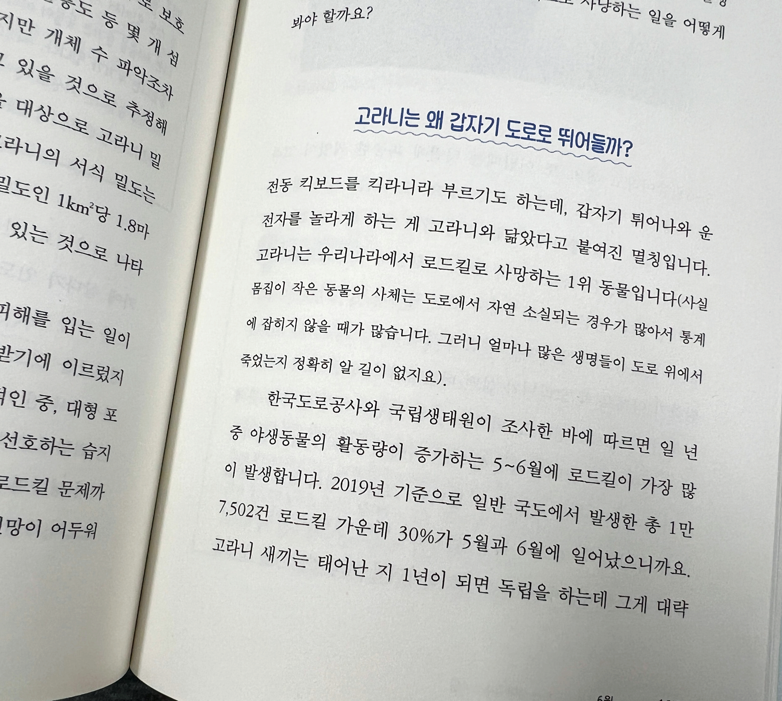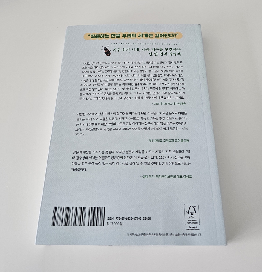 "해당 도서 및 원고료를 지원받아 직접 읽고 솔직하게 작성한 포스팅입니다." 최원형 작가의 『질문으로 시작하는 생태 감수성 수업』은 청소년들에게 자연과 생명의 소중함을 알려주는 특별한 책이에요. 단순히 환경 보호를 외치는 게 아니라, 스스로 질문을 던지면서 생각하는 힘을 키워주죠. 저자는 질문을 통해 우리가 더 넓은 세상을 보고 생태계를 깊이 이해할 수 있다고 말합니다. 책에서는 '눈' 이야기를 하다가 빙하기와 인류세 같은 주제로 자연스럽게 연결되는데, 이렇게 다양한 주제를 탐구하면서 독서의 재미를 더해줘요. 곤충과 동물이 자연에서 어떤 중요한 역할을 하는지 재미있는 일러스트와 함께 소개하고 있어서, 청소년들이 더 쉽게 이해할 수 있게 구성되어 있답니다. 특히, 이 책의 매력은 질문을 통해 생태적 감수성을 키워준다는 점이에요. 예를 들어 "곤충이 사라지면 무슨 일이 생길까?" 같은 질문을 던지면서 자연스럽게 환경에 대해 더 깊이 생각할 수 있게 도와줘요. 독서 노트도 함께 제공되어서 수업이나 독서 토론 시간에 활용하기 딱 좋고요. 책이 월별로 구성되어 있어서, 그 달에 맞는 생물들을 배울 수 있는 점도 재미있었어요. 9월에는 말벌 이야기가 나오는데, 우리가 해충으로만 알던 말벌이 사실 해충을 잡아먹는 이로운 곤충이라는 걸 알게 되었습니다.^^ 저자는 말벌을 무조건 없애야 할 존재로 보지 말고, 어떻게 인간과 공존할 수 있을지 고민해야 한다고 말해요. 이처럼 이 책은 우리에게 자연을 새롭게 바라보는 시각을 주고, 청소년들이 환경 문제를 스스로 생각해보는 기회를 제공한답니다. 내용이 생각보다 깊이있어서 초등고학년이나 중등이 읽으면 도움이 많이 될 것 같아요.^^ 초등 저학년의 경우, 부모님과 함께 읽으며 꼬리에 꼬리를 무는 질문들을 통해 과학지식을 쌓는것 뿐만아니라 논리적 사고력도 높이는 좋은 기회가 되지 않을까 싶습니다.^^ |