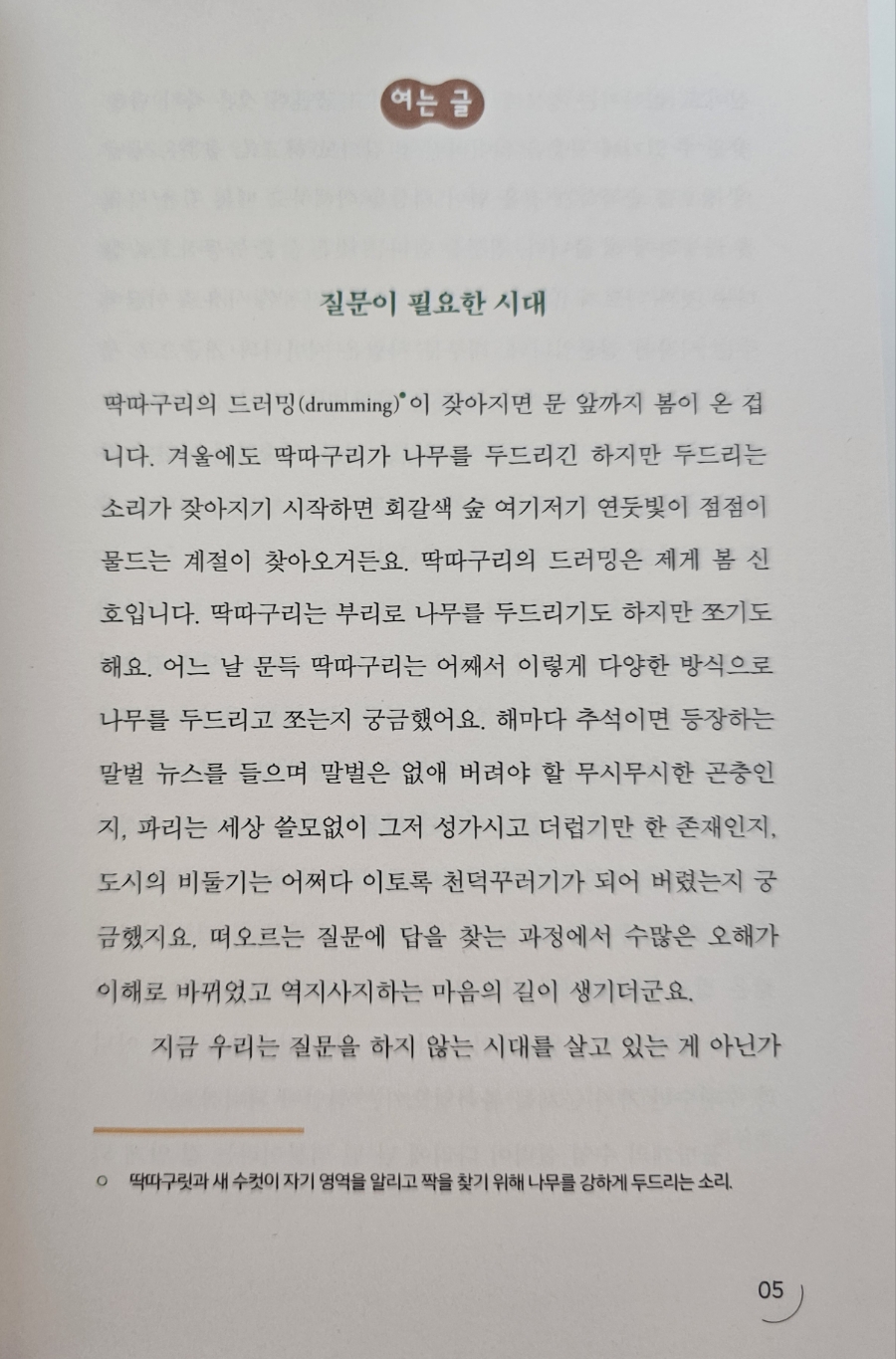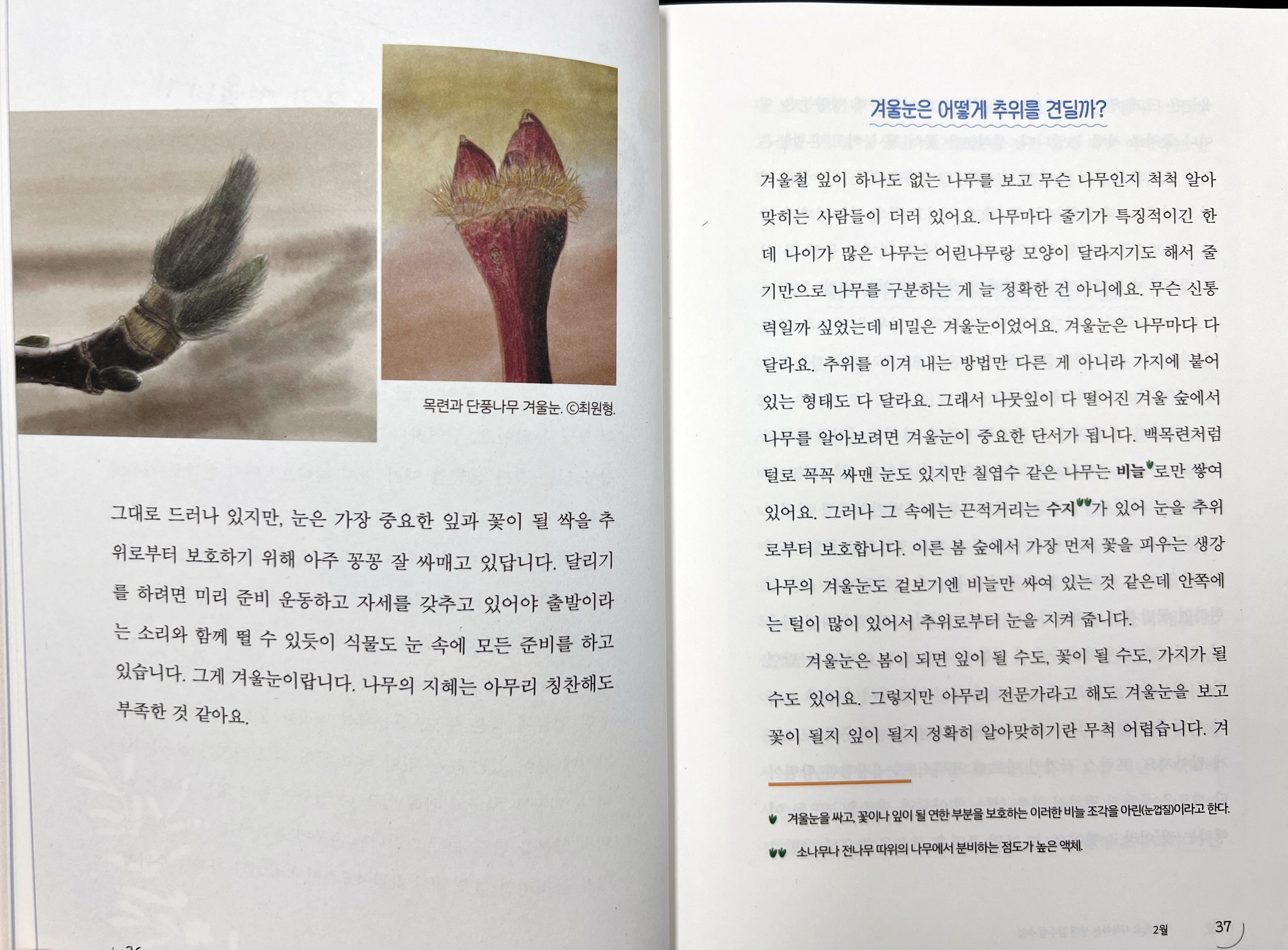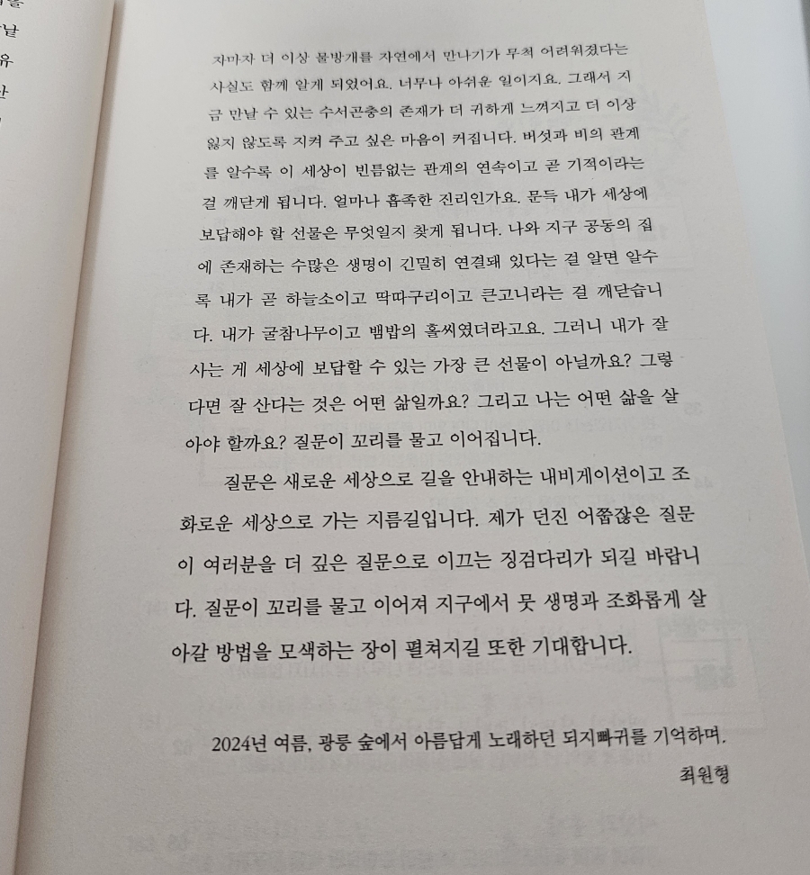 동식물이 적고 새소리가 빈약한 세계문화유산 조선왕릉은 누구 탓일까. 거기서 풀을 베거나 전지하는 노동자 때문일까, 풀을 베라고 업무 지시하는 공무원 때문일까, 왕릉 관리 지침이나 정책을 만드는 이 때문일까, 관리 부처인 국가유산청 때문일까, 아니면 깨끗하게 관리하라고 민원을 넣는 시민들 때문일까. 남 탓하기는 쉽다. 그러나 따지고 보면 우리 모두 책임에서 아주 자유로울 수 없다. 함께 살아가야 할 동식물을 바라보는 관점, 환경에 대한 인식을 다시 점검해야 하지 않을까. 스스로 질문하고 생태 감수성을 예민하게 벼려야 하지 않을까. 그런 측면에서 “질문으로 시작하는 생태 감수성 수업”은 우리 모두 지금 당장 귀 기울여 보고 듣고 실천해야 할 지침이 아닐까 싶다. 봄 여름 가을 겨울, 사계절 내내 책을 뒤적이며.