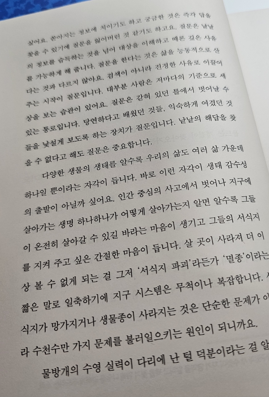 요즘 매미가 정말 시끄럽게 울어대죠? '매미는 참 목청이 좋다'고 생각했거든요. 매미는 온도와 빛에 민감한 곤충인데 일정 온도 이상 기온이 올랐을 때 운다고 해요. 예전과는 달리 밤에도 도시는 여러 불빛으로 환하고, 열대야 상황에서 밤에도 기온이 내려가지 않으니 매미는 잠을 못자고 울어댄다고 하네요. 이 이야기를 읽으니 '우리 때문에 그런건데 매미 소리가 시끄럽다고 매미에게 불평할 일이 아니구나'하는 생각이 어요. 이 책은 읽으면 읽을 수록 놀라움의 연속이었던 것 같아요. 그리고 제가 생태계에 한발짝 더 가까이 다가가는 기분이 들었어요. 질문 하나하나가 참 주옥같고, 내가 그동안 의문을 가졌지만 지나쳤던 것들에 대해 의문을 해소해주더라구요. 앞으로 아이와 산책을 하게 되면 아이에게 해주고 싶은 이야기들이 참 많아진 것 같아 너무 좋아요. 저도, 아이도 풍부한 생태 감수성을 갖게 되지 않을까 기대됩니다. #질문으로시작하는생태감수성수업 #블랙피쉬 #생태감수성 #환경인문학 #책세상 #맘수다 #책세상맘수다카페 |