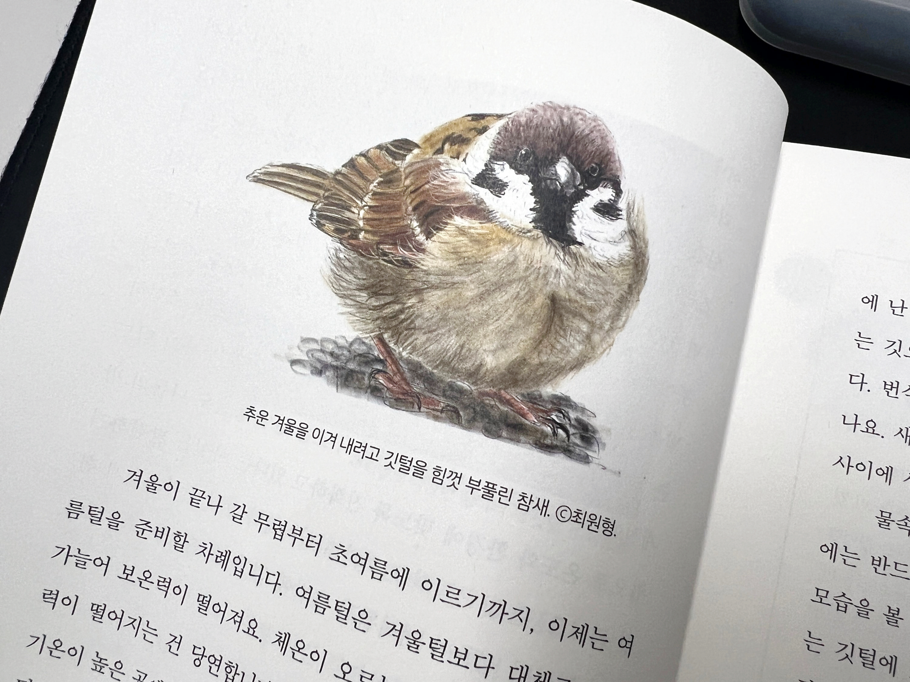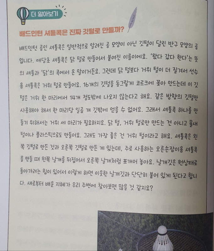저는 또한 각 장마다 있는 '더 알아보기'코너도 너무 흥미로웠어요. 이 주제에서 '털과 깃털'에 대해 다루었다면 그 부분에서 더 나아가 관련 지식에 대해 알려줘요. 배드민턴의 셔틀콕이 깃털로 이루어진 것은 다들 알고 있는 사실이지요. 셔틀콕이 깃털이 같은 방향의 깃털만 사용하고 날개깃의 원리가 담겨 있다는 사실도 놀라웠어요.