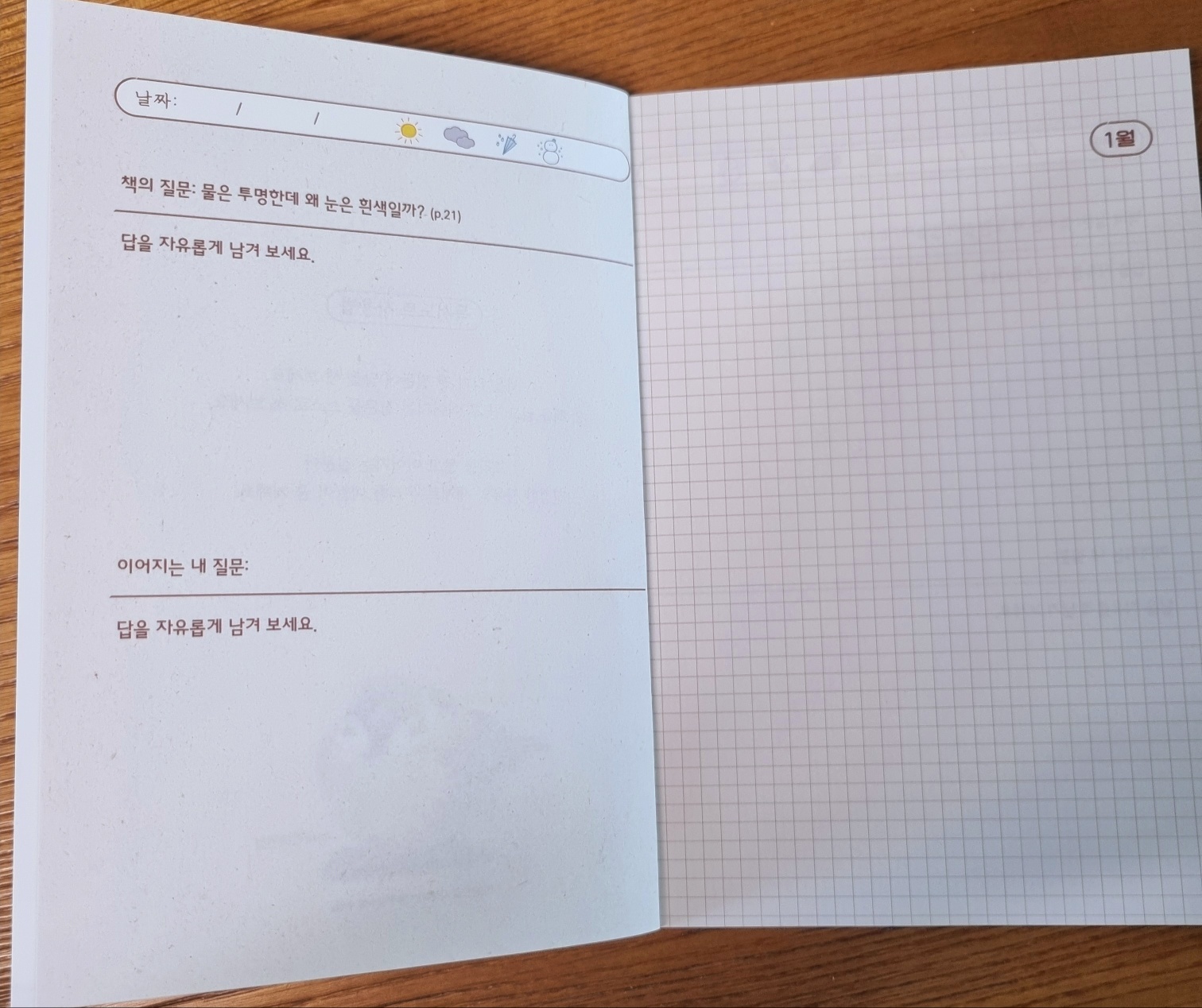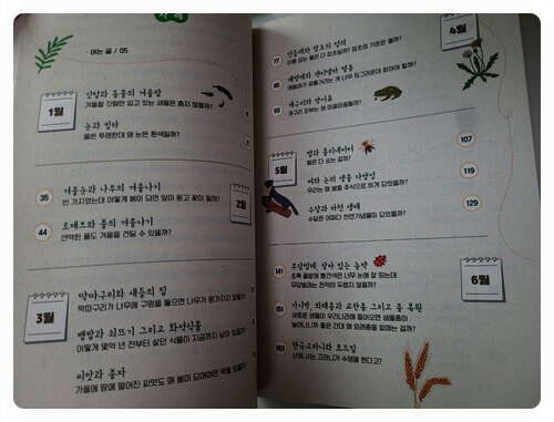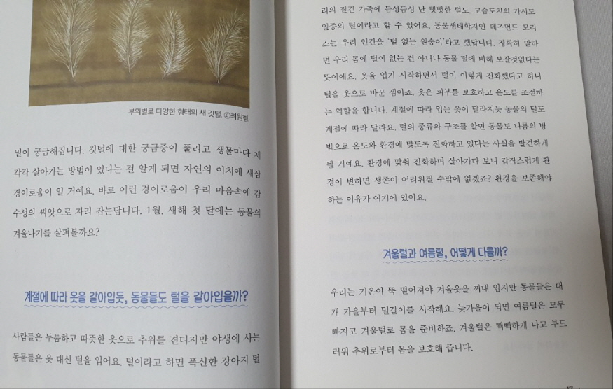 이 책은 월별로 나누어 관계되는 것에 대한 질문을 하고 답을 찾아나서는 형식으로 이루어져 있어요. 1월의 '동물들의 털과 깃털'에 관한 질문부터 평소에 궁금했지만 그냥 지나쳤던 거라 집중해서 읽어보았답니다. 아이가 가끔 저에게 이런 질문을 했어요. "사람은 겨울에 추우면 패딩을 입는데 동물들은 겨울에 옷 안 입어도 괜찮아?" 그럼 저는 그 질문에 "털이 있으니까 괜찮을 거야."라는 답을 했어요. 하지만 그런 답을 하면서도 그런데 정말 털만으로 겨울을 나는게 괜찮은 걸까 내심 걱정이 되면서 궁금했거든요. 동물들에게 여름털과 겨울털이 있다는 사실을 이 책을 통해 알게 되었어요. 미리 가을부터 털갈이를 해서 겨울털로 몸을 준비한다고 하네요. 조류 역시 깃털갈이를 하고요. 새들은 추울 때 깃털을 부풀려 체온을 유지하기도 한다고 하네요. 역시 '자연은 정말 경이롭고 신비롭다'는 생각이 들더라구요.