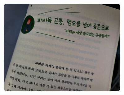 블랙피시 출판사로부터 도서를 제공받아 읽고 쓴 리뷰입니다. 119가지로 질문하는 열두 달 환경 인문학 <<질문으로 시작하는 생태 감수성 수업>> 먼저 이 책은 어린 아이가 있는 보호자나 자연이 궁금한 청소년, 어른들에게 추천하는 책이다. 어릴 적 아이는 '왜?"가는 질문을 많이 한다. 궁금한 것이 정말 많은 아이들. 지금 어린 조카는 정말 여러가지 질문을 한다. 이 책을 읽으면서 조카 생각이 많이 났다. 이 책을 가지고 어린 조카와 같이 보고 싶다는 생각을 했다. (참고로 나의 아이는 학원 다니느라 너무 바쁨요..) 목차의 편집 보소.. 와우.. 어쩜 이리도 따뜻함이 느껴지도록 편집을 했을까... 자연에 대한 책이라서 그럴까.. 책을 보며 자연을 더 많이 느낄 수 있도록 목차를 만들어 놓았다. 와우... 책을 읽으면서 아... 진찌 왜 그럴까? 라는 생각을 참 많이 하게 되었다. 보통 너무 당연하다고 생각했던 것들이 '왜?'라는 질문으로 등장하는데 와... 아....그렇구나...생각하면서 읽었다. 이 책의 내용은 상식으로 알아두면 아이가 질문을 했을 때나 변에서 누군가 물어보았을 때 제대로 된 대답을 할 수 있을 것이다. 이 책을 가장 크 매력은 새로운 사실을 알게 해주는 '앎의 즐거움'이 무엇인지를 진정으로 느끼게 해준다는 것이다. 이끼와 같은 인생을 살아야 겠다는 생각을 하게 해준 책이다. 봄에는 왜 노란 꽃이 많을까? 와... 이런 생각을 해보지 않았다. 당연히 노란 꽃이 많지 뭐.... 제목을 보는 순간 정말 너무 궁금해졌다. 식물일 꽃을 피우는 이유는 꽃가루를 옮겨 줄 곤충을 유인하기 위해서라고 하는데 이 시기 활동하는 곤추은 파리목 등에가 있는데 특특히 노란색을좋아한다고 한다. (물론 노란색만 좋아하는 것은 아니라고 한다. 아... 이런 이유가 있었다니... 정말 놀랍다. ) 또 신기한 사실이 있다. 복수초는 1월부터 꽃을 피우는데 꽃잎의 특성으로 꽃 안의 온도가 5-7도 높다고 한다. 대박... 이래서 한겨울에도 꽃을 피울 수 있다니... 신기방기한 사실들이 많다. 새로운 지식을 아는 즐거움을 맛볼 수 있는 책이다. 이 책을 읽으면서 가장 놀랍고 신선한 충격을 준 식물이 있으니 바로 이끼이다. 이끼, 와 이끼가 이렇게 대단한 존재였는지 이 책을 통해 처음 알게 되었다. 나는 이끼가 뭐 그냥 이끼지 .... 뭐 그리 대단한 식물이겠나... 보통 때 이런 생각들을 많이 했는데 완전 반전 그 자체!! 나는 이끼와 같은 존재가 되고 싶다. 강인함, 삶에 대한 의지, 쓰임새... 이끼는 육지에 처음 올라와 다른 생명이 살 수 있는 기반을 닦은 개척식물이고 이끼로 외계생명체 실험을 했는데 생존율과 광합성 능력도 그대로였다고 한다. 우주에서도 그떡없는 식물이라니... 놀라울 뿐이다. 용암이 지나간 자리에서도 살 수 있는 식물이며 오염 물질 정화 능력도 뛰어나고 곤충과 동물들의 먹이가 되기도 한다. 더 놀라운 것은 이끼가 흡수력이 강해 알레스카에서는 기저귀로 이끼를 활용했고 1차 세계대전에서는 붕대로도 사용되었다는 점이다. 소중한 존재. 파리..파리... 너무 싫은 파리... 하지만 작가는 이 세상 모든 생명체는 다 존재 이유가 있다고 말한다. 병균을 옮기고 지저분한 곳에서 서식하기에 너무 싫었는데 동애등에라는 파리는 배설물을 분해하고 질병이 퍼지는 것을 막아준다고 한다. 분해자의 역할을 하는 파리!!뿐만 아니라 파리가 사라지면 초콜릿도 사라진다는 사리!!!(절대 안되는데..) 파리는 너무 미워하지 말자... 요즘 너무 더운 여름 에어컨을 켜고 시원한 방에서 <<질문으로 시작하는 생태 감수성 수업>>을 읽으면 더운 여름 즐겁게 보낼 수 있겠다. <<질문으로 시작하는 생태 감수성 수업>>강추!! 흥미롭고 재미있고 와.. 탄식이 나오게 만드는 책 추천! 추천!!! |