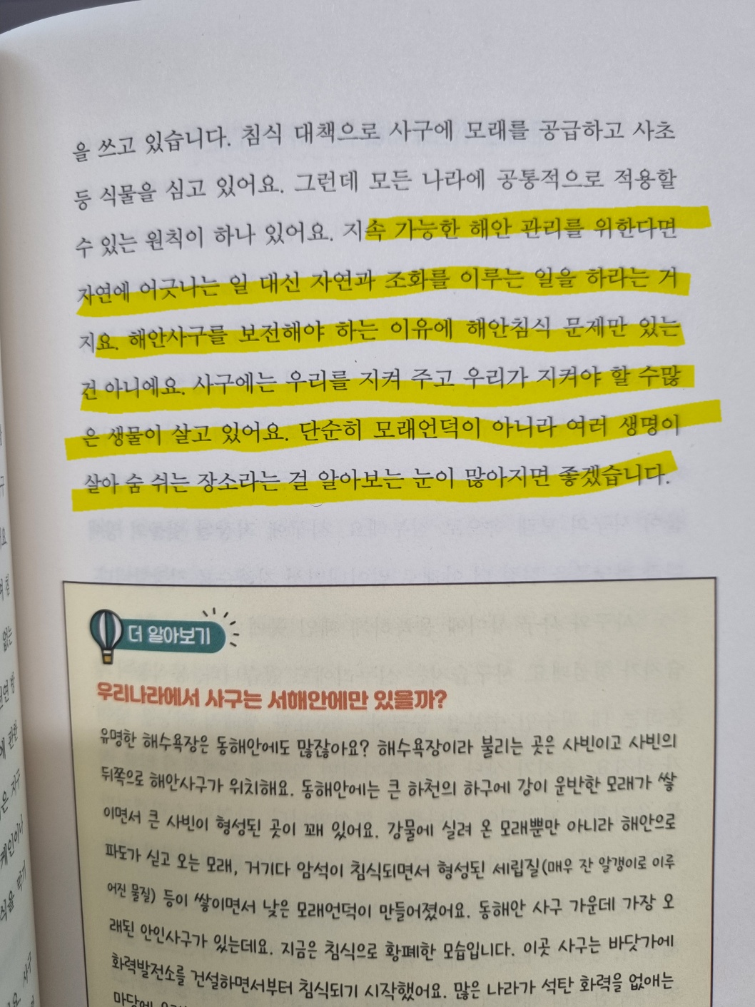 ![]() ![]() ![]() ![]() 왠지 내적 친밀감이 높은최원형작가님의 신간 도서! 작가님의 도서는 저의 생태 감수성 키우는데 지대한 공헌을 하였거든요. 사계절 기억책도 도움을 많이 받았는데 이번 생태 감수성 수업 책은 곁에 두고두고 심심하거나 궁금한 것이 생겼을때 자꾸 들여다 보는 책이예요. 119가지로 질문하는 열두 달 환경 인문학의 부제 답게 글의 제목은 모두 질문으로 시작합니다. 호기심이 쭉 올라가요~ 손수 그리신 세밀화 그림은 보는 재미를 더했어요. 생태 수업을 준비하며 공부를 하는 저에게 완전 딱 필요한 책이예요. 책을 읽으며 얼마나 무지했는데 주변을 살펴보지 않았는지 부끄러웠어요. "다양한 생물의 생태를 알수록 우리의 삶도 여러 삶 가운데 하나일 뿐이라는 자각이 듭니다. 바로 이런 자각이 생태 감수성의 출발이 아닐까 싶어요." 최원형 [여는 글 중에서] ??P.220의 소똥구리와 바닷가 모래언덕 파트에서는 우리나라에도 사막이 있음을 태안 신두리 해안사구를 소개해 주었어요. 해안사구는 자연 방파제로 폭풍과 해일로부터 농경지를 보호해 주는데 개발을 하려는 사람들로 인해 해안사구가 사라지고 있어요 <지속 가능한 해안 관리를 위한다면 자연에 어긋나는 일 대신 자연과 조화를 이루는 일을 하라는 거지요....> ??자연과 인간이 하나가 되어 서로 지켜줄 수 있도록 조화를 이룬다면 지금 현실의 기후까지는 오지 않았겠다는 생각이 듭니다. 생태와 자연 환경에 관심 많으신 분들 환경 수업을 하시는 분들께 추천 드리고 싶어요! #질문으로시작하는생태감수성수업 #최원형 #생태감수성수업 #과학도서추천 |