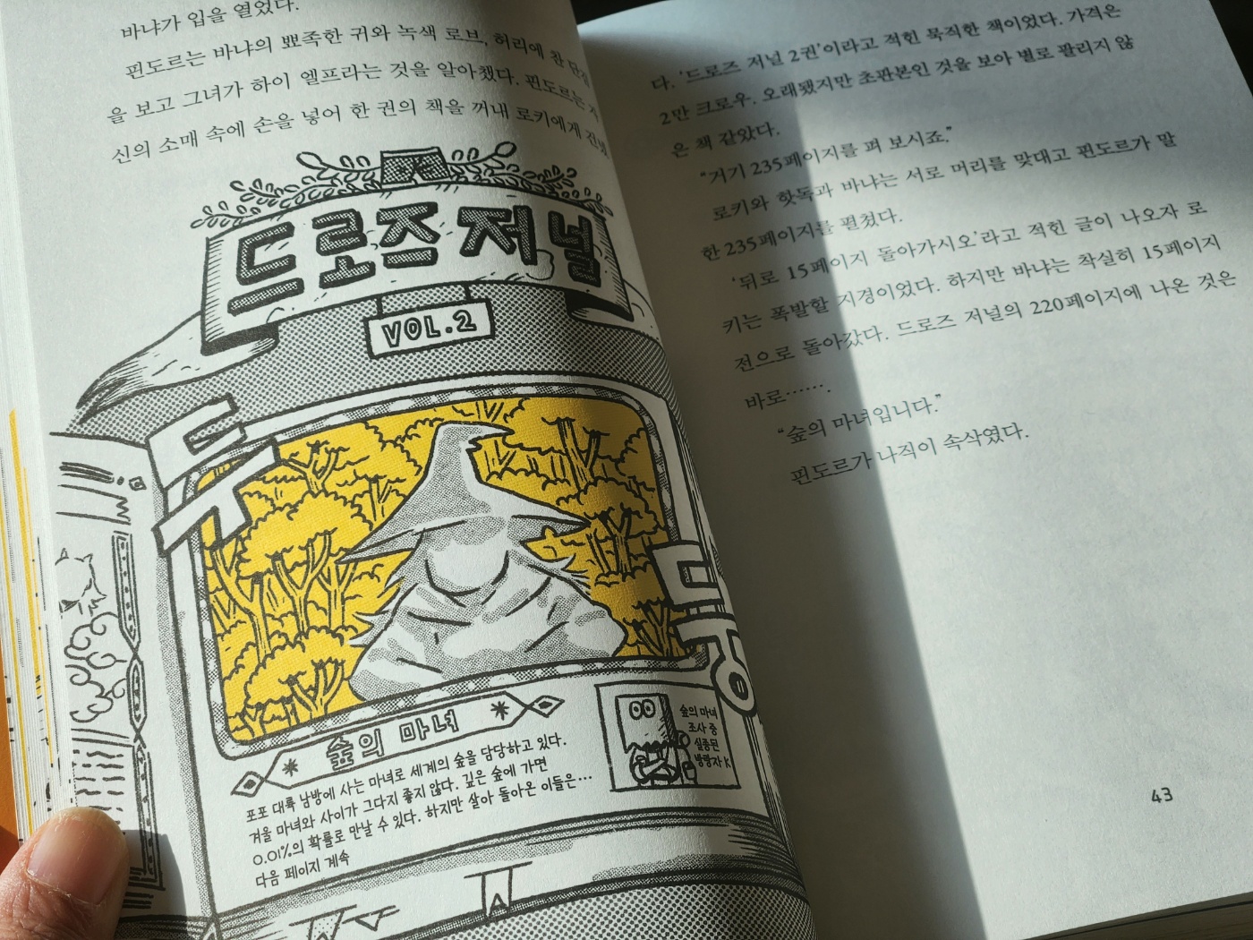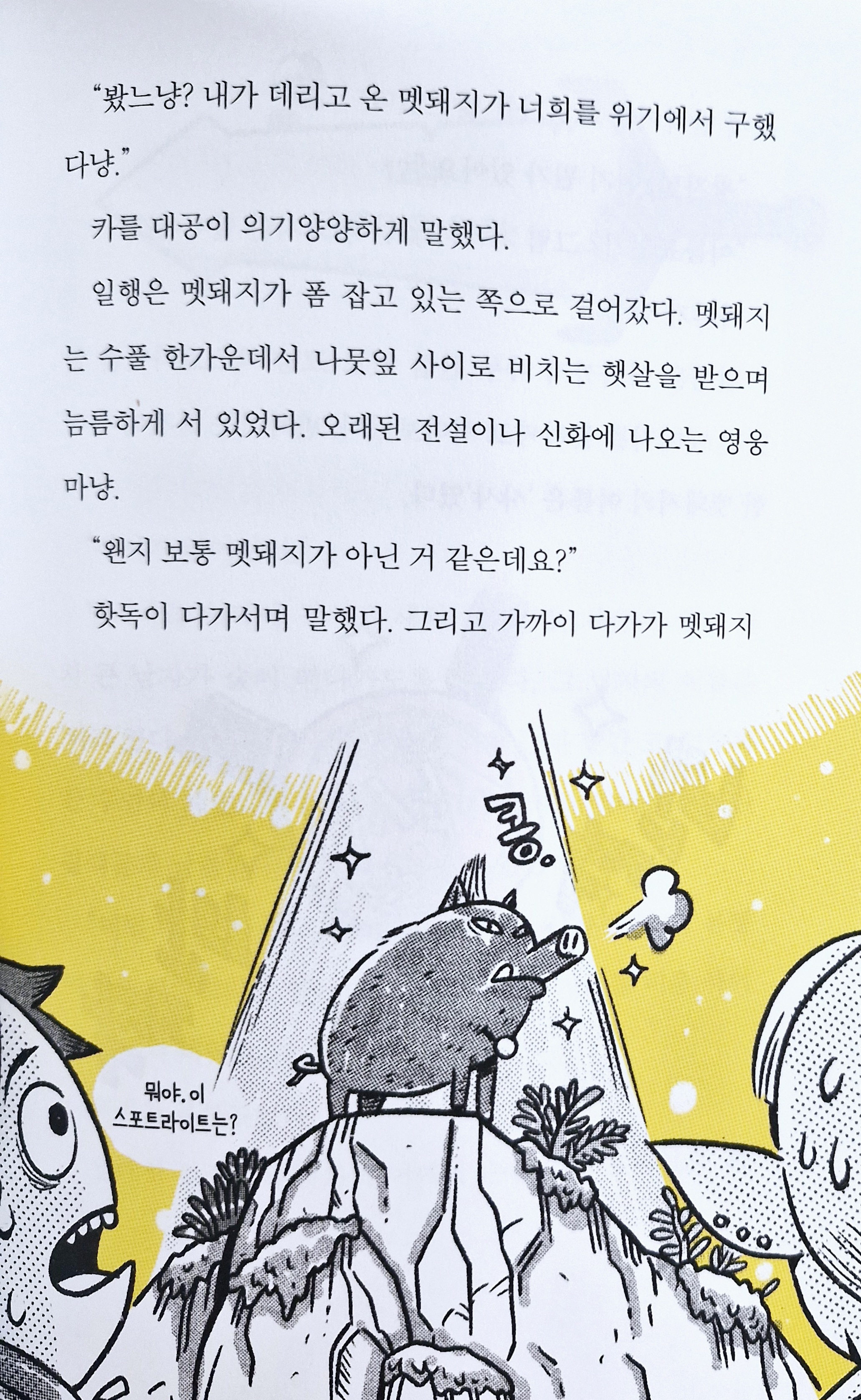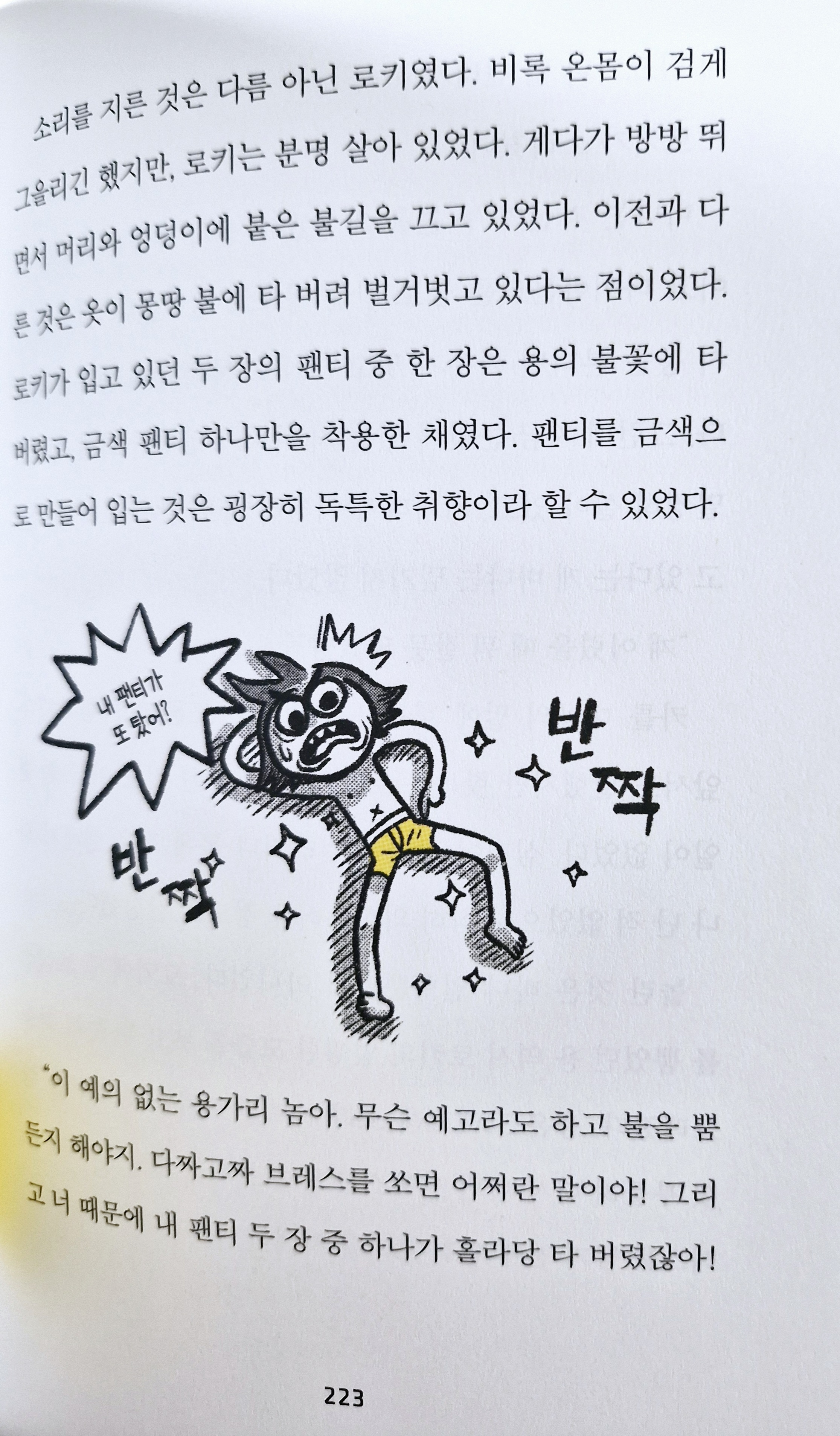![]() 드로즈 왕국 원정대 (2) 숲의 마녀와 마공 법사 (이 책은 서평단에 선정되어 읽어보고 솔직하게 쓴 후기입니다.) 봄이 찾아온 드로즈 왕국의 평화도 잠시, 로키 왕자는 바냐와 운명의 실로 묶여버린 마법을 풀기 위해 숲의 마녀를 찾아 떠나게 됩니다. 그와중에 카를 대공이라는 고양이도 만나고, 인간이 아닌 것의 공격도 받고, 보통 멧돼지가 아닌 멧돼지 샤샤도 만납니다. ![]() 로키 왕자 일행이 숲의 마녀를 찾아 헤매고 있을 때, 거대 개구리가 나타나서 일행은 개구리의 입 속에 먹힙니다. 그 안에서 드디어 숲의 마녀를 만나게 됩니다. 과연, 로키 일행은 숲의 마녀를 물리치고 거대 개구리 입에서 나와서 드로즈 왕국 원정대의 임무를 해결할 수 있을까요? ![]() 로키 왕자는 씬스틸러인 카를이라는 고양이와 멧돼지 샤샤의 주인의 등장, 수상한 노인과 마법 공학 법사들의 음모, 동굴에서 만난 불을 뿜는 용과의 결투 등 다양한 캐릭터들과 험난하지만 신나는 모험을 펼칩니다. 이번에도 유머러스한 대사와 흥미진진한 상황 전개로 무척 재미있게 읽었는데요, 빛나는 황금 팬티는 로키 왕자를 구할 수 있을까요? ![]() ![]() p. 236 "몸조심해. 드로즈 팬티를 입은 드로즈 왕국 #드로즈왕국원정대 #강경수 #시공주니어 |