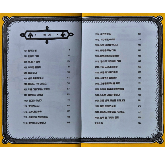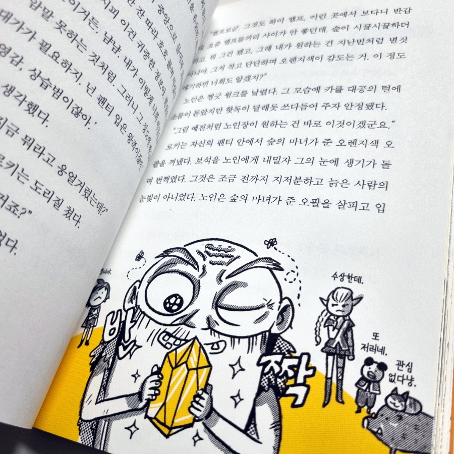 ![]() 1편 '끝나지 않는 겨울'에서 봄을 되찾기 위해 험난한 여정을 떠난 로키 왕자. '악몽에서 깨어나면 강철과 같은 굳건한 팬티가 왕국을 구해 내리라'라는 드로즈 왕국 예언처럼 첫 번째 미션을 성공적으로 마무리한다. 하지만 따사로운 드로즈 왕국의 평화는 오래가지 않는다. 더 흥미진진해진 모험 '숲의 마녀와 마공 법사' 로키 왕자는 다크 엘프의 흑마법으로 인해 자신의 망토 안에 하이 엘프 바냐가 숨어들었다는 것을 알게 된다. 왕자와 바냐는 운명의 실로 묶인 이 불편한 마법을 풀기 위해 숲의 마녀를 찾아 떠난다. 이번 모험을 하면서 다양한 캐릭터들을 만나게 되는데..... 먼나라의 지체 높은 귀족이라는 고양이 카를 대공, 멧돼지 샤샤, 동물과 교감하는 능력을 가진 드루이드 와카, 괴팍한 인상을 풍기는 숲의 마녀, 인간을 믿지 않는 하이 엘프 바냐, 의심스러운 거지 노인, 늘 말썽을 일으키는 고블린, 강철 같은 피부를 지닌 오우거, 포포 대륙에 사는 모든 생물 중 가장 위험하고 신비한 용까지. 다양한 캐릭터들이 얽히고설켜 많은 일들이 벌어진다. 한편 로키 왕자의 팬티 두 장 중 하나가 불에 타던 순간, 더 강해진 냄새를 맡고 미소를 지은 존재가 있었다. "뭐야, 왜 이런 카드 점이 나오는 거지? 이건 저주에 가까운 카드인데..... 그 꼬마 도대체 어떤 악연과 엮여 있는 거야." (203쪽) 숲의 마녀의 매직 카드에도 불길한 그림이 나타났다. 로키 왕자에게 무슨 일이 있는 걸까? _ 강경수 작가님만의 특유의 재미는 물론이고 자연스럽게 우정, 용기, 협력의 힘도 배우게 된다. 드로즈 왕국 원정대는 헤어짐이 아쉬울 정도로 멋진 조합이었다. 일국의 왕이 된다는 무거운 짐을 짊어지고 있는 왕자. 정상에 오르기 위해 한걸음씩 나아가는 아이들의 모습을 보는 것 같아 정이 간다. 학교와 집을 오가는 요즘 아이들에게 포포 대륙을 종횡무진하는 로키 왕자의 모험은 신선한 자극이 될 것 같다. 기존의 왕자 이미지와는 다른, 빈틈이 많은 주인공의 변화된 모습을 지켜보는 것도 즐겁다. 왜 하필 '드로즈'일까, 의문도 어느정도 풀렸다. 왕국의 이름을 '드로즈 왕국'으로 바꾸고, 왕자가 세 겹의 팬티를 입어야 하는 이유가 있었다. 100일 넘게 궁을 비웠던 국왕의 비밀도 조금씩 드러난다. 하지만 아직 많은 의문이 남아 있다. 용의 불길에도 멀쩡한 로키, 늘 의미심장한 미소를 머금는 핀도르의 정체는 아직도 알쏭달쏭. 앞으로 로키 왕자가 겪을 모험이 더 위태로워질 것 같은 예감. 3권도 기대된다. 술술 읽히는 줄글책을 찾는 초등학생에게 추천! #드로즈왕국원정대 #강경수 #시공주니어 #북스타그램 @sigongjr 출판사로부터 지원받은 도서입니다.