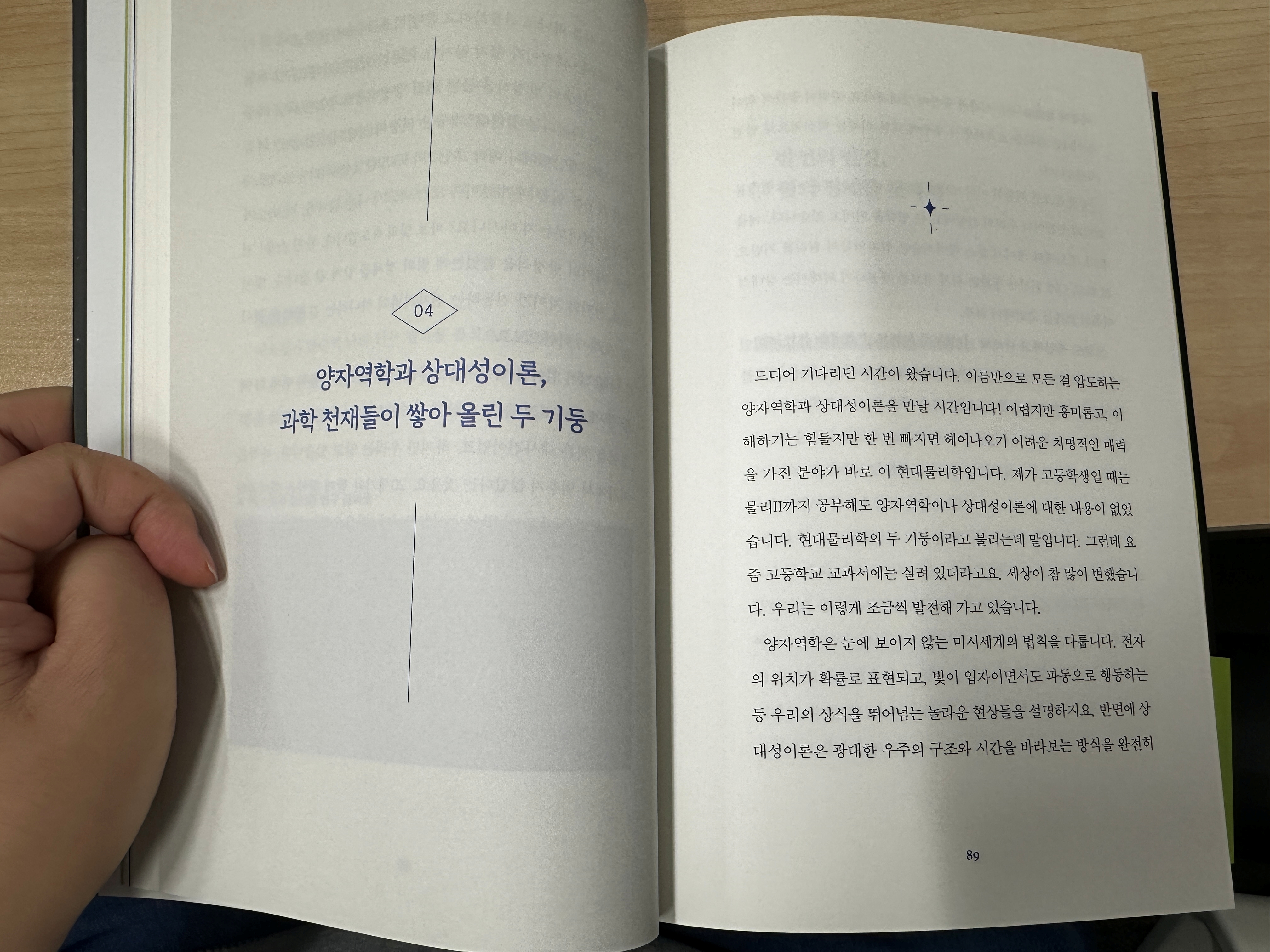 문과생이었지만 고등학교 때 과학을 좋아했던 기억이 있다. 특히 생물을 좋아했는데 유전자가 어떻게 구성되고 사람이 만들었는지를 들으며 수업이었지만 너무 흥미롭게 빠져서 들었던 기억이 난다. 하지만 시험을 보게 되면서 그 재미는 사라졌다. 분명 재미있었는데 시험을 보기 위해 보면 금방 딱딱하고 재미없게 변했다. 그래도 어른이 되고 시험에서 벗어나자 과학이 조금씩 재미있어졌다. 그러던 중 이 책이 나왔다는 광고를 보자마자 바로 구매해서 읽어봤다. 분명 어디선가 본 내용들이었다. 물화생지라는 말도 너무 익숙하고, 뉴턴의 운동 법칙, 화학 주기율표 등 분명 익숙하지만 잘 몰랐던 내용들인데 이번에 확실하게 알게되는 느낌이라 너무나 재미있었다. 양자역학은 고등학교 때 없는 내용이었는데 요즘엔 이런걸 배우는 모양이네. 고등학교 때 추억여행을 하는 것 같아서 시간가는줄 모르고 읽었다. 궤도님도 평소에 팬이라 유튜브 영상을 종종 보곤하는데 책도 뭔가 궤도님 말투로 읽히는 것 같아서 재미있었다. 고등학교 때 과학을 이렇게 좋아했다면 성적도 잘 받을 수 있었으려나 생각해보게 된다.![]() |