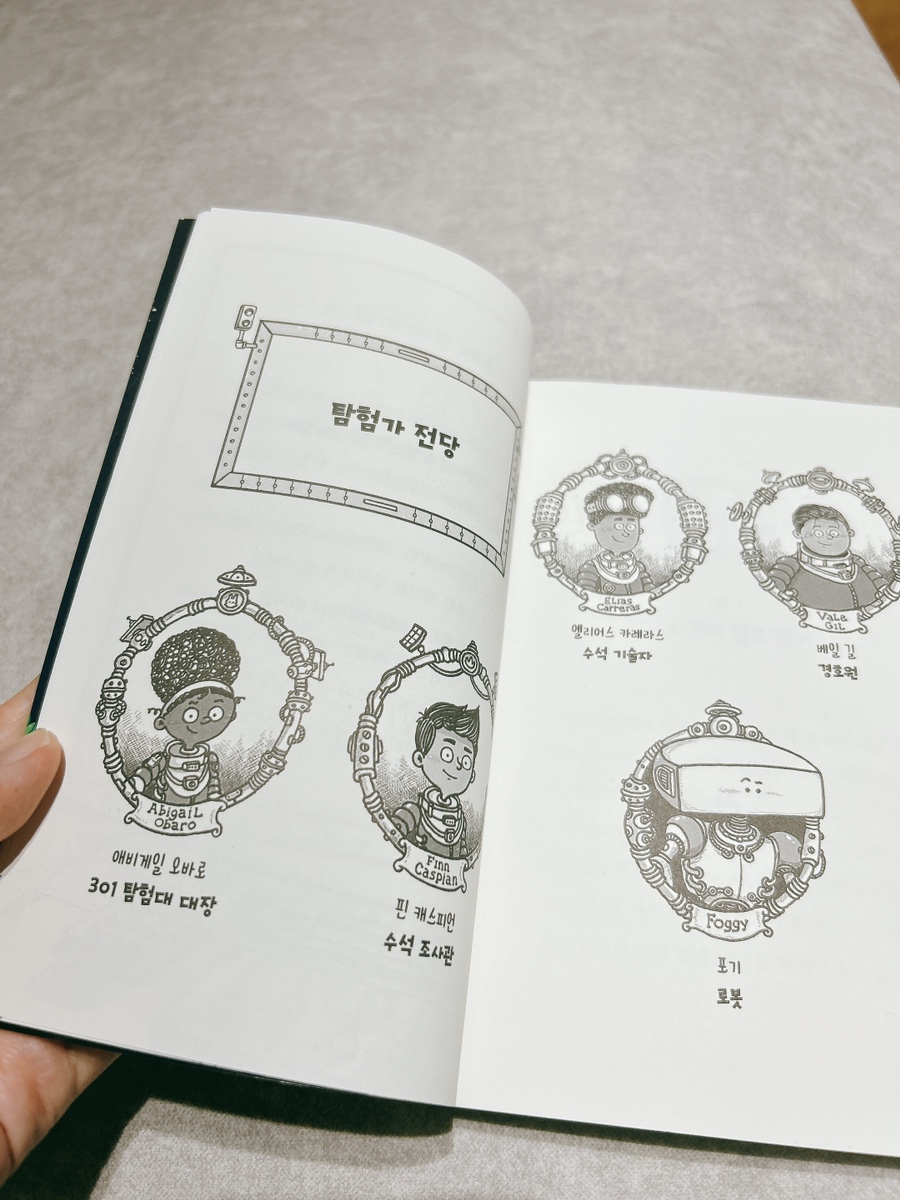 <핀 캐스피언의 우주 탐험대> 시리즈는 총 3권으로 구성되어 있어요. 손에 땀을 쥐게 할 정도로 짜릿한 모험이 가득한 어린이 우주 액션 판타지 소설 <핀 캐스피언의 우주 탐험대> 1권을 호진이도 읽어보았답니다. 1권의 제목은 외계 행성의 종말을 막아라! 입니다. 책 크기는 크지 않은 아담한 사이즈에요. 겉표지도 하드케버가 아닌 페이퍼북으로 가볍게 들고 다니면서 편하게 읽을 수 있는 크기의 책이었어요. 책 시작에는 모험의 주인공인 애비게일 오바로, 핀 캐스피언, 엘리어스 카레라스, 베일 길 그리고 foggy 로봇을 소개합니다. 여기서 핀 캐스피언은 최초로 우주에서 태어난 8살 아이라서 9살인 호진이와 나이대가 비슷해서 더 재밌게 읽을 수 있을 거 같았어요.