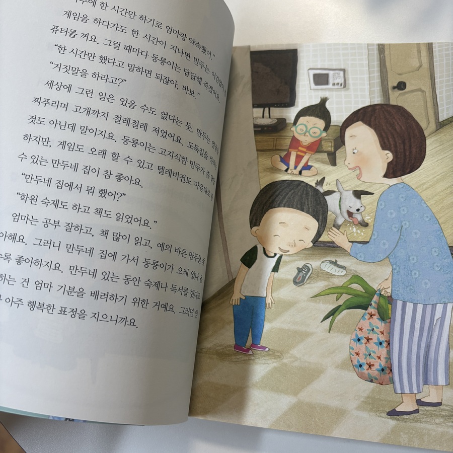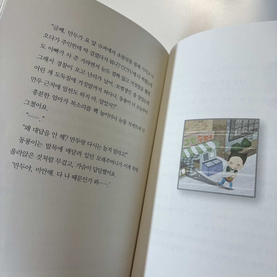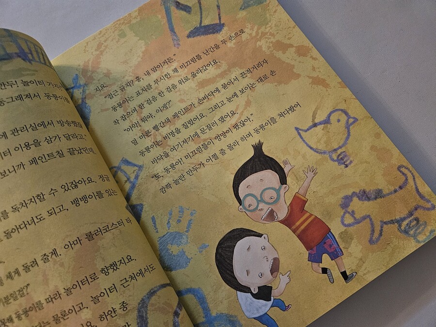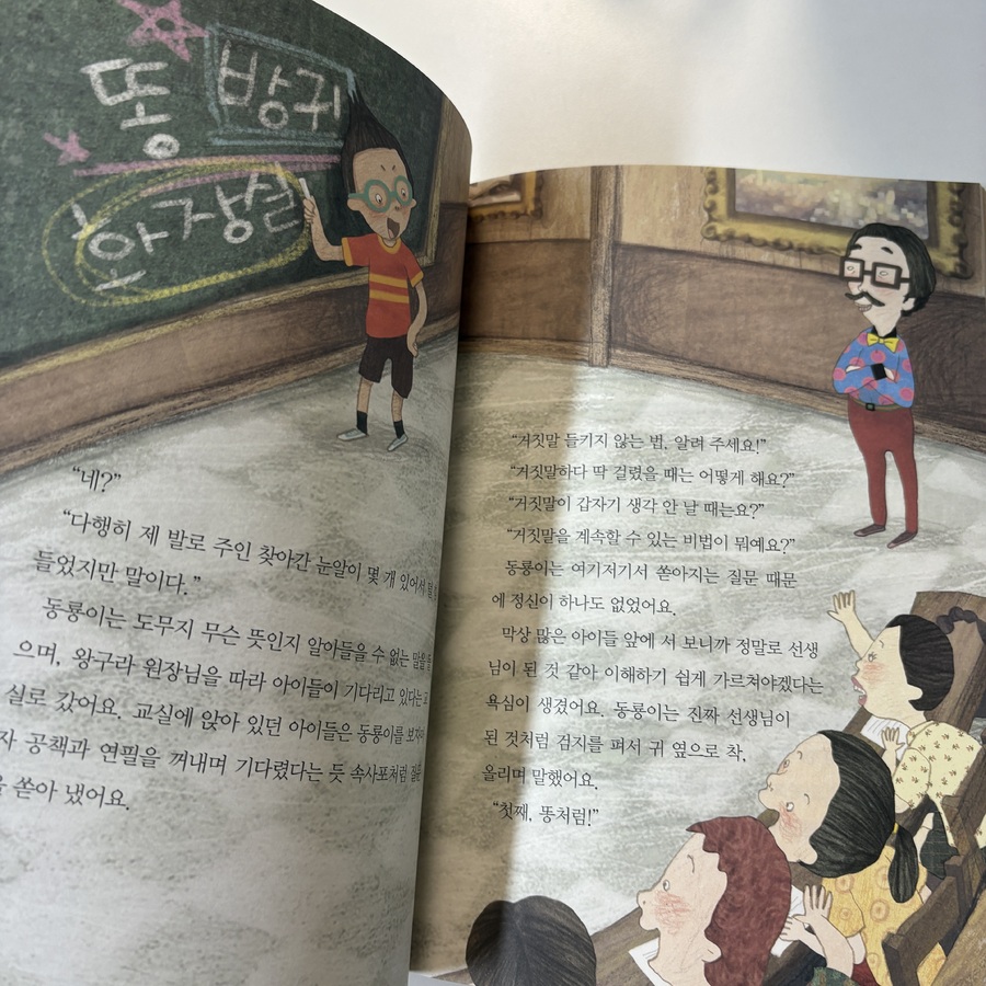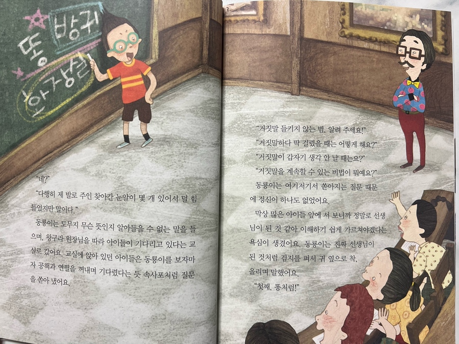 #도서협찬 동룡이는 누가봐도 장난꾸러기에 능청스럽게 거짓말을 하는 아이라면 민두는 엄마들이 좋아하는 선비상이지요. 민두는 동룡이의 거짓말과 만행을 다 알지만 선생님이나 부모님에게 이르지 않아요. 동룡이는 마음놓고 민두에게 거짓말과 잔꾀, 나름의 노하우를 다 공유하지만 민두는 동룡이의 기술이 어려워요. 수영장 가기가 싫대요. 😰 규칙을 지키지 않는 것도 거짓말이라며 “동룡이 오줌싸개 거짓말쟁이!”라네요! 동룡이가 뭔가 다 안다는 듯이 웃네요. 사실은 선생님의 속마음, ‘방학이 더 길었으면 좋겠다.’는 대화를 들었기 때문이에요. 어른들도 거짓말을 하지요. 작은 거짓말, 선의의 거짓말 등등 큰 거짓말(사기)을 하게 되면 벌도 받게 되지요. 저는 아이에게 한글을 떼야 미술학원에 갈 수 있단 거짓말을 했어요. 이 밖에도 육아를 편하게 하려고 거짓말을 자주 했어요. 반성합니다. 😭 아이에게 누구나 거짓말을 할 수 있지만 습관이 되거나 범죄로 이어지지 않기 위해 우리는 끊임없이 양심의 소리에 귀를 기울여야 한다고 알려줬어요. 어른들도 나름대로 거짓말을 조절하지만 정직하기 위해 끊임없이 정직한 마음에 귀 기울이고 있는 거라고 말해줬지요. 거짓말을 밥먹듯이 하는 재미있는 친구 VS 정직한 선비같은 심심한 친구 밸런스 게임도 해보았어요. 아무리 재미있는 친구라도 습관적으로 거짓말을 하는 친구보다 선비같은 친구에게 개그 책을 사주겠다는 아이입니다. 😆 현란한 거짓말 기술을 수강생들에게 알려주네요. 거짓말 스킬이 아이 눈높이에 맞게 웃기고 현란합니다. 습관적으로 거짓말을 하던 동룡이보다 더 짖궂은 거짓말을 하고, 동룡이에게 잘못을 덮어 씌우고, 급기야 슈퍼에서 물건을 훔치고 걸리게 되지요. 거짓말은 기본, 불량학생이 된 민두에요. 민두의 책상에서 거짓말 학원의 초대장과 자신의 특강 내용이 적힌 메모를 보자 동룡이는 자신때문에 민두가 변한 것 같아 양심의 가책을 느껴요. 슬프고, 속상하고, 민두가 잘못될까 무서운 동룡이는 민두를 원래 모습으로 돌리기 위해 학원에서 받은 상품을 찾기 시작해요. 이 책은 “거짓말은 나쁜거에요.” “거짓말 하지마!” 라고 말하지 않아요. 잘못인지도 모르고 그저 위기를 모면하기 위한 방법이라고 생각하는 것 자체부터, 습관적 거짓말, 작은 거짓말이 큰 거짓말이 되는 상황 등거짓말의 여러 모습과 잘못된 점과 후폭풍을 아이가 직접 깨닫게 하는 책이에요. 유치원생부터 초등학교 저학년 친구들에게 거짓말과 정직한 마음에 대해 재미있게 알려줄 수 있는 양심 교과서 같은 책이에요. 독후활동지도 있어 방학숙제도 성실하게 정직하게 수행할 수 있답니다. 😘 |