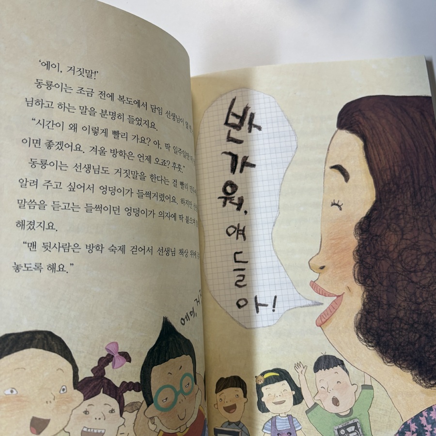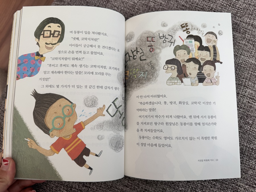 [거짓말 학원]은 거짓말을 알려주는 학원이 나오기는 하지만 저희 아이처럼 거짓말을 못 하는 아이들을 위한 책이 아니라 살짝 살짝 거짓말을 해본 아이들을 위한 책이었어요 ㅎㅎ 3학년 동룡이는 거짓말을 수준급으로 하는 아이예요. 친구 민두는 엄마가 일을 하셔서 집에 혼자 있는 시간이 많은데 엄마와의 약속을 잘 지키는 아이예요. 동룡이와 민두는 친구인데 동룡이는 민두가 이해가 되지 않아요. 엄마와 한시간 게임을 하기로 약속해도 오래하고 한시간 했다고 거짓말해도 되는데 약속을 지키는 민두가 이상하다고 생각해요. 여름방학동안 수영장에 다니는 만두와(민두의 별명) 동룡이는 어느날 수영장에서 준비운동을 하던중 동룡이가 쉬가 너무 급해서 수영장 물 속으로 풍덩 들어갔어요. 이 부분을 읽을때 아이들이랑 배 잡고 얼마나 웃었는지 몰라요. 그리고 아이들이 수영장에서 겪었던 에피소드를 많이 들려주더라구요. 함께[ 책을 읽으면 이런 소소한 재미가 생겨서 정말 좋더라구요. 동룡이가 [ㄱ ㅈ ㅁ 학원] 초대장을 받았어요. 아이들의 시선으로 강사로 초대장을 받았다고 생각해보니 정말 엄청 신나고 기분좋을 것 같더라구요. 뭔가 대단한 사람이 된것 같은 기분에 동룡이도 진짜 신이 났을것 같아요. 뒷일은 상상도 못 한채 ㅎㅎㅎ 멋지게 강의를 마치고 학원장님께 선물도 받고 돌아왔어요. 그날이후 민두가 이상해요. 전과는 다르게 거짓말을 술술하는 민두가 반갑기도 하고 이상하기도 했어요. 그리고 동룡이는 점점 민두가 거짓말을 하는 것이 이상한 기분이 들고 억울하기도 하고 손해보는 것 같은 마음도 들었어요. 그동안 동룡이가 거짓말을 했읋때는 느껴보지 못한 기분을 느끼게 된거죠. 동룡이는 점점 변해버리는 민두의 행동이 자신과 연관이 있다는 것을 알게되요. 그리고 선물로 받은 시간 쿠폰을 사용하기로 하죠. 동룡이와 민두에게 어떤 변화가 생겼을지 짐작이 되시나요? 결말은 비밀로 하고 ㅎㅎㅎ 아이들과 책을 읽으면서 거짓말을 왜 하면 안되는지 그리고 거짓말을 하는 상황이 어떤 경우가 있을지에 대한 이야기를 많이 나눠봤어요. 그리고 우리는 평소에 어떤 거짓말을 하는지 왜 거짓말을 하는지에 대한 이야기도 나눠봤어요. 많은 아이들이 거짓말 없이도 즐겁고 당당하고 항상 행복한 생활을 할 수 있다면 너무 좋을것 같아요. 그리고 거짓말로 순간을 모면 할 수는 있지만 더 큰 불행이 기다리고 있다는 것을 배울 수 있을것 같아요. 방학동안 아이들과 꼭 함께 읽어보면 좋을것 같아요! [출판사로부터 도서를 제공받아 아이들과 함께 읽고 작성한 주관적 서평입니다.] |
