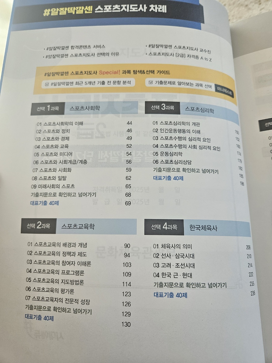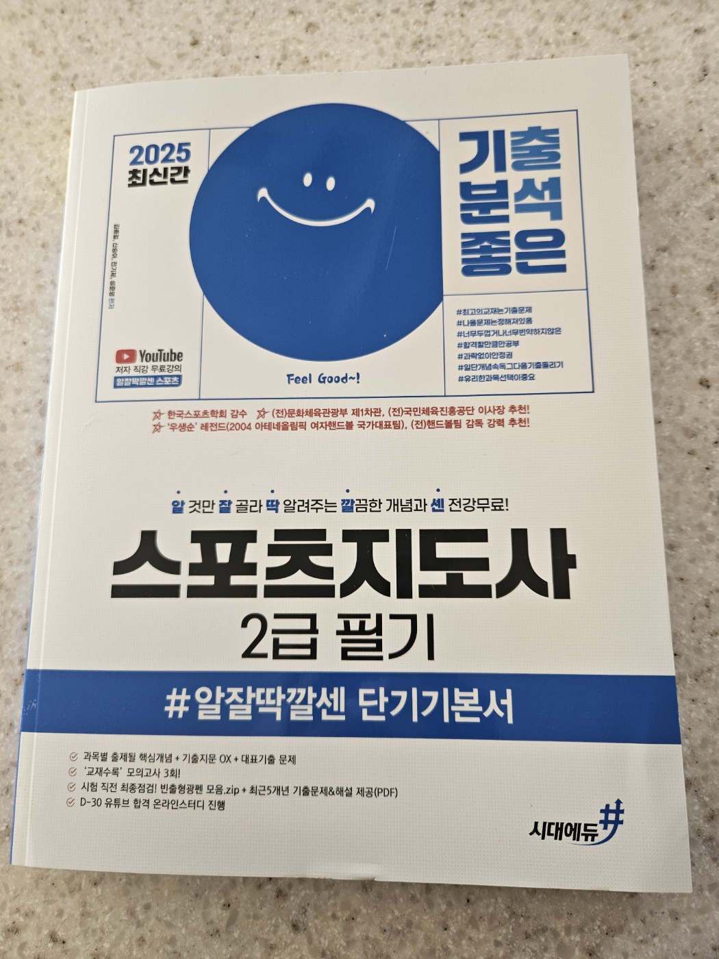 2025년 최신간 스포츠지도사 2급 필기책을 드디어 구입했습니다!두둥! 체육계 주요 인사들의 추천사를 보고 믿음이 갔고, 무엇보다 현직 교수님들이 집필에 참여했다는 점에서 내용이 체계적이고 실용적일 거란 기대가 컸어요. 책을 받아보니... 공부가 어렵게 느껴질 수 있는 복잡한 이론도 주요 내용마다 형광펜 표시가 되어 있고, 표로 깔끔하게 정리되어 있어 이해가 훨씬 쉬웠습니다. 특히 시험에 자주 출제되는 핵심 내용 위주로 구성되어 있어서 시간 절약도 할 수 있을 것 같아요. 덕분에 더 열심히 준비할 의욕이 생깁니다. 좋은 결과가 있기를 기대해 봅니다!![]() ![]()