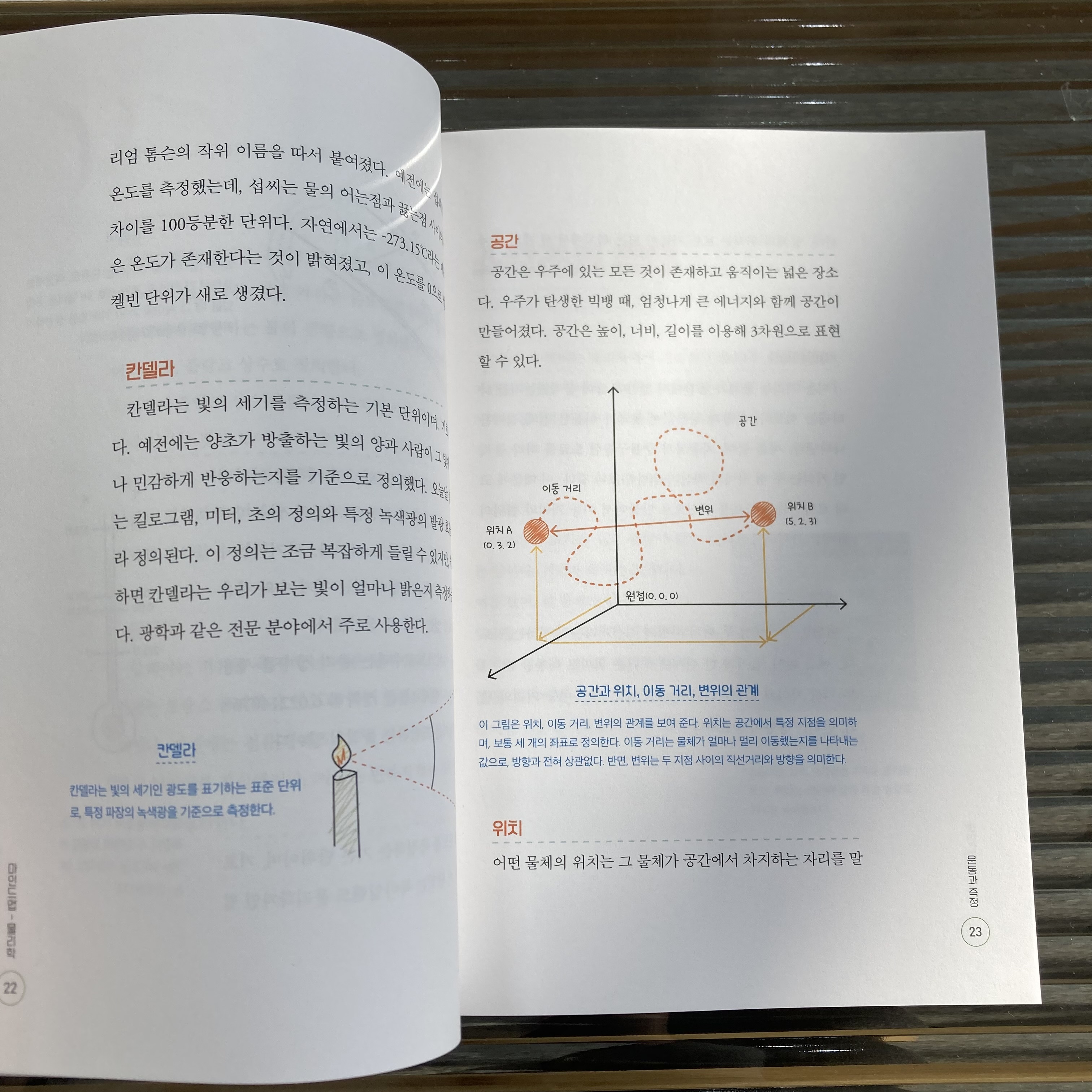![]() 가볍게 펼쳤다가 열공 모드로 진지하게 읽기 시작. 이 책은 [쉬움 - 중간 - 어려움]의 중간 단계로 노출하면 좋겠다. 책을 읽으면서 살짝 받은 충격. 내가 지금까지 알고 있던 개념은 '쉬운'단계였다는 것. ;;; 내가 알고 있던 kg = 무게 측정 단위 p20 물리학에서의 kg 정의 질량을 측정하는 기본 단위이며, 기호는 kg이다. 예전에는 1kg을 어는점에 가까운 온도에서 1리터, 즉 0.001세제곱미터에 해당하는 물의 질량으로 정의했다. 그런데 지금은 미터와 초, 플랑크 상수로 정의한다 여기서 플랑크 상수는 빛과 에너지가 .............. 그동안 읽어온 책과 연결되는 용어들에 눈이 반짝거리는 시간. 이 책을 조금 더 일찍 만났더라면 과학책 읽으며 이해도가 더 올라갔을텐데 하는 아쉬움이 든다. ![]() 개념 이해를 도와주는 단순하면서 친절한 그림들. 요즘 과학사에 폭 빠지고 코스모스 톺아보기 하면서 물리학의 매력에 빠지고 있었는데 그동안은 겉핥기 독서를 하고 있었다는 생각이 든다. 코스모스를 읽으면서 나오는 생소한 물리학 용어를 계속 찾아보고 있었는데 좀처럼 이해 안가던 동위원소를 아주 간단하게 한번에 이해 시켜준 책. ![]() 아이가 중학생쯤 되면 코스모스를 함께 읽으려고 계획중인데 코스모스를 읽히기 전에 꼭! 읽히고 싶은 책에 추가!! 과학을 좋아하는 청소년, 그리고 나 처럼 뒤늦게 과학에 빠진 성인들에게 필요한 물리학 용어 개념 필독서! * 출판사에서 도서를 제공 받아 솔직하게 작성한 후기입니다. #마인드맵물리학 #푸른숲주니어 #생각이자라는나무시리즈 #청소년과학 #청소년책 #과학책 #과학개념 #과학용어 #물리학 #힘과에너지 #운동과측정 #진동과파동 #전자기 #열역학 #현대물리학 #천체물리학 #물리학공부 #물리학개념 #책육아 #물리학언어 |