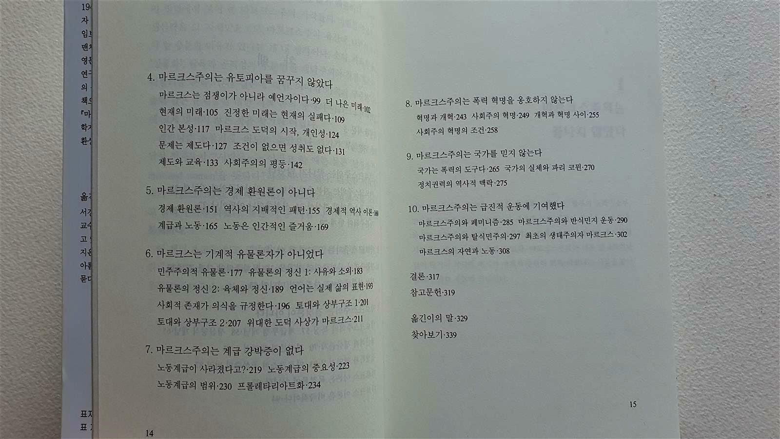('마르크스가 옳았던 이유' 차례) 저자가 서문에서 밝힌 대로 이 책은 마르크스 사상에 대해 비판하는 10가지에 대해 비판하는 내용이다. 따라서 책의 차례도 10개로 구성되어 있다. 각 장의 제목은 지은이가 주장하고자 하는 내용이다. 이렇게 주장하는 이유는 지은이의 주장과 반대되는 의견을 비판하기 위해서다. 그런데, 지은이의 주장과 반대되는 의견들을 살펴보면, 평소 내가 생각하고 있었던 마르크스 사상들이었다. 그 생각들을 저자와 함께 하나하나 논박하면서 살펴보는 시간은 마르크스를 좀 더 다르게, 깊이 있게 살펴보는 계기가 되었다.