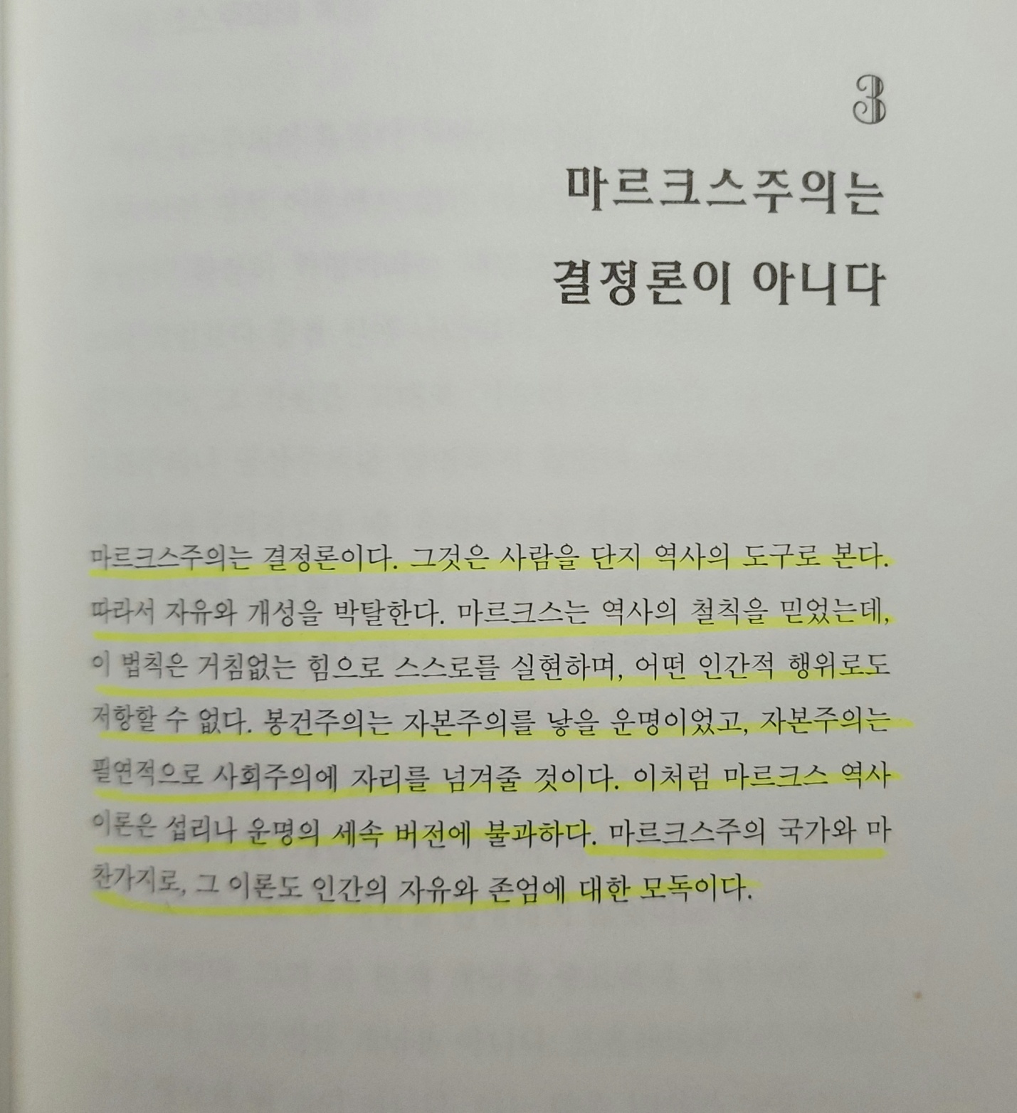 ('마르크스가 옳았던 이유' 내용 일부) < 지금 이 자본주의는 결국 반드시 사회주의로 나아간다 > 아니다. 인간의 미래는 정해져 있는 것이 아니라 변화하는 것으로 아무런 노력, 의지, 요구가 없이 저절로 어떤 미래가 오지는 않는다. < 마르크스는 '물질이 문명의 바탕이고 그 문명의 성격도 결정한다'고 말했다. > "그래서 물질 생산이 근본적이라고 주장한다. 그러나 펜이나 컴퓨터가 소설을 쓰는 데 필수 불가결하다고 말하는 것과 그것들이 소설의 내용을 결정한다고 주장하는 것 사이에는 차이가 있다 "(P151) 저자가 이렇게 비유를 들어 설명하니 확 와닿는다. 펜이 소설의 내용을 결정하지는 못하지......... 하며 공감한다. < 좀 더 깊이 있는 마르크스 사상의 이해 > 책은 점점 더 깊은 마르크스 사상으로 인도한다. 우리가 오해하고 있는 마르크스 사상에 대한 비판을 넘어 마르크스 사상이 진정으로 말하고자 했던 세계로 나아간다. 지금까지 살아오면서 마르크스 사상을 단편적으로만 이해했던 것 같다. 책은 마르크스 사상에 대해 흥미를 갖고 다시 제대로 이해해 보고자 하는 분들에게 도움이 될 것 같다.